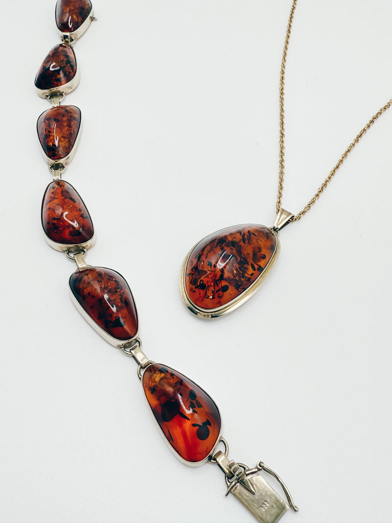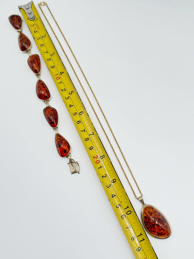 Vintage Baltic Amber Bracelet and Pendant Necklace Set in 333 8k Yellow Gold Natural Baltic Cognac Amber Jewelry