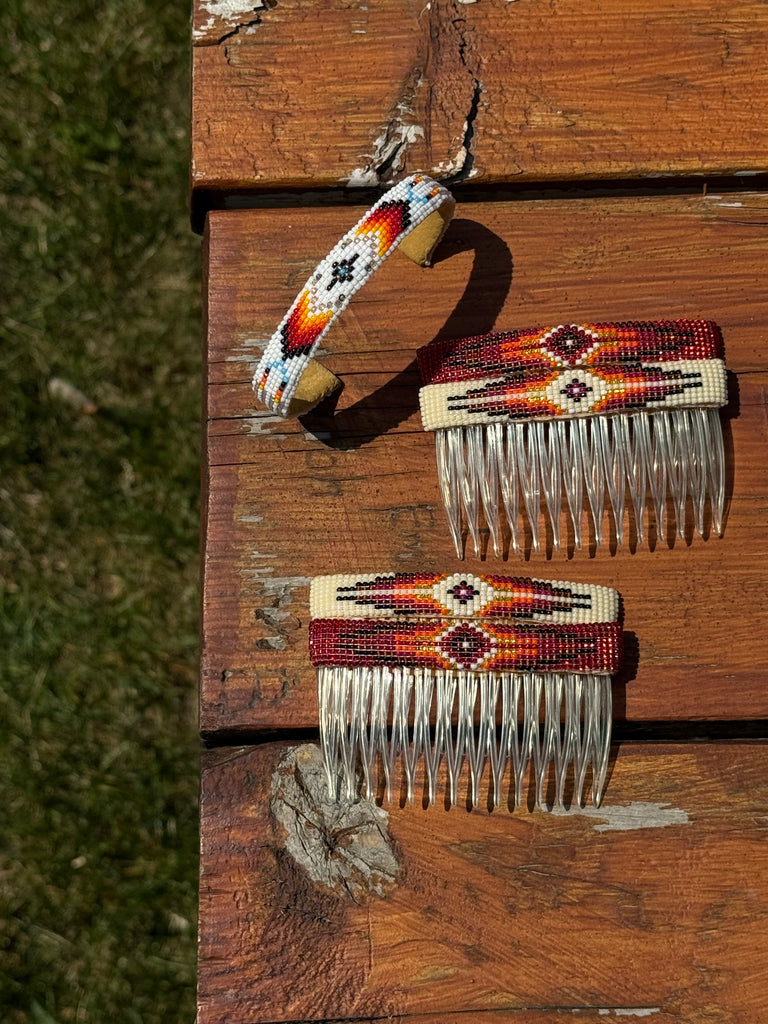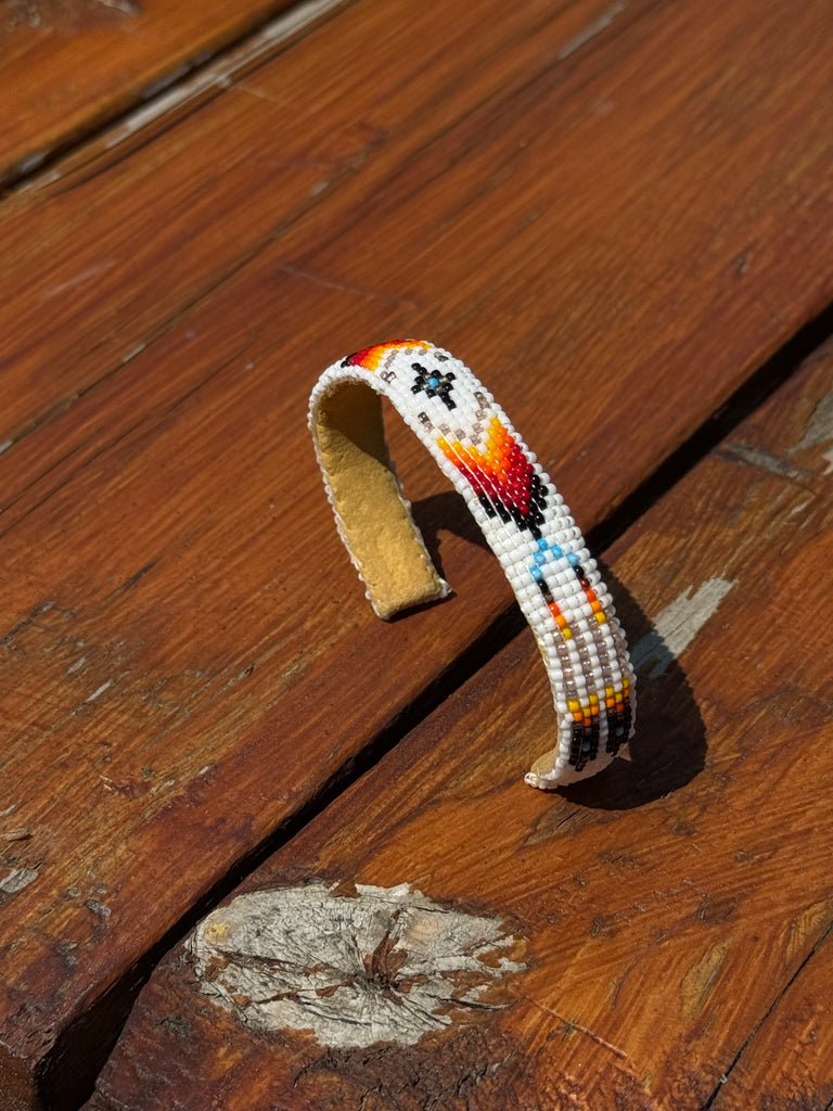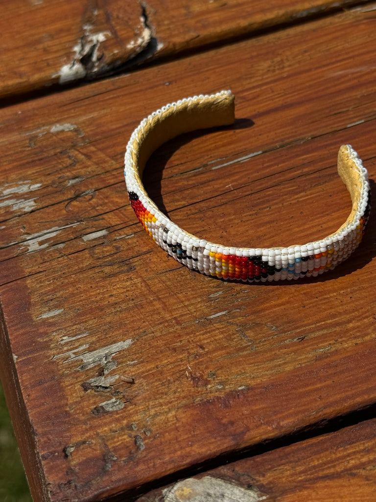 Handcrafted indigenous beaded cuff bracelet. Beautiful glass beads, in a traditional pattern. Cuff can be adjusted to fit most.