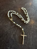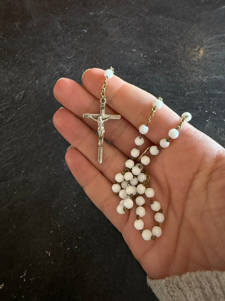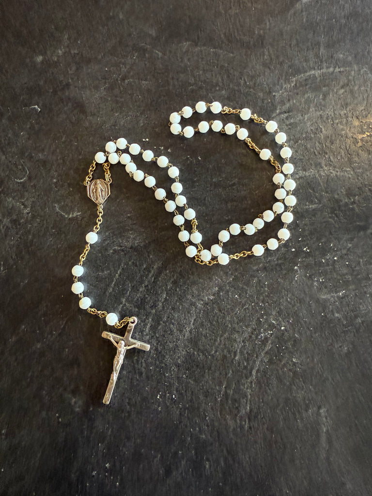 Beautiful vintage, white beaded rosary with silver cross and accents. White glass beads beads. Measures 14.5”.