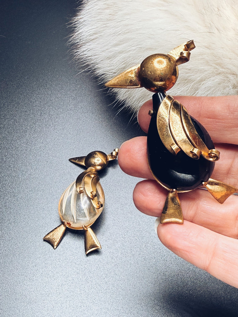 Just out for a stroll, two Art Deco penguin brooches. Whimsical, and fun, these two birds have incredible Art Deco style.