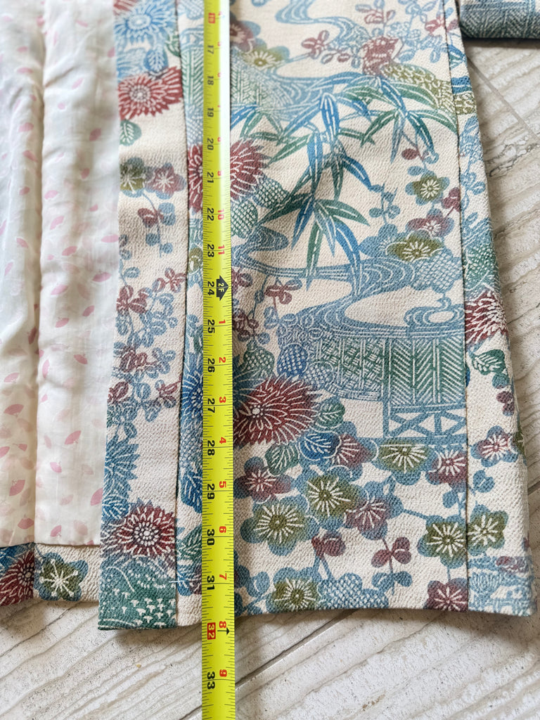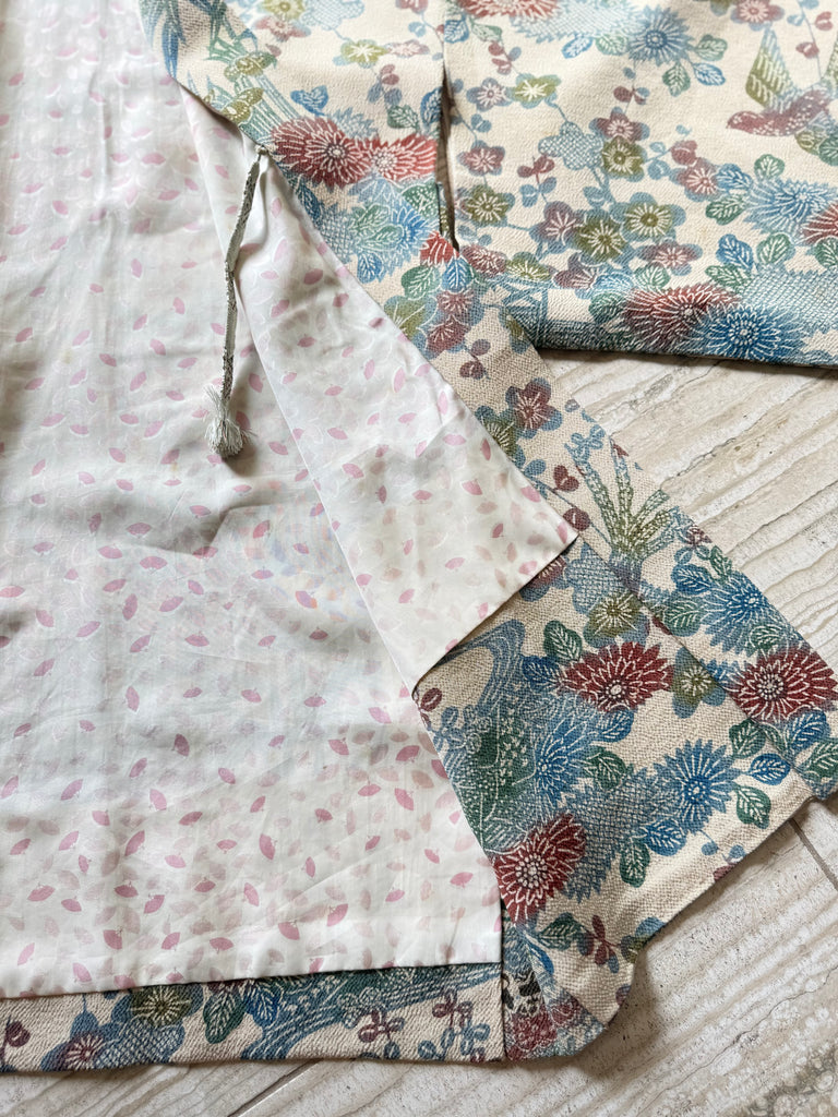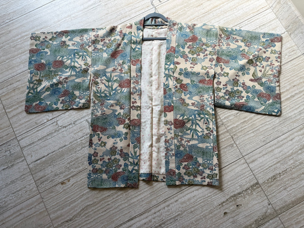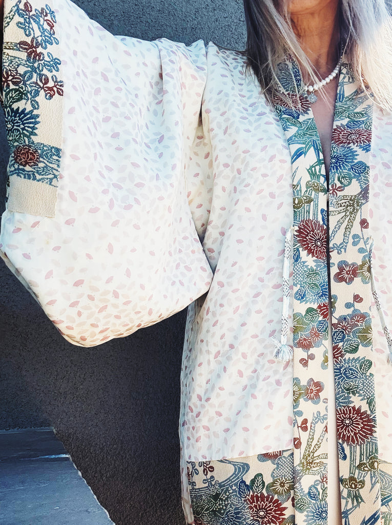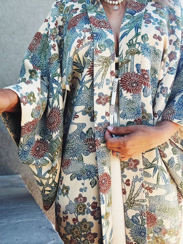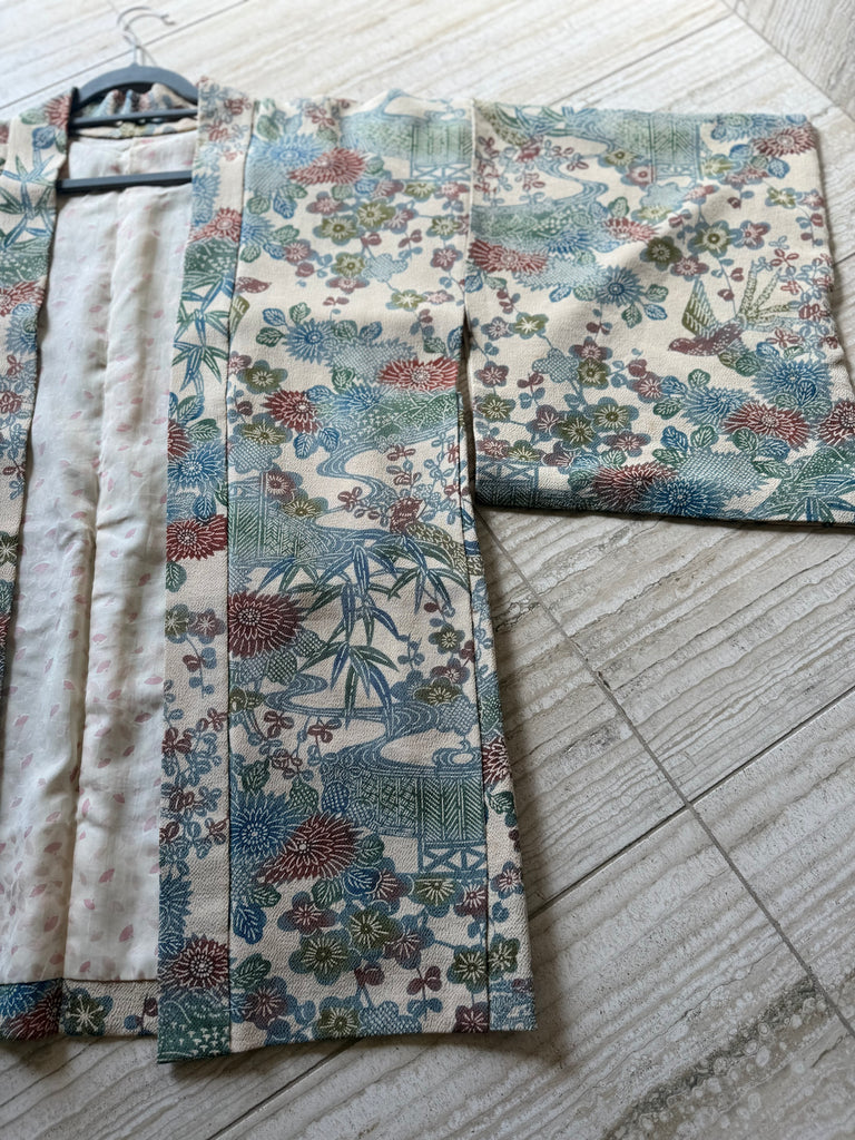This is absolutely gorgeous! Vintage silk Japanese kimono. Beautiful floral pattern, reversible, made in Japan. Looks fantastic over your favourite jeans, a dress or dress pants. Fits most. How are you going to style it?