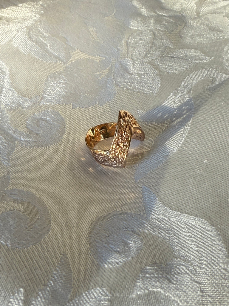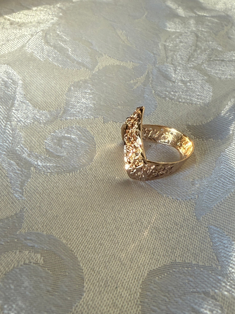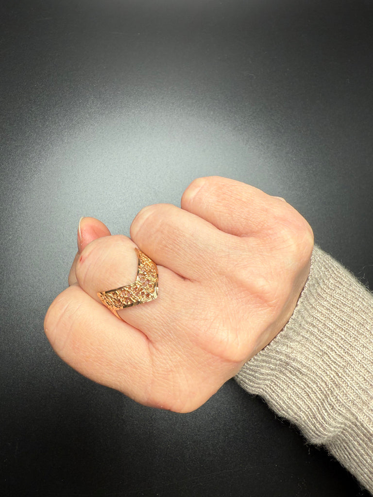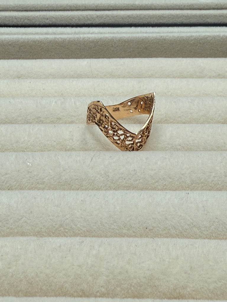 Elegant 10k yellow gold ring featuring a refined V-shaped filigree design. Lightweight, polished, and perfect for everyday wear or stacking. A timeless piece suited for minimalist style lovers and vintage-inspired collections. Size 9. Approximately 2.8grams
