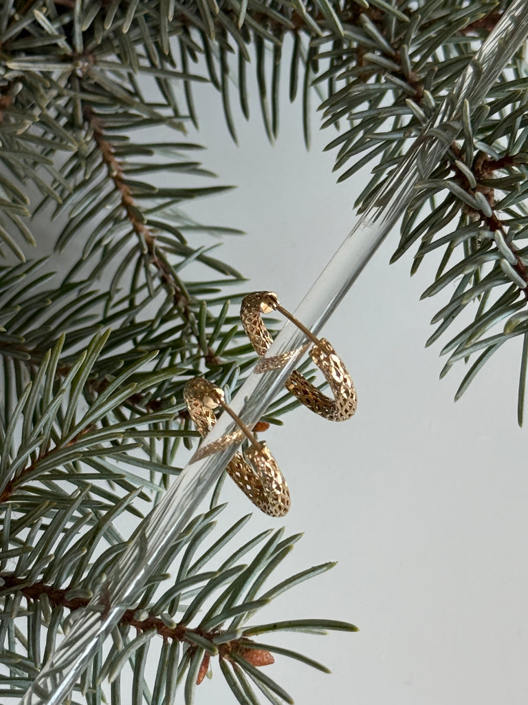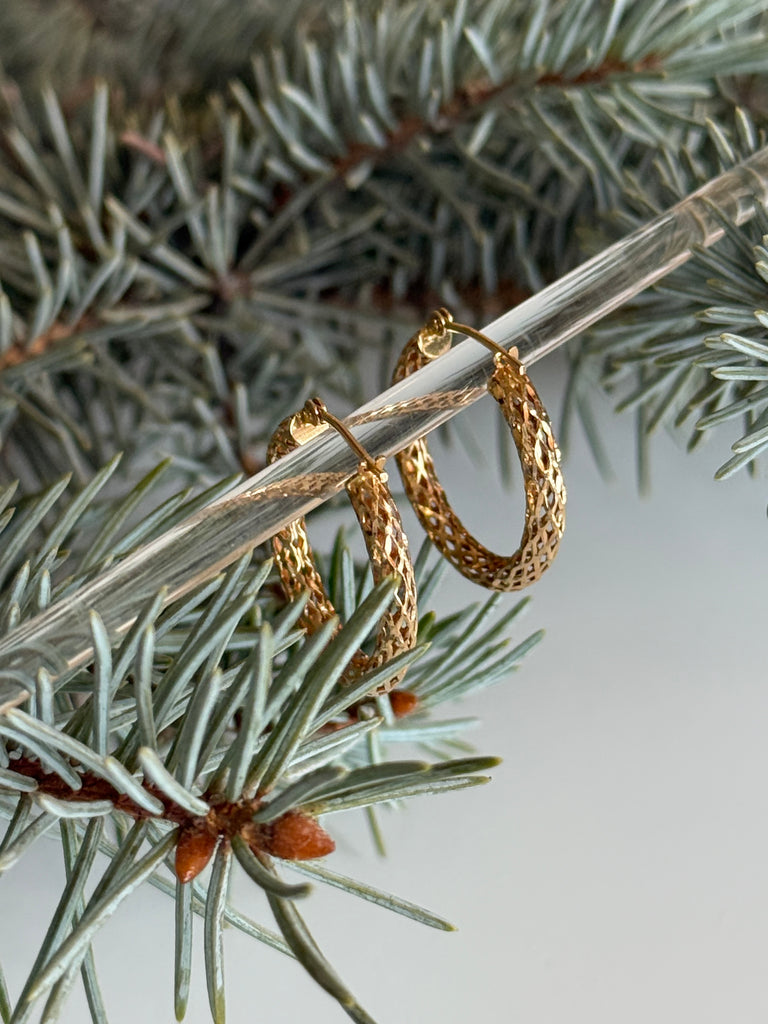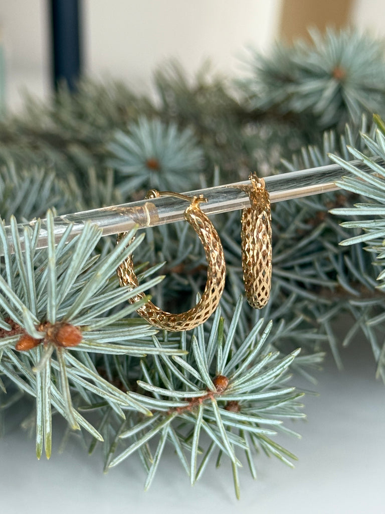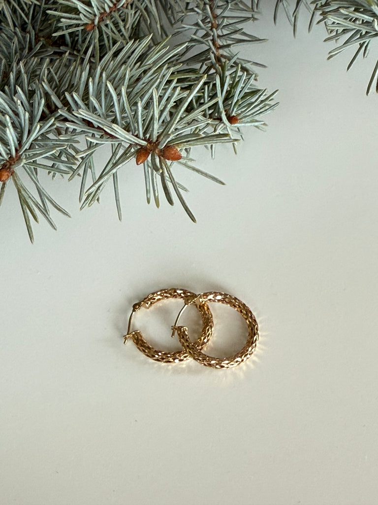 Elevate your everyday style with these stunning vintage 14K yellow gold hoop earrings. Crafted with a beautiful diamond-cut lattice texture, these hoops catch the light from every angle, giving them a rich, dimensional sparkle that feels both timeless and modern.