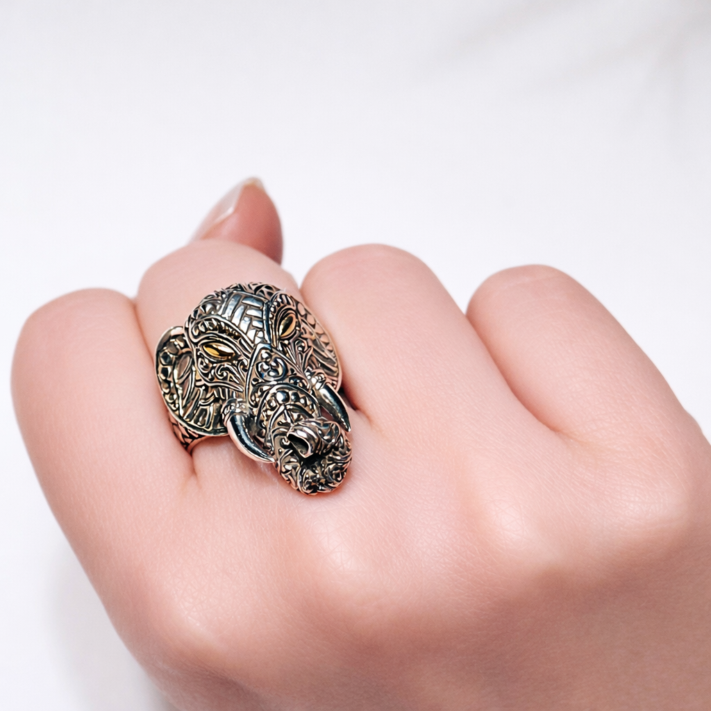 Elevate your collection with this beautifully crafted Samuel B. Behnam elephant ring, made from solid .925 sterling silver and finished with 18K yellow gold accents.