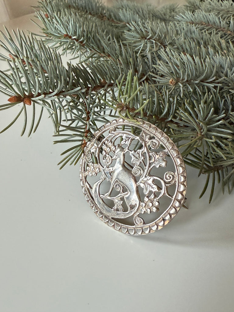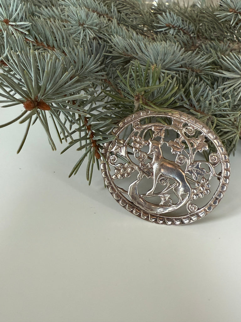 This stunning vintage sterling silver brooch features an exquisitely detailed woodland creature surrounded by curling vines, leaves, and berries. Designed with an openwork style that feels both timeless and artistic, this piece brings together nature, craftsmanship, and elegant vintage charm.