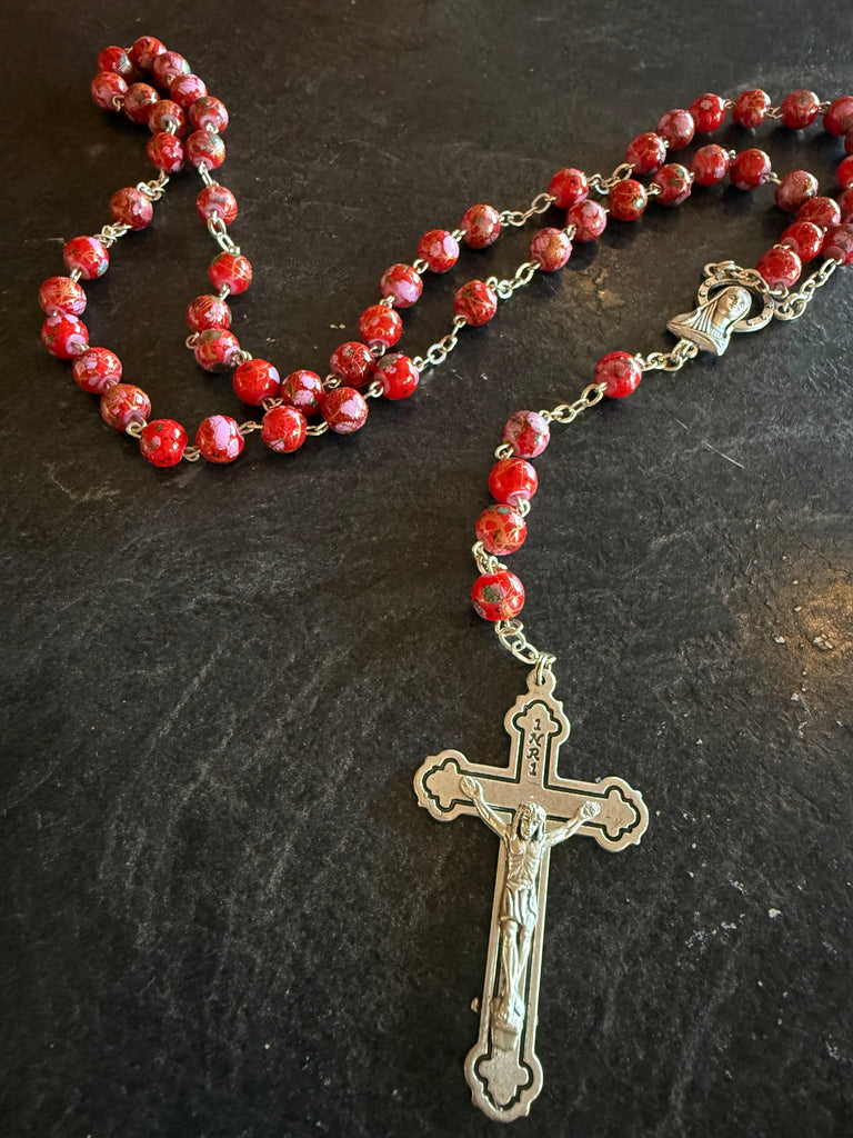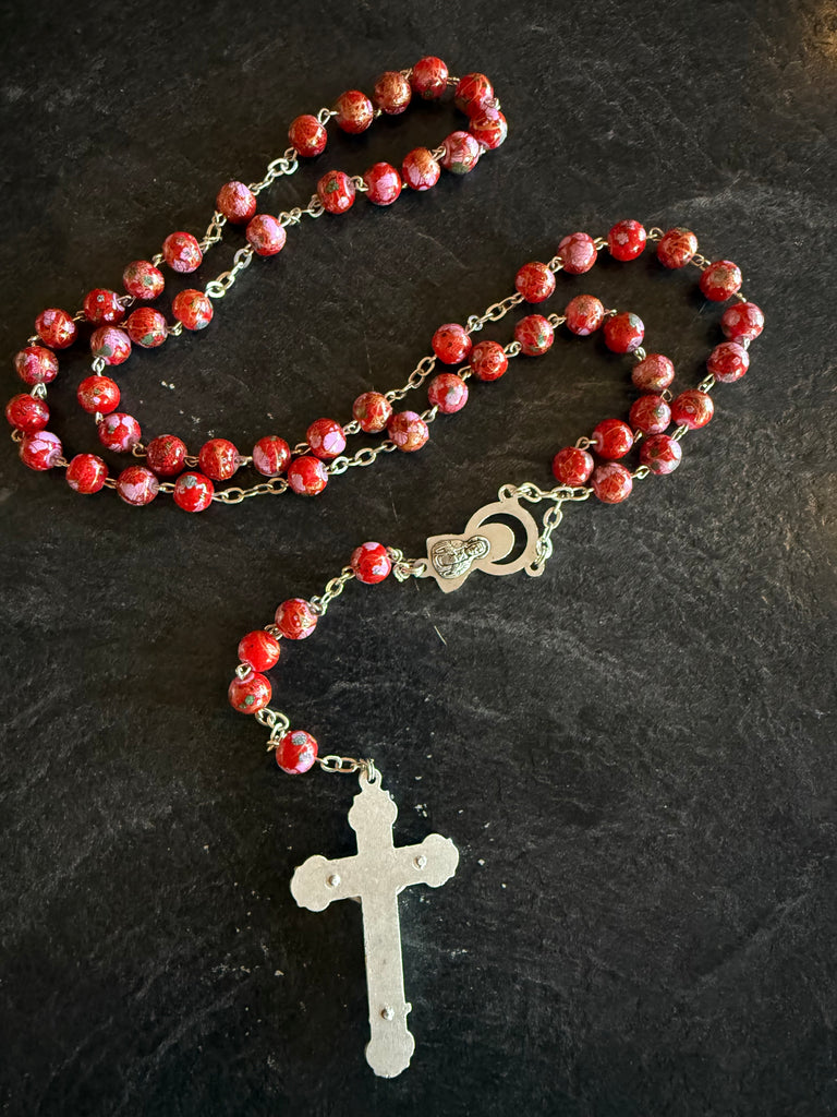 Vintage Rosary with red mosaic beads in the prettiest colours. Meaningful, thoughtful and beautifully vintage! Measures 19”