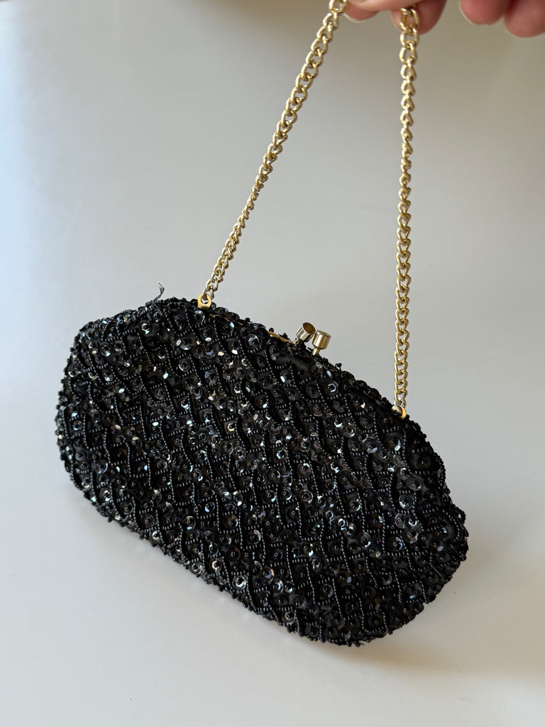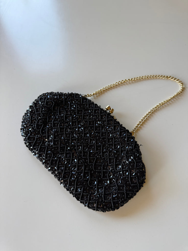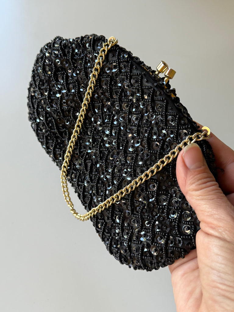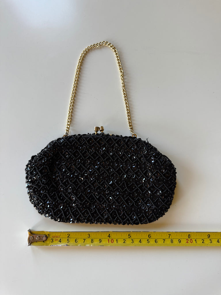 Beautiful hand beaded purse with a gold chain handle, perfect for an evening out. The perfect size carry all the essentials. Made in Hong Kong.