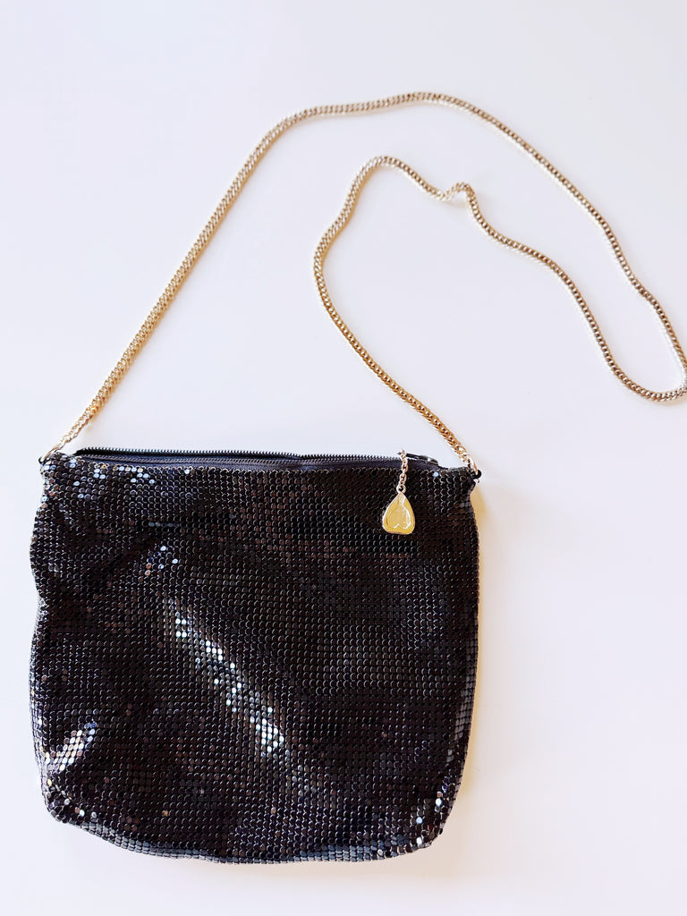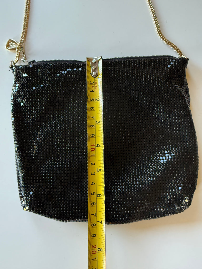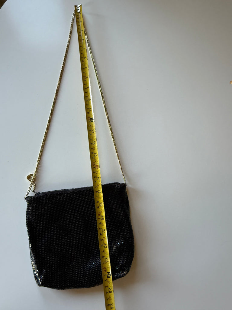 Crafted in the brand’s signature metal mesh, this sleek black evening bag shimmers beautifully under the light and features a delicate gold-tone chain strap for effortless sophistication. The interior is lined and perfectly sized for essentials — lipstick, keys, and cards — making it the perfect companion for a night out, special event, or formal occasion.