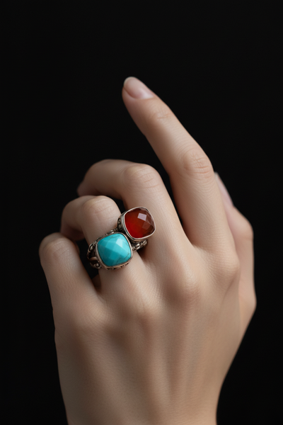 Sterling Silver Carnelian & Turquoise Bypass Ring – Boho Statement Ring – Adjustable Wrap Ring – Bold Gemstone Ring – Gift for Her $95.00