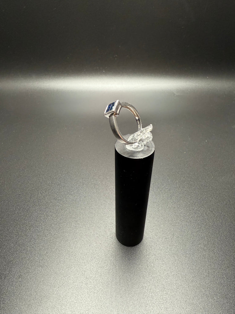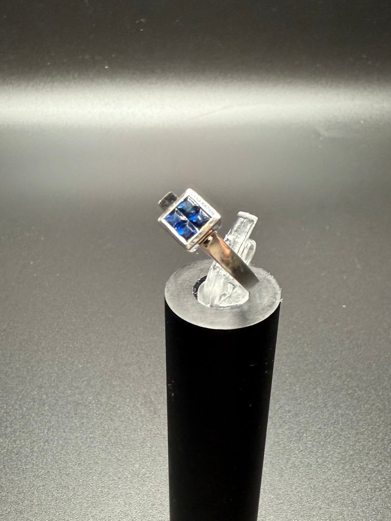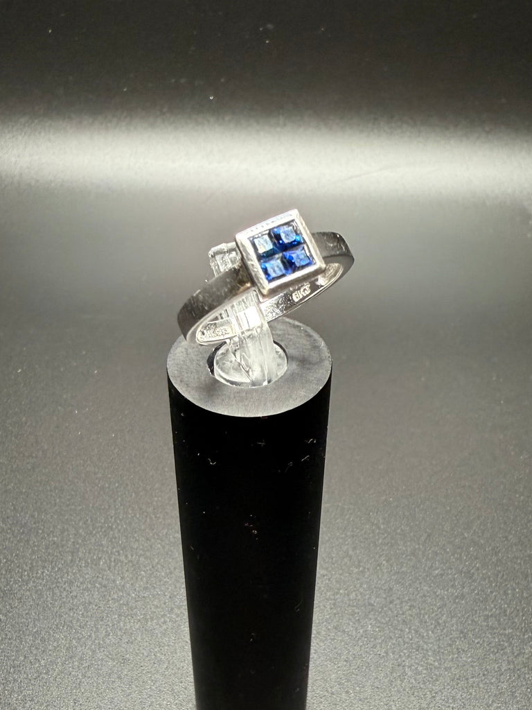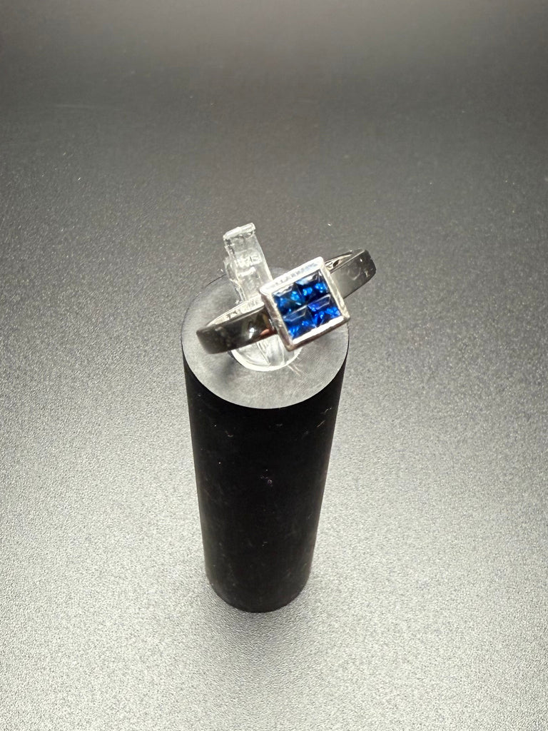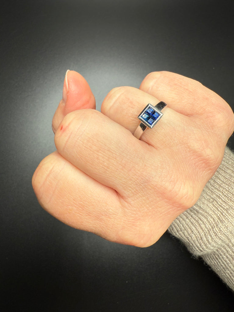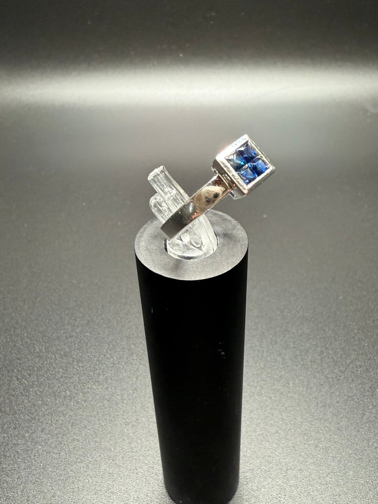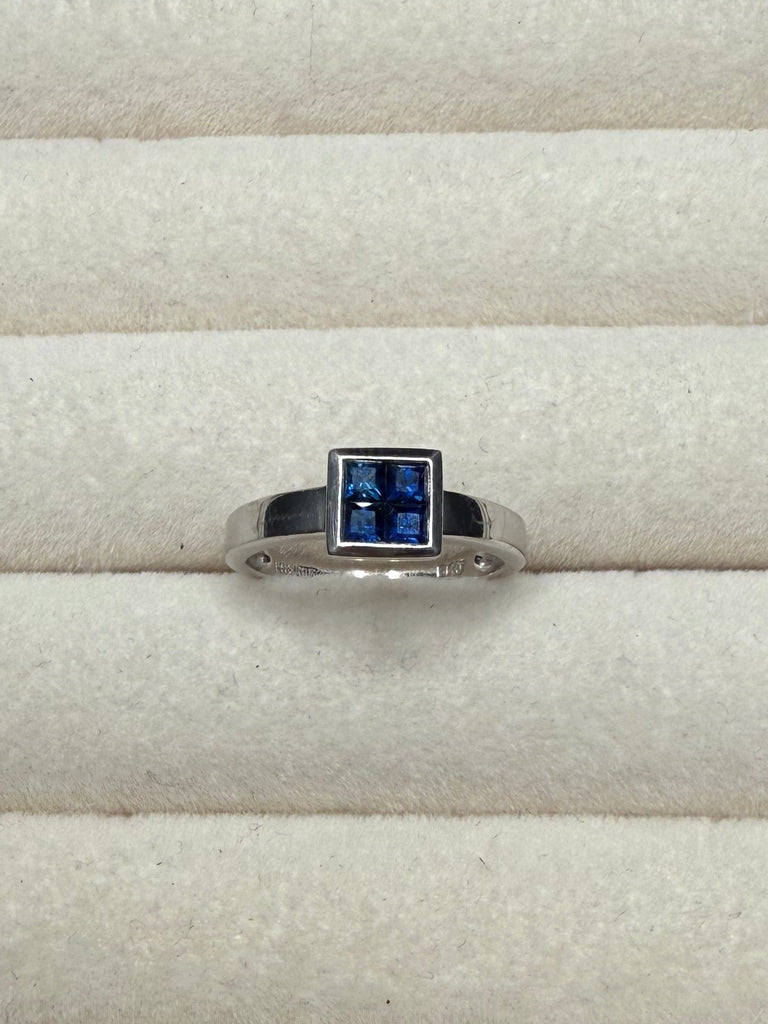 This stunning white gold ring features a striking square cluster of deep blue sapphires set in a sleek, modern setting. The clean lines and high-polish finish give this piece a refined, timeless look while allowing the rich blue stones to truly shine.