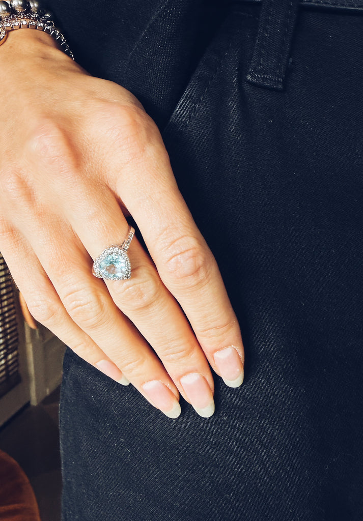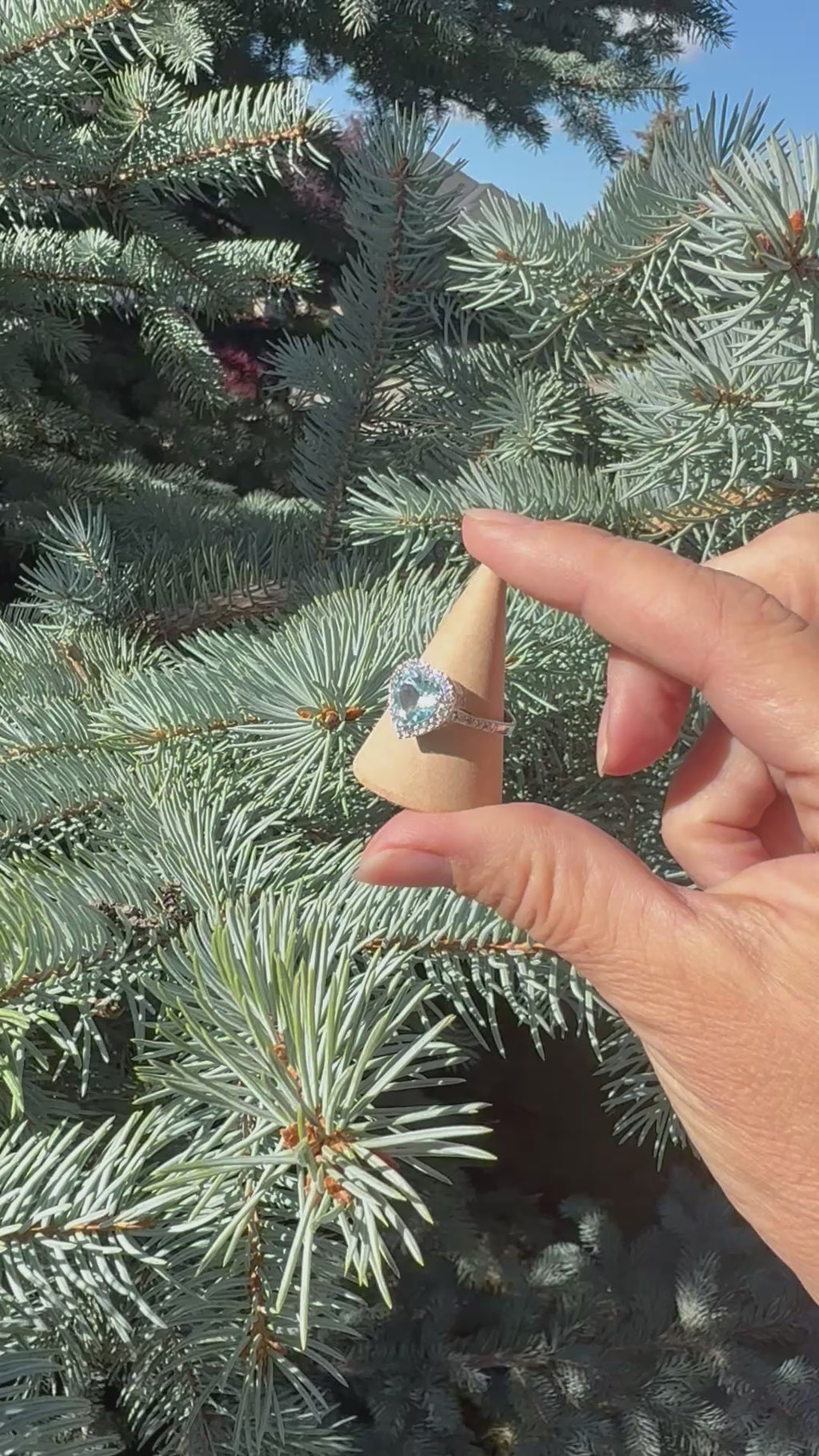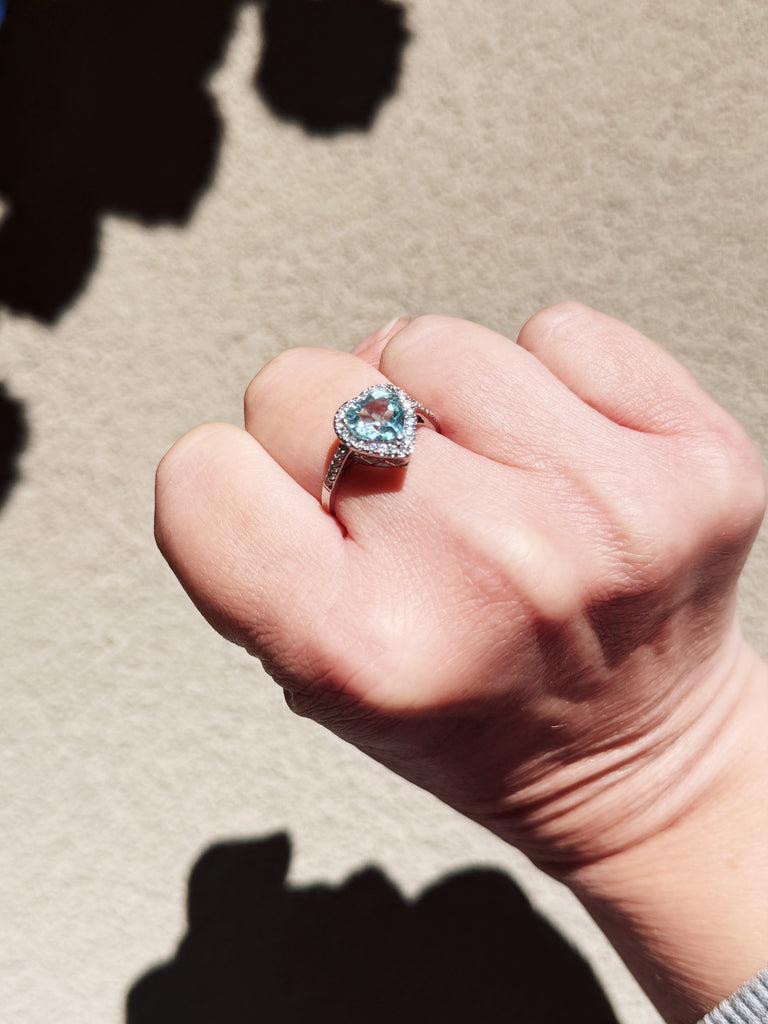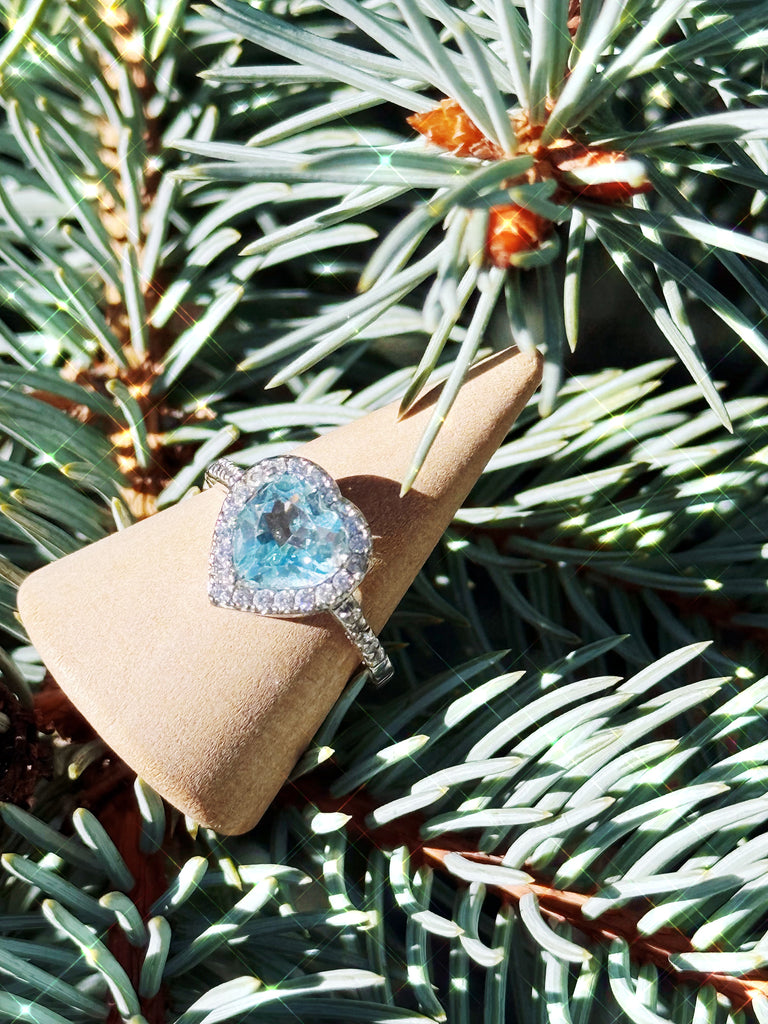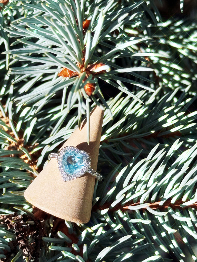 Romantic, unique and timeless lady’s 10k ring. This halo style 10k white gold ring features a brilliant cut heart shaped Blue Topaz, surrounded by 30 brilliant cut white sapphires. This ring comes with a current certificate of appraisal. Valued at $1500. Size 7.5.