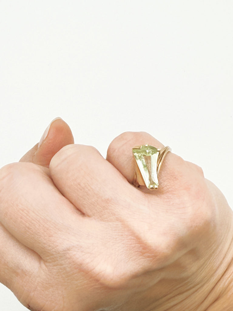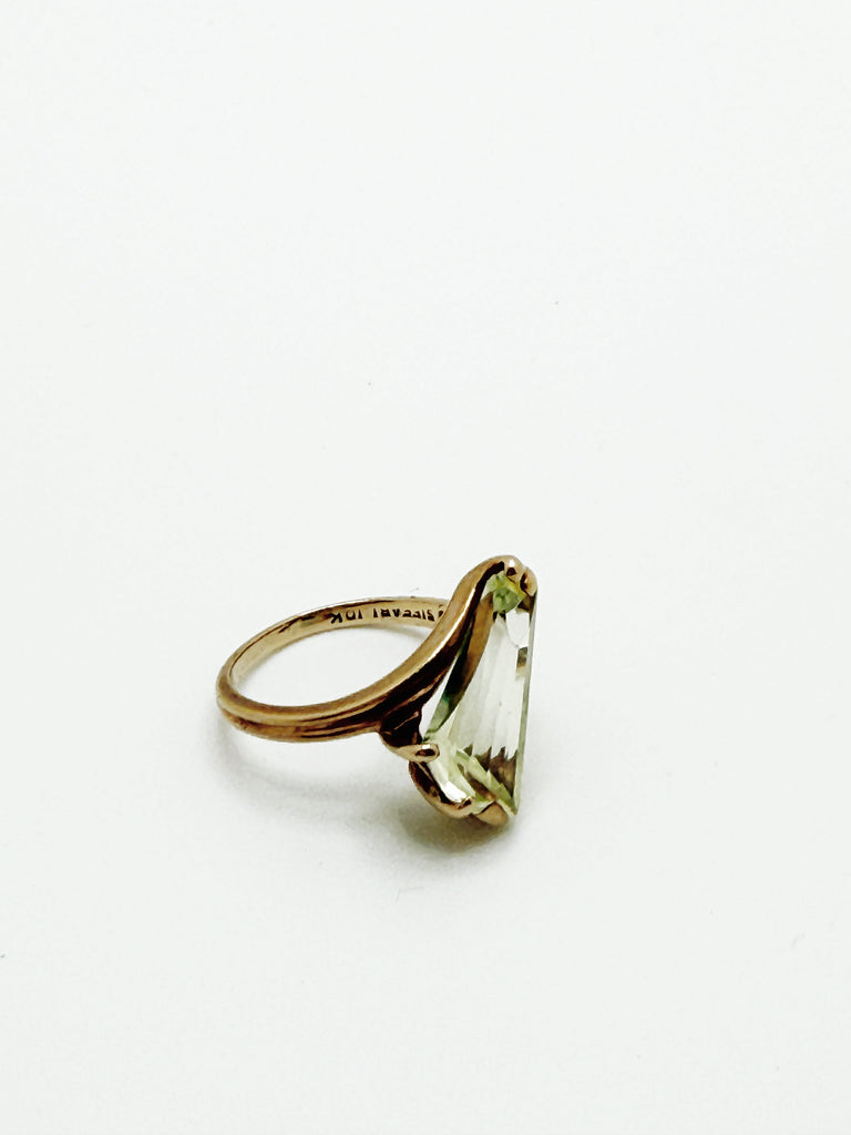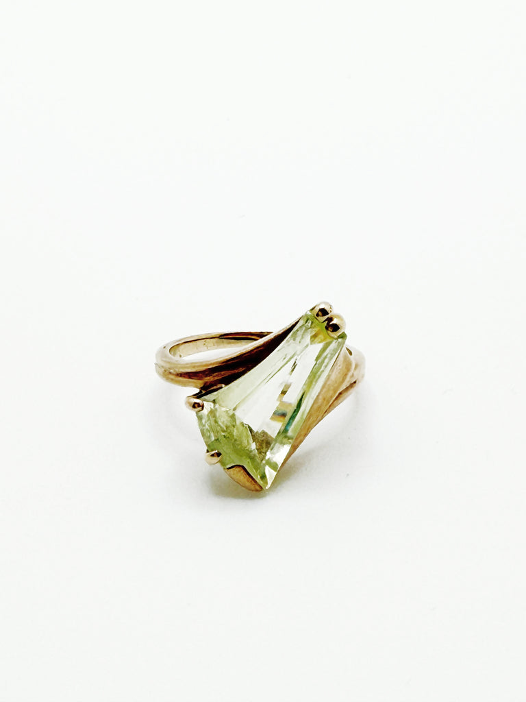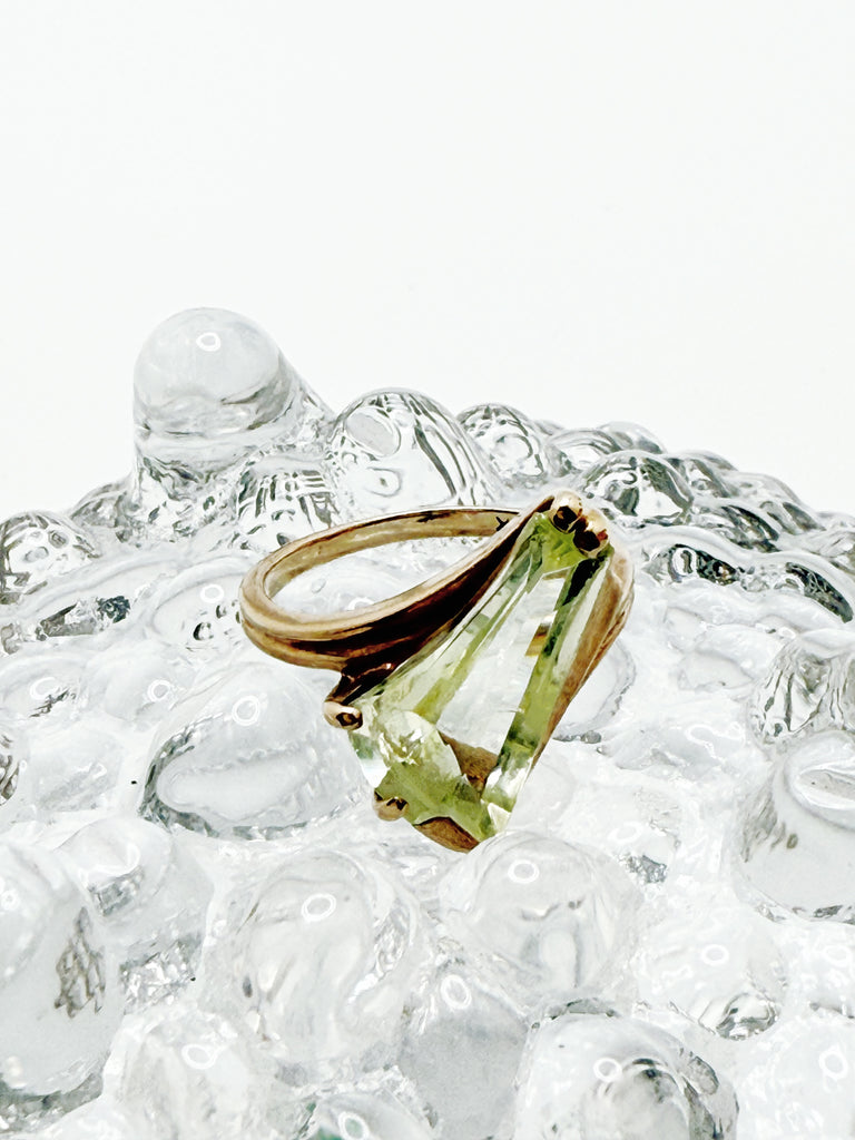 This elegant vintage statement ring is crafted in solid 10k yellow gold and showcases a striking elongated faceted green gemstone in a sculptural open-work setting. Full of timeless vintage charm, the design allows light to move beautifully through the stone, creating depth, sparkle, and visual interest from every angle. Size 5.5