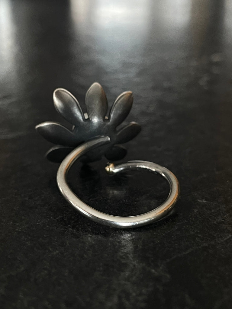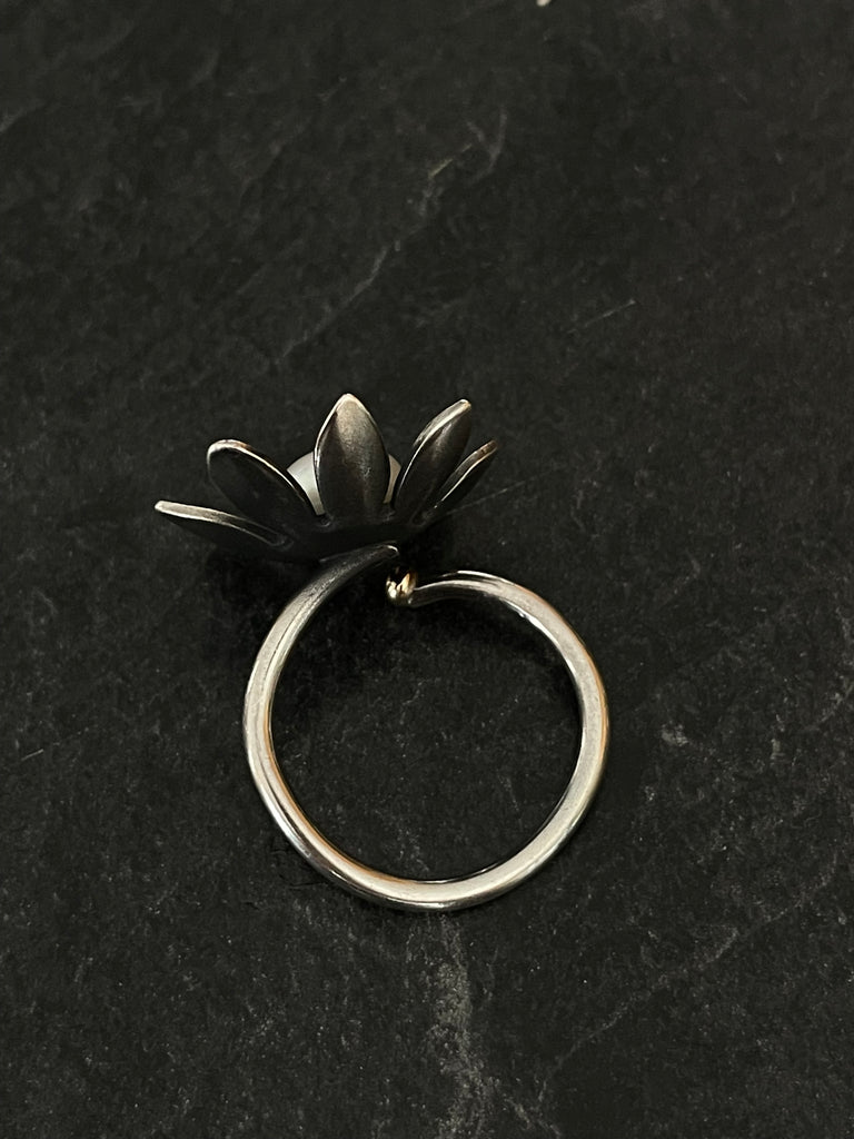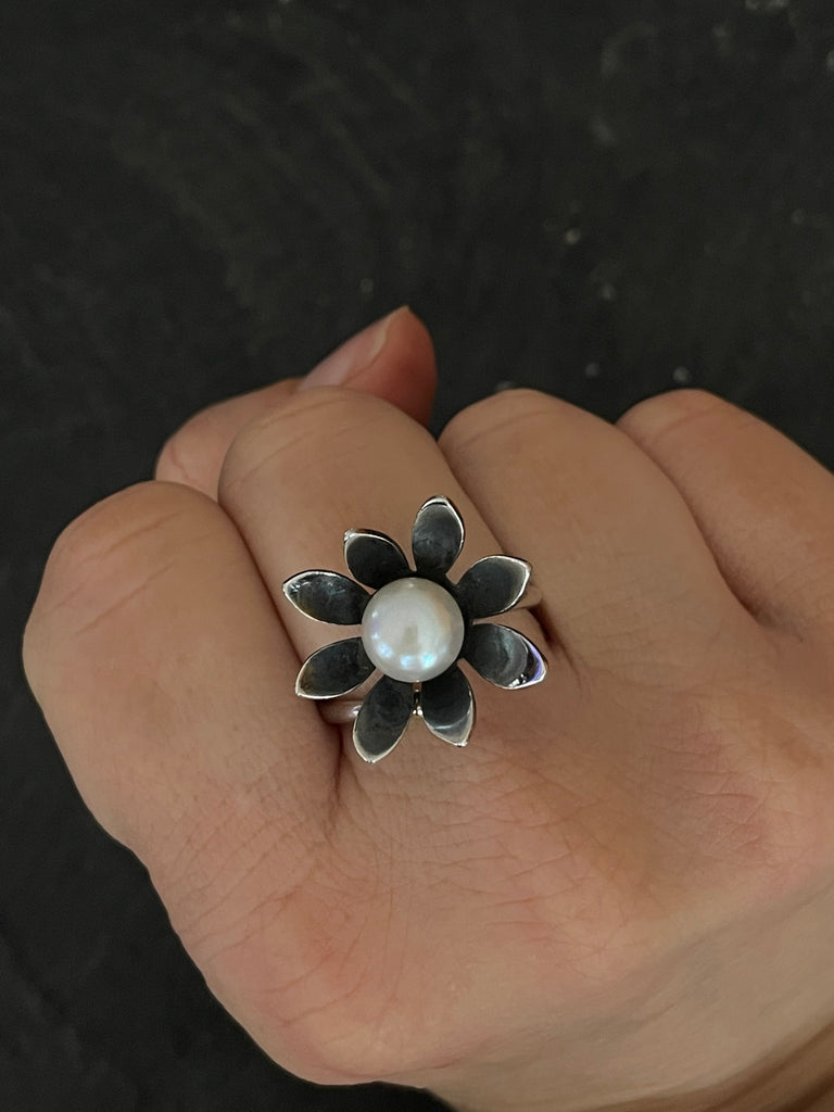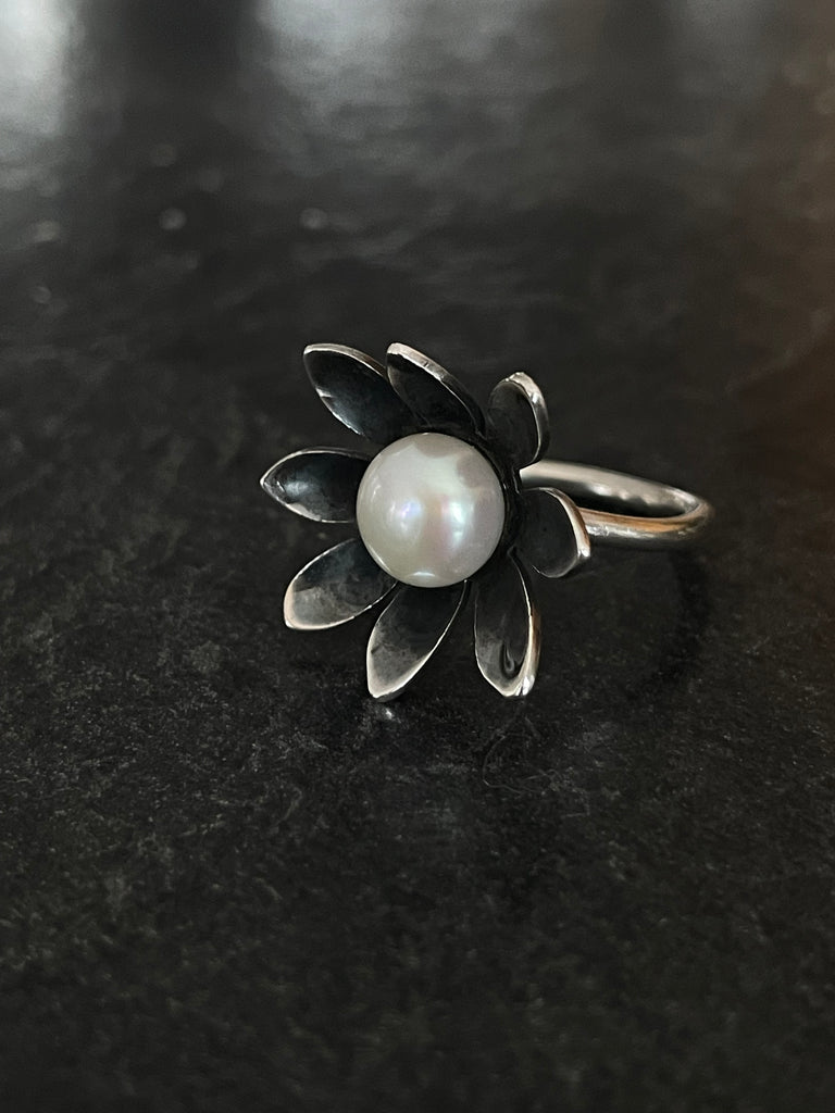 Gorgeous adjustable flower ring in silver with snow white pearl centre. So unique, beautifully made with exceptional attention to detail. This ring will make you smile every time you wear it.
