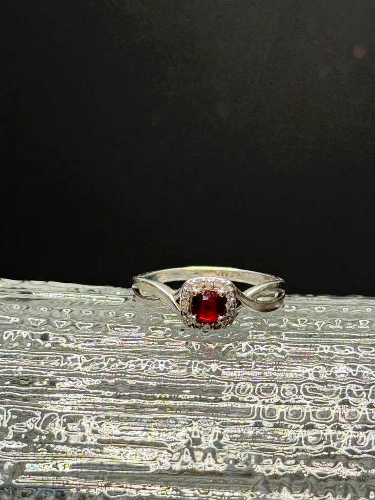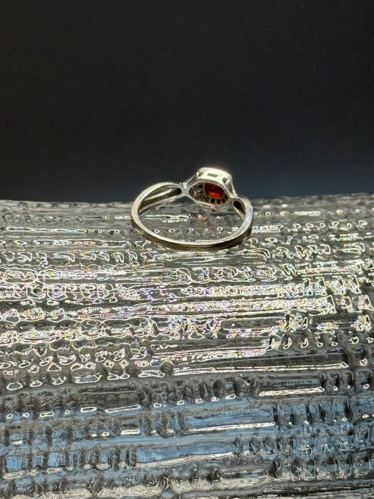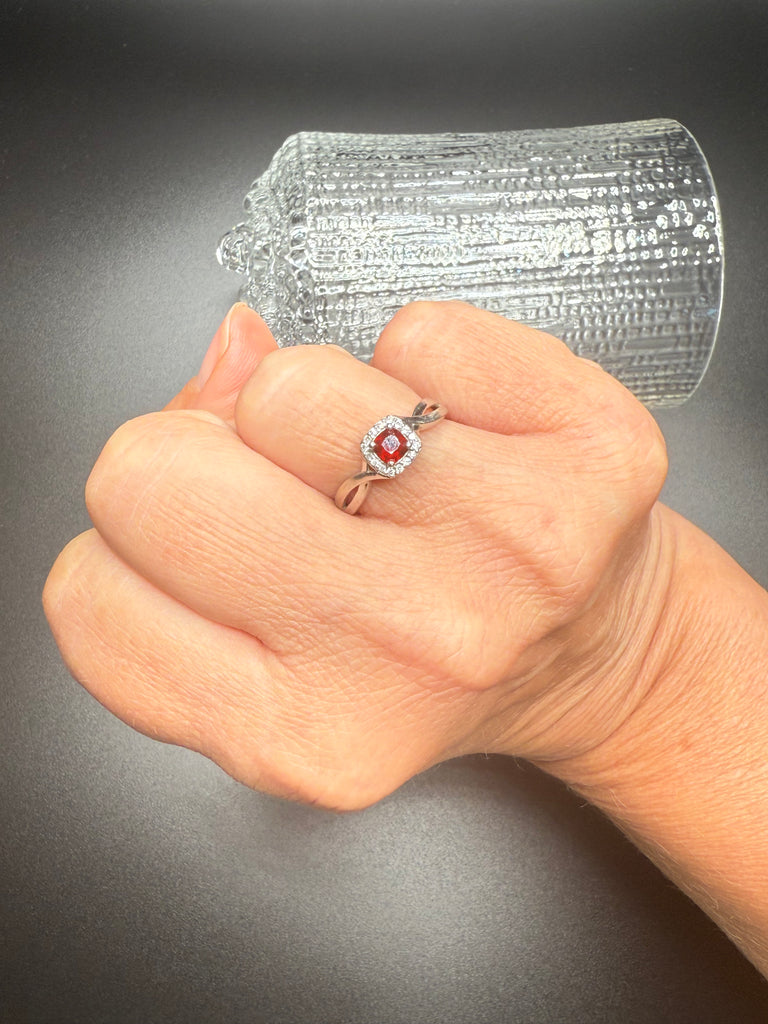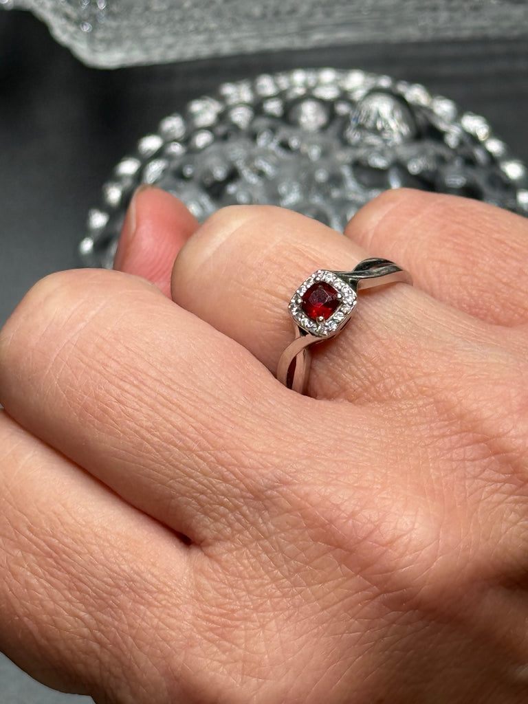 This ring is a stunning, and so unexpected. Brilliant square cut red garnet stone , surrounded by diamonds, set in 10k white gold. When the light catches this ring, it’s magical. Definitely one that you will love for a life time. Size 6.5.