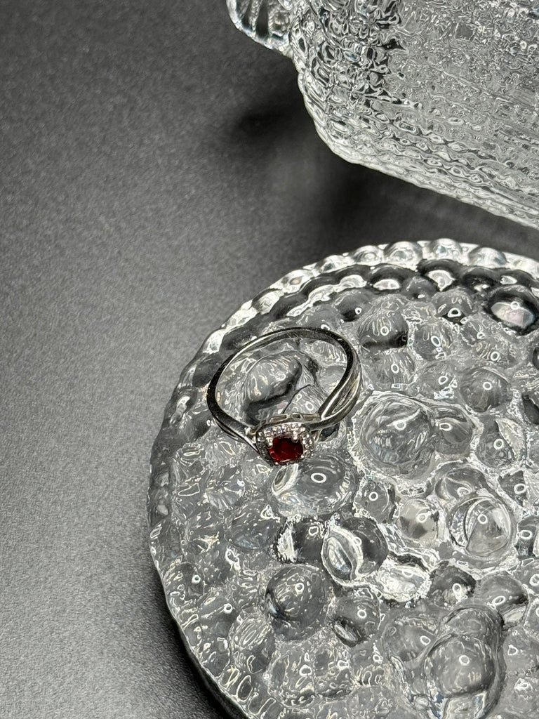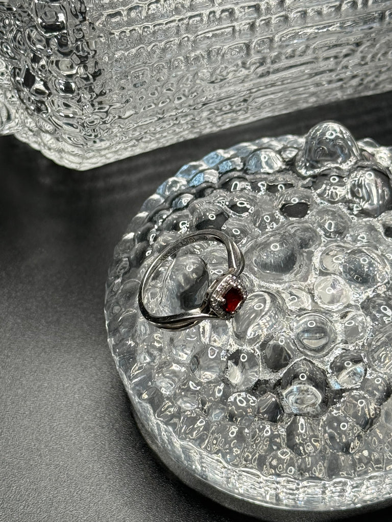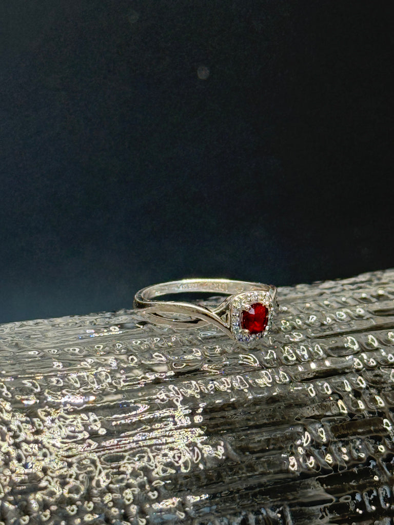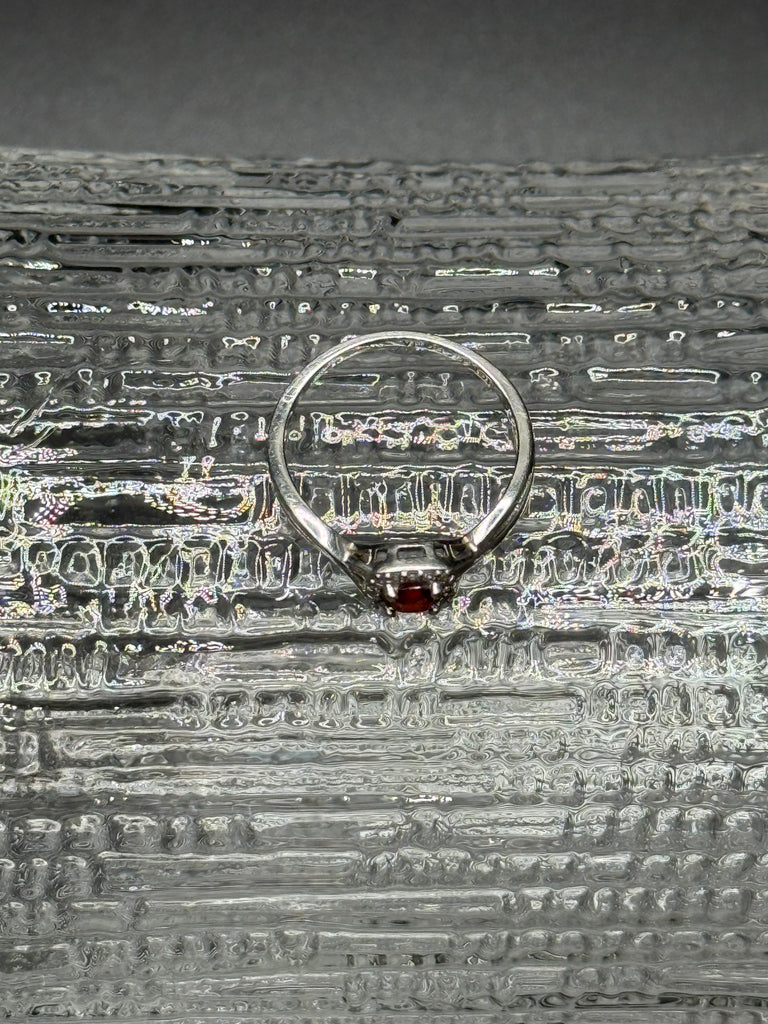 This ring is a stunning, and so unexpected. Brilliant square cut red garnet stone , surrounded by diamonds, set in 10k white gold. When the light catches this ring, it’s magical. Definitely one that you will love for a life time. Size 6.5.