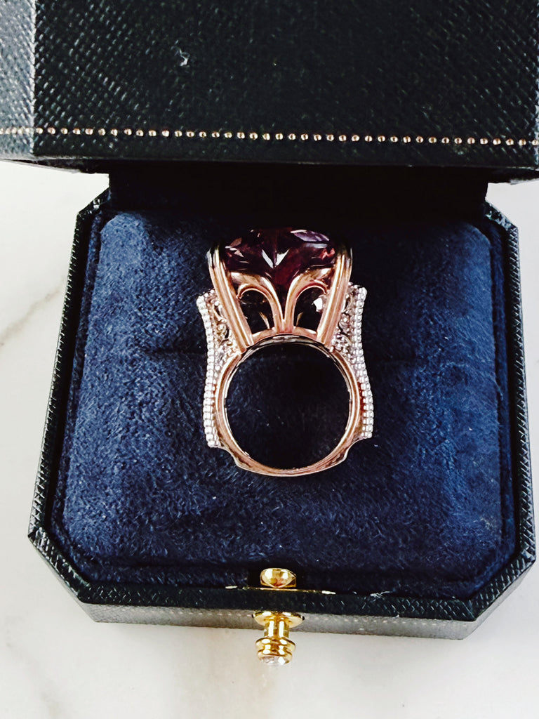 Huge heart shaped statement ring in 925 silver. Gorgeous faceted purple stone, set in an outstanding ornate setting. This ring will definitely turn some heads! Measures size 7 approximately.