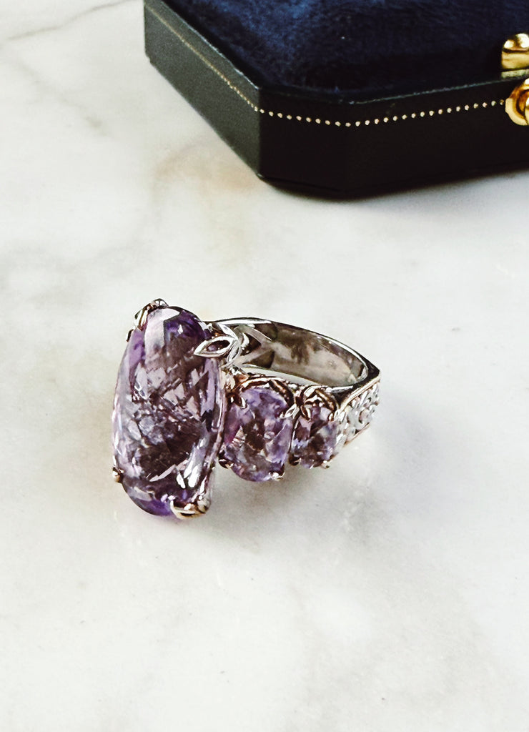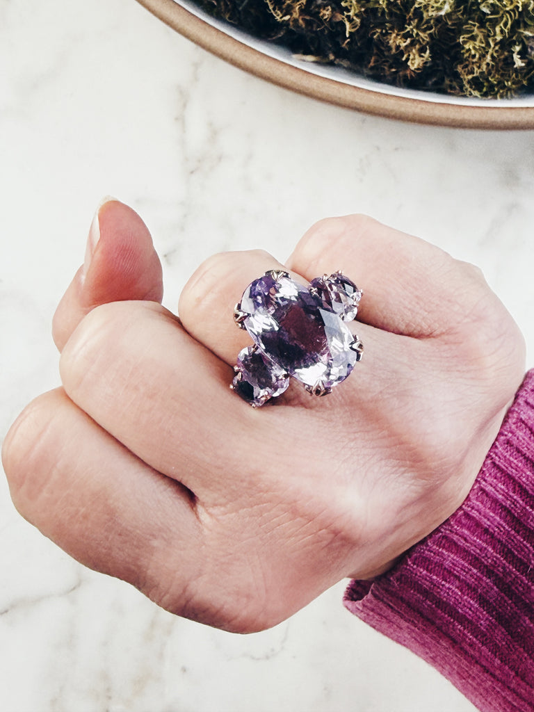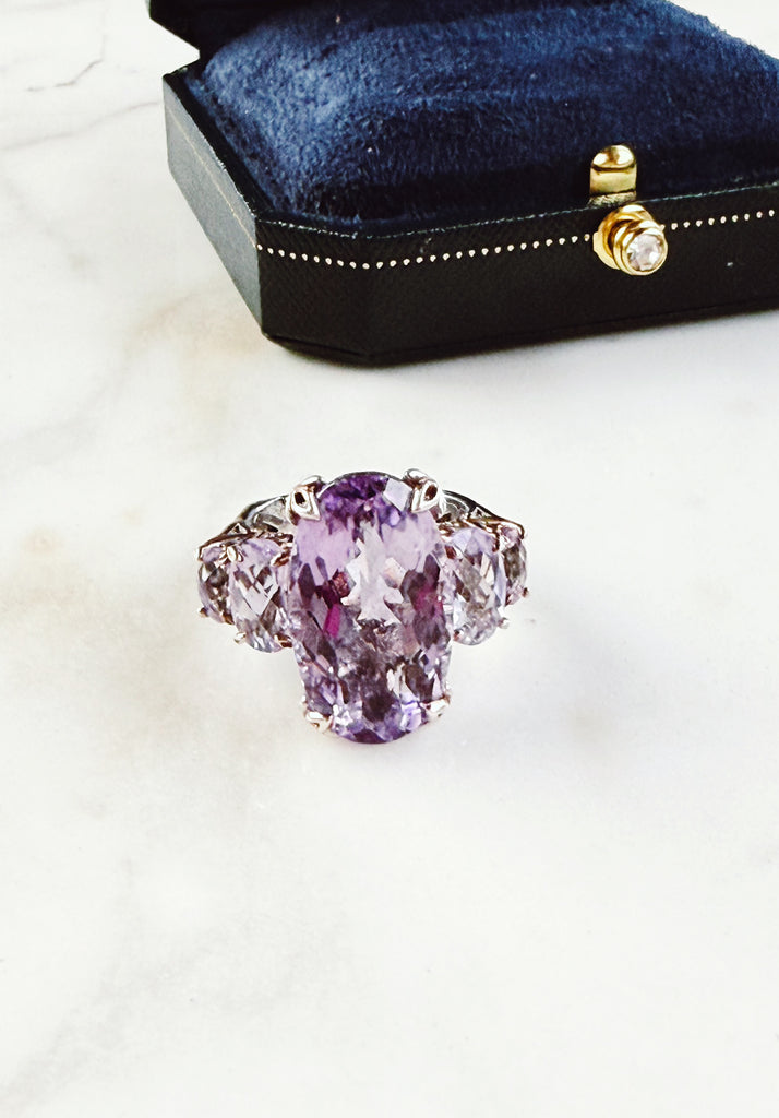 Turn heads with this breathtaking amethyst statement ring, in gleaming palladium-silver and set with 3 dazzling purple gemstones. This luxurious cocktail ring is perfect for jewelry lovers who love bold sparkle, timeless glamour, and one-of-a-kind pieces.
