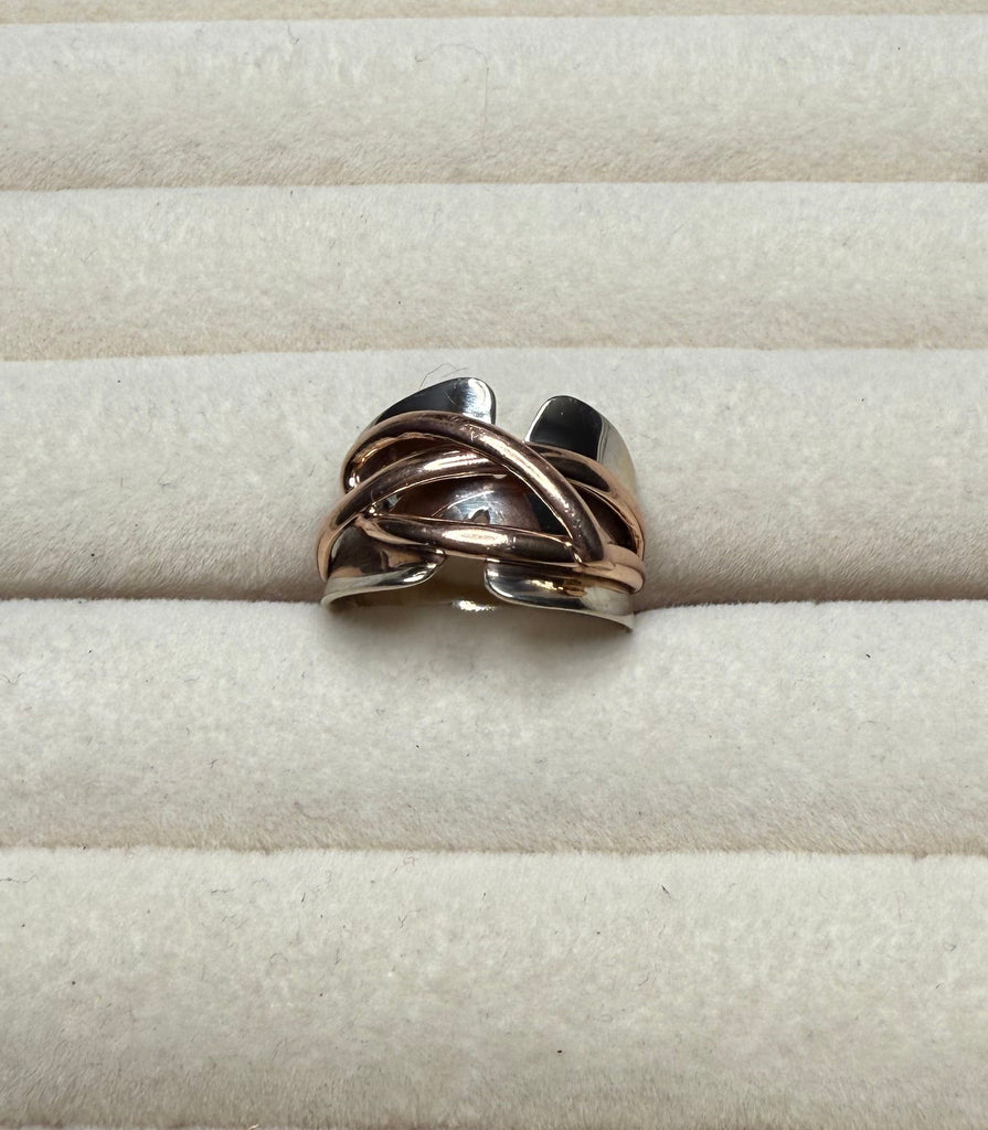 Hand-crafted with a sculptural, intertwined band, this ring blends modern artistry with timeless luxury. The open-back design offers a comfortable, slightly adjustable fit, making it an ideal gift or self-treat.