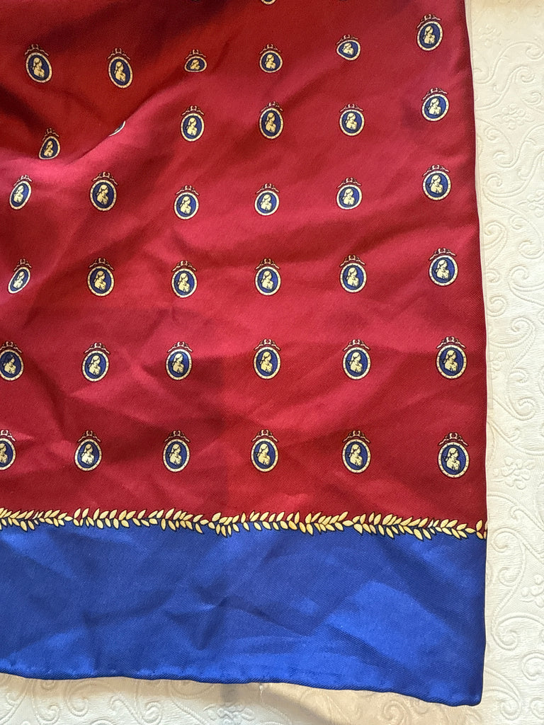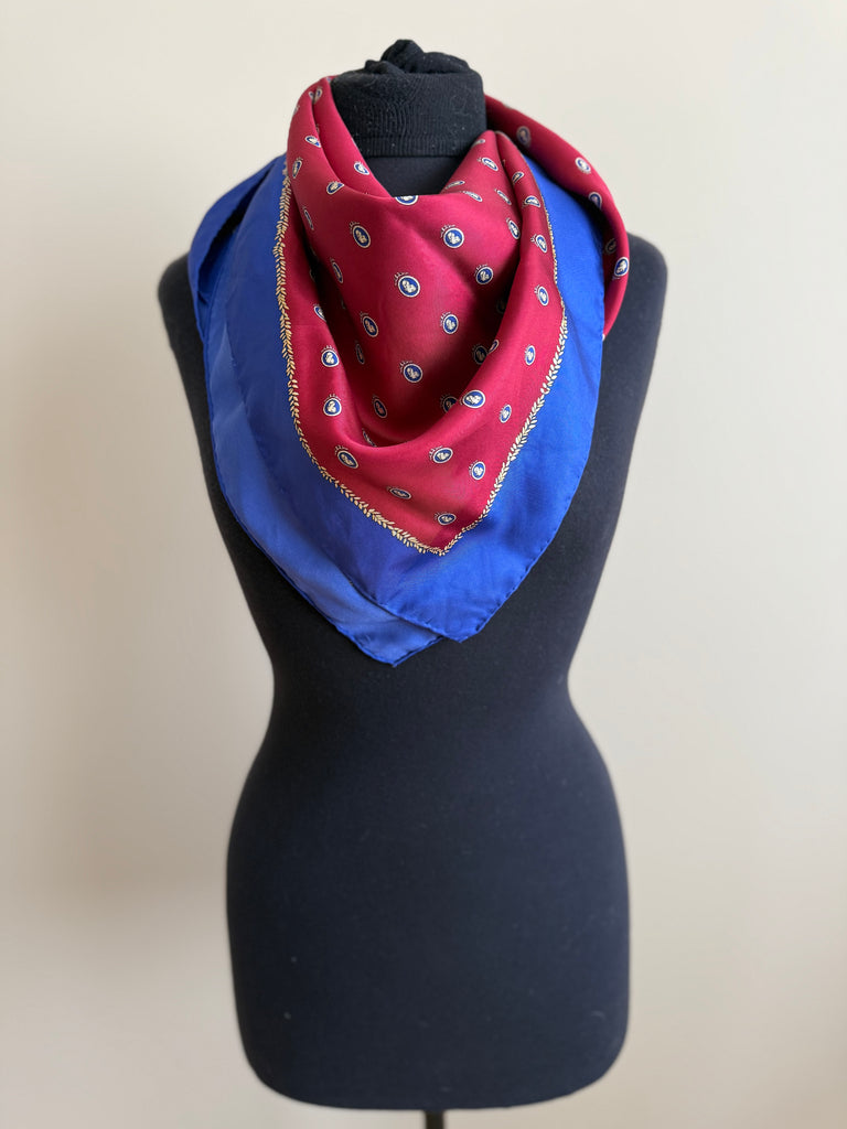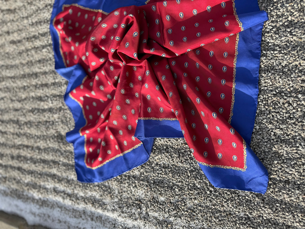 Vintage silk scarf by designer Adam Smith. 100% silk with hand rolled edges. This luxurious scarf Measures 35” square, making it perfect for styling in a multitude of ways. Timeless pattern, classic colour combination, a great addition to any wardrobe.