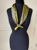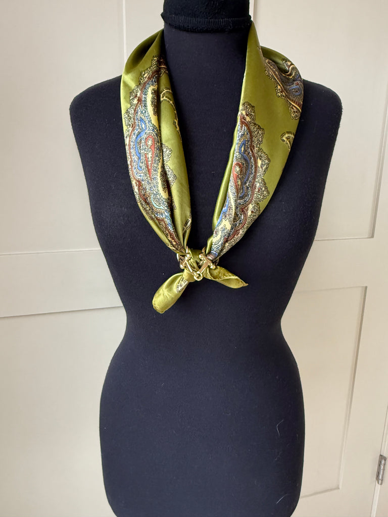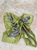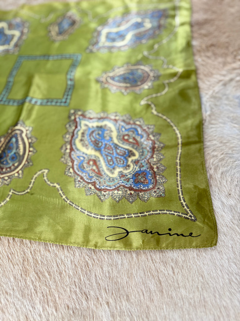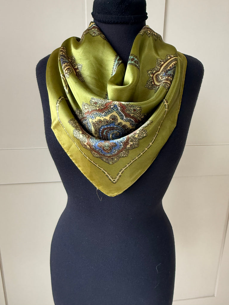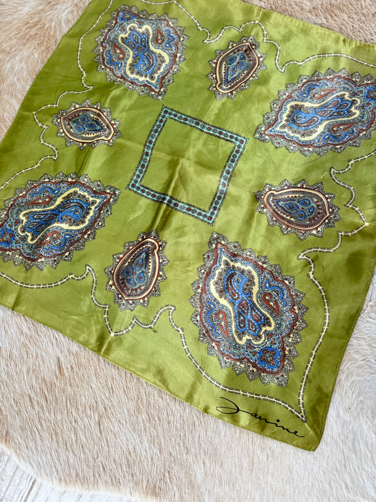 Gorgeous green satin scarf with paisley design. This green has so much shimmer and such vintage charm. Measures 26” square, perfect for styling and wearing in a multitude of ways.