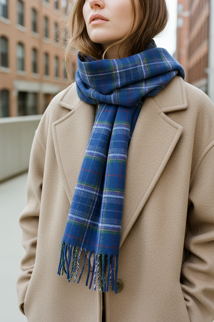 The traditional tartan pattern blends rich blue with green, white, and subtle red accents—timeless, versatile, and easy to style. Soft, warm, and breathable, this scarf is perfect for cooler weather and layering with coats or knitwear.