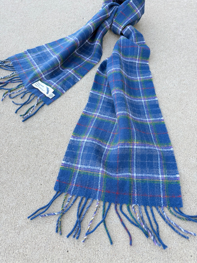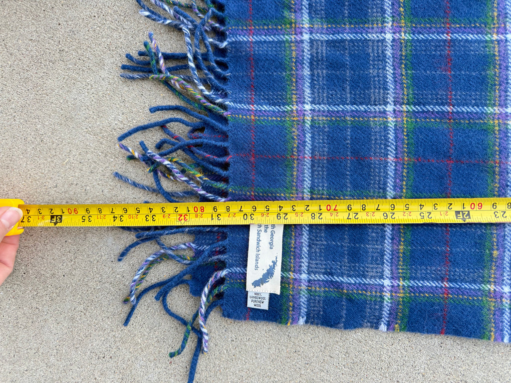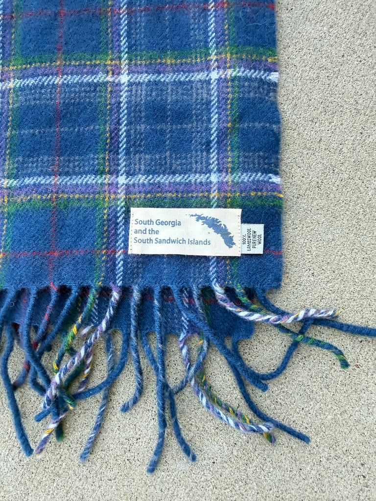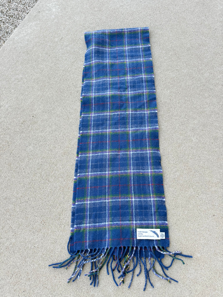 Beautiful 100% pure new wool tartan scarf in a classic blue plaid, featuring a unique South Georgia and the South Sandwich Islands label. This scarf is new and unworn, with no signs of use, making it an excellent find for collectors or everyday wear.