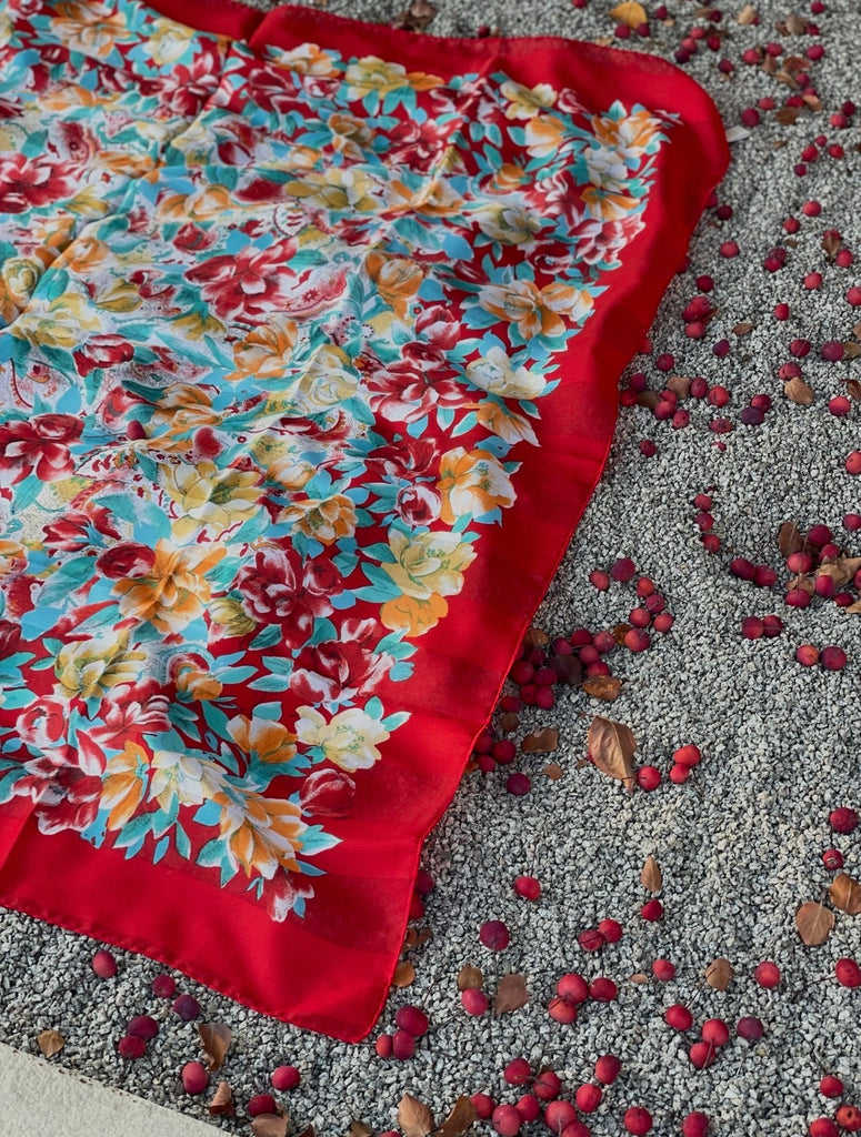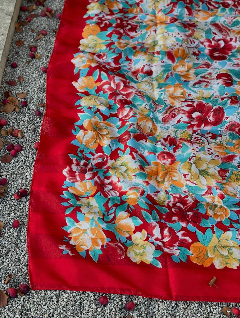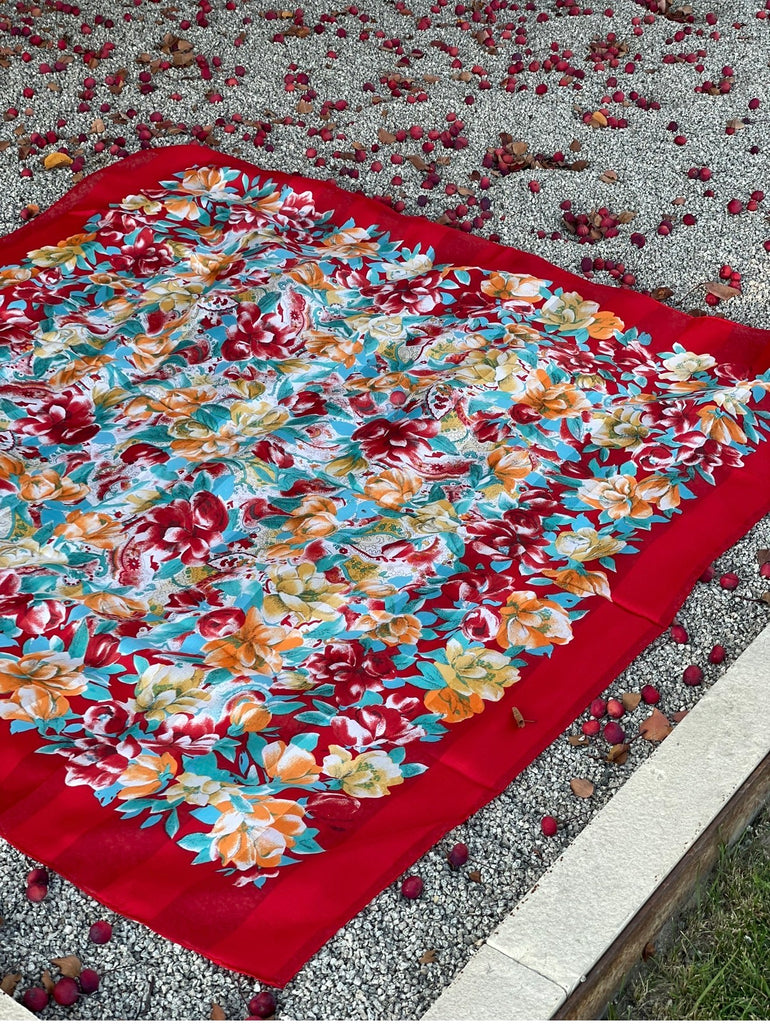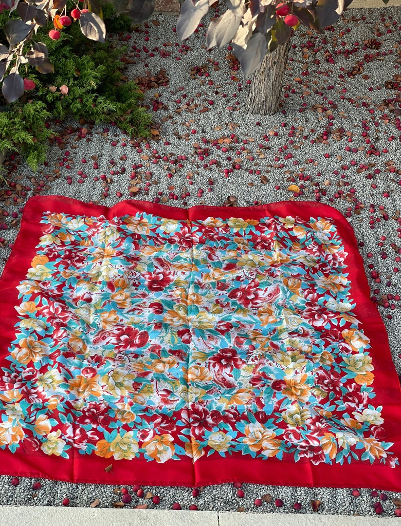 Beautiful vintage floral scarf featuring a rich red border and an all-over botanical print in warm tones of red, teal, gold, and soft green. This piece has a classic, romantic feel and adds effortless charm to any outfit — whether worn as a neck scarf, hair scarf, handbag accessory, or light wrap.