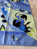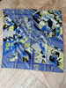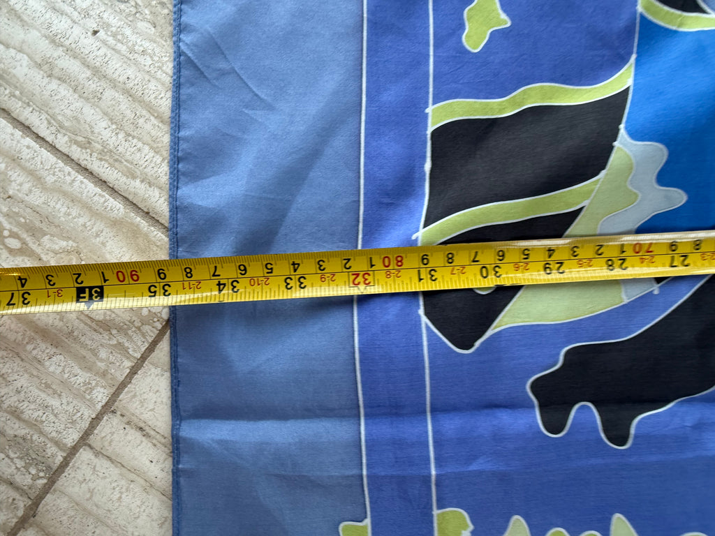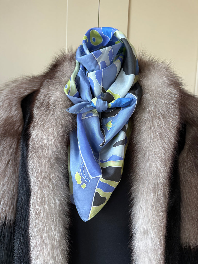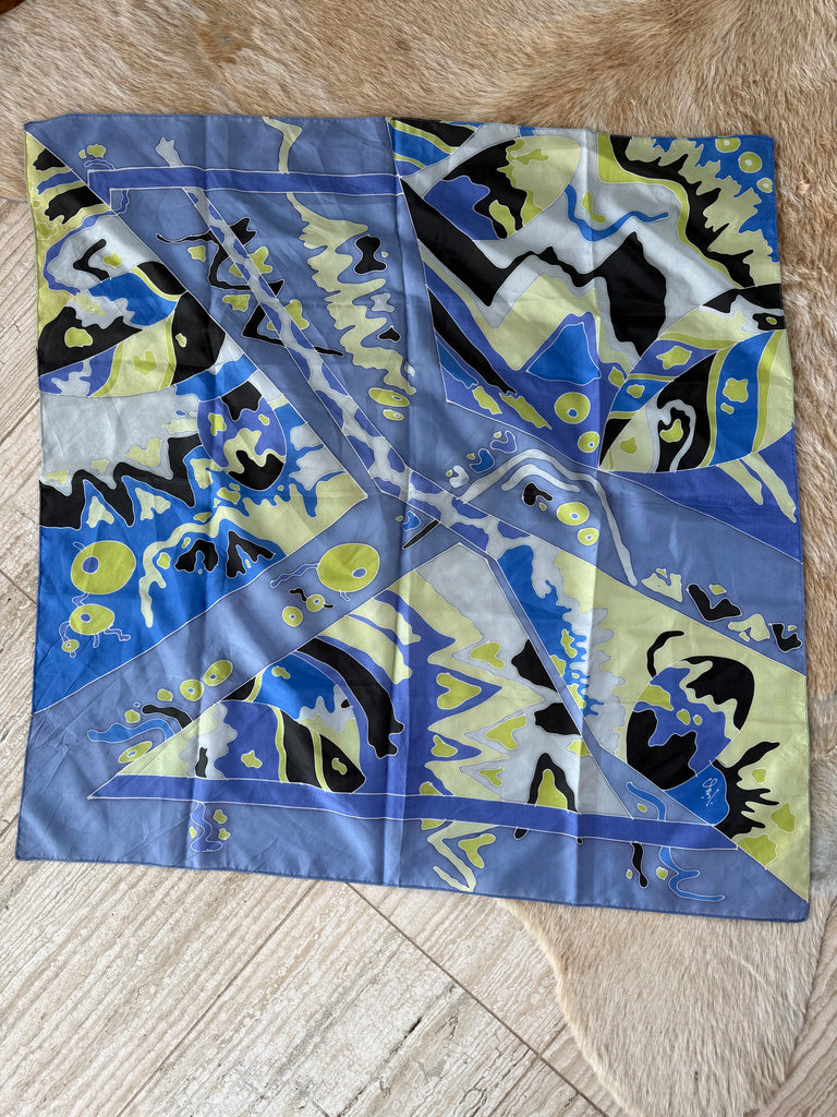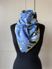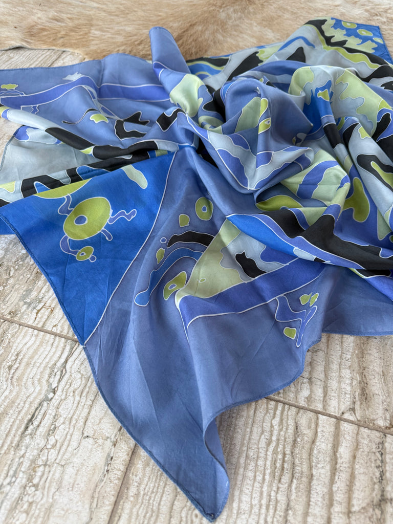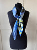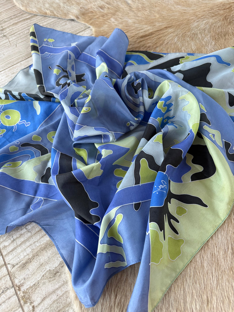 Gorgeous vintage square scarf in cool blue and green. Luxurious silk, and the perfect size to style in a multitude of ways. Measures 35”x35”.
