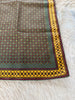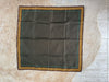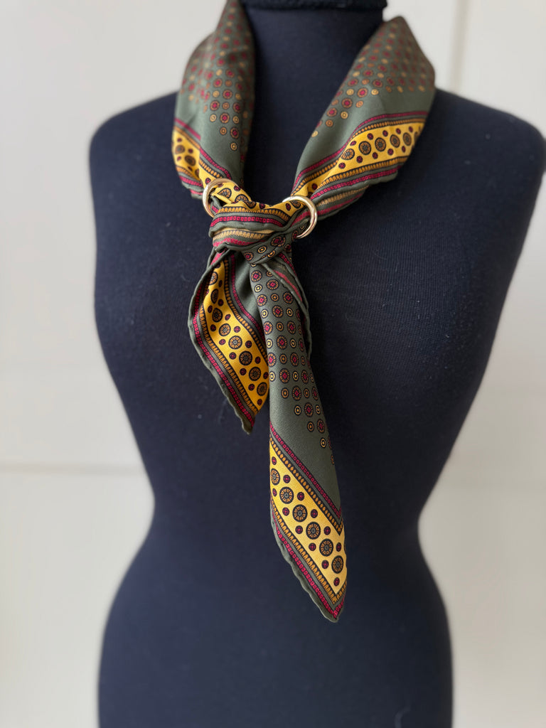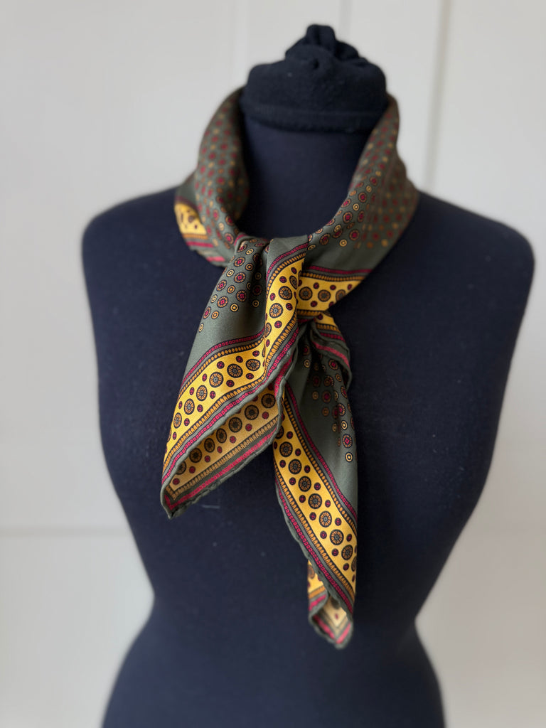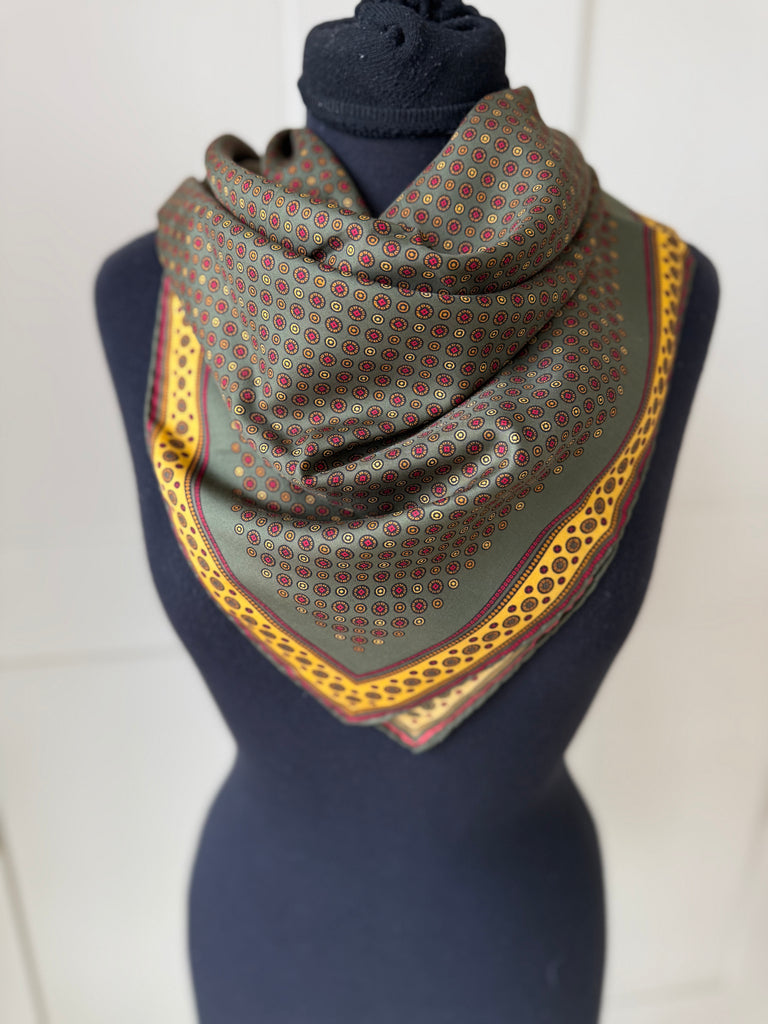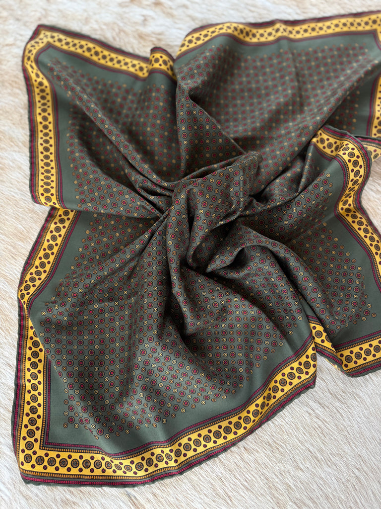 Beautiful vintage silk scarf featuring a rich olive green base with an all-over geometric dot pattern and a striking gold and burgundy border. Finished with hand-rolled edges, this scarf reflects the quality and craftsmanship found in fine vintage accessories.
