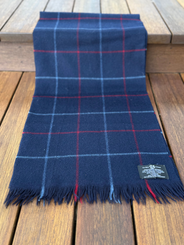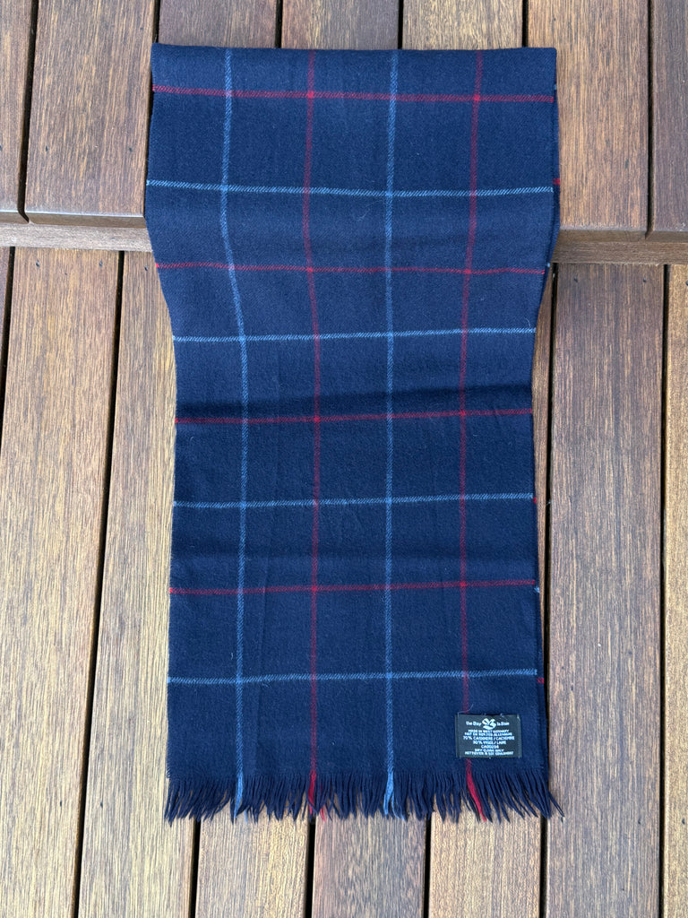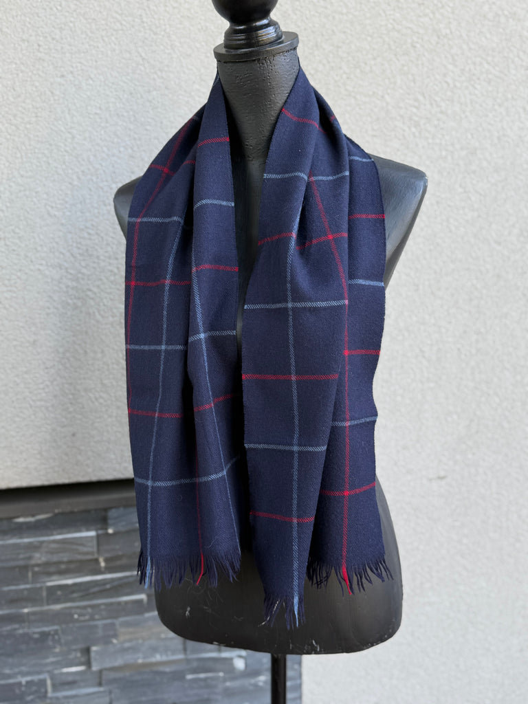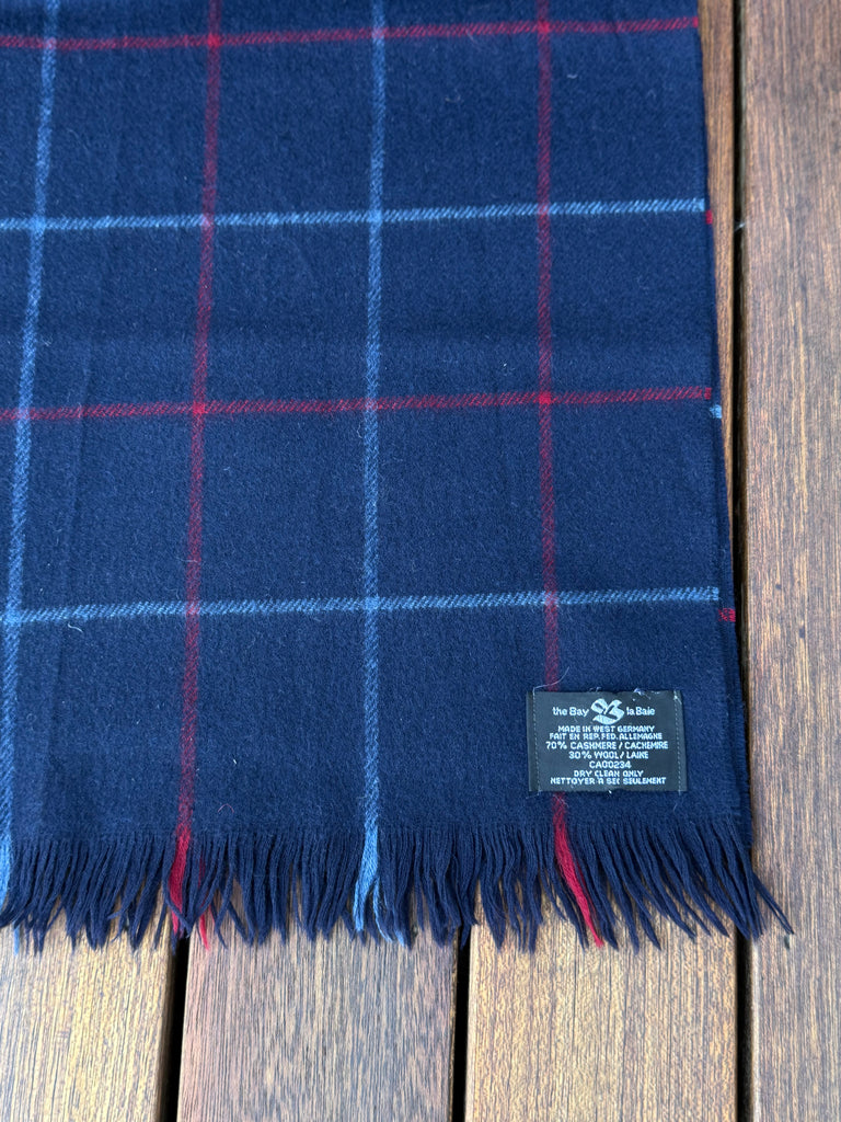 Wool and cashmere winter scarf by “The Bay” or Hudson’s Bay, Canada’s legendary department store. Navy with pale blue and red plaid. For men or women.