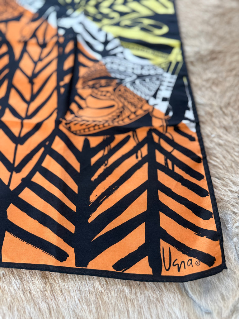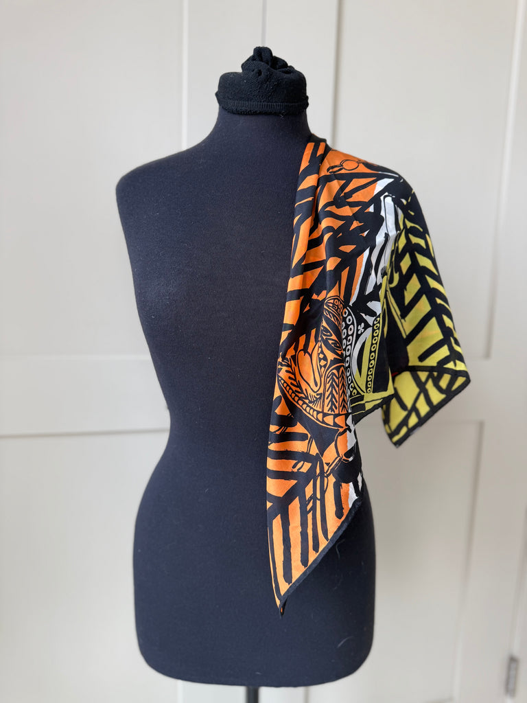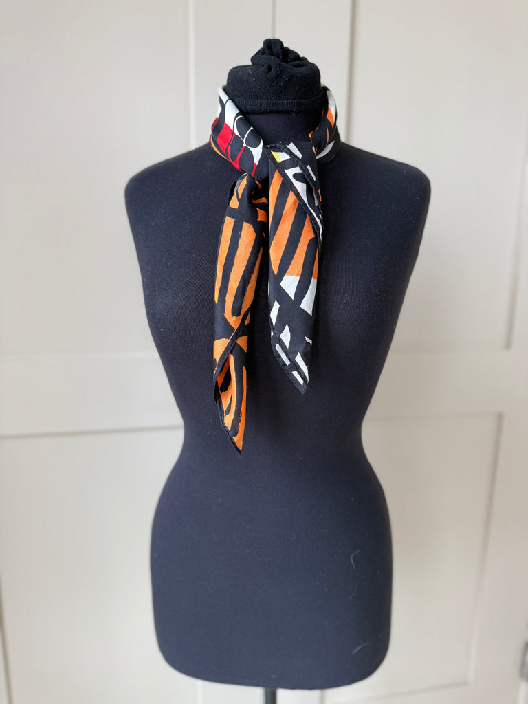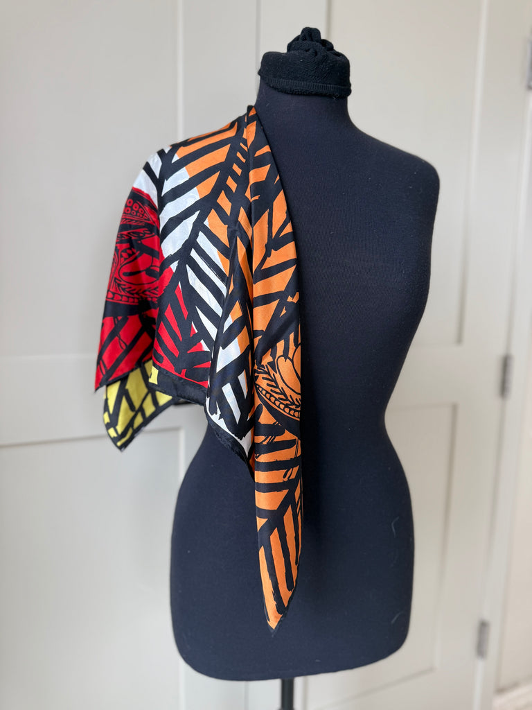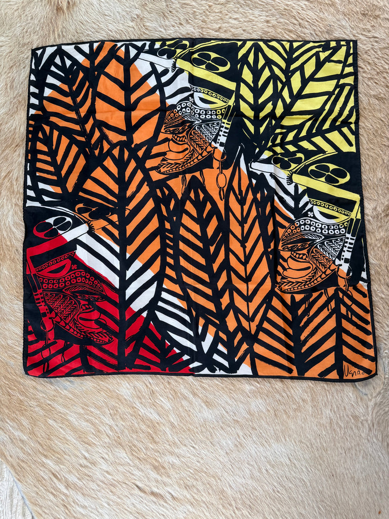 Classic Vera! Gorgeous Tribal Warrior silk scarf by designer Vera Neumann. Vibrant colours, gorgeous design. Measures 26” square