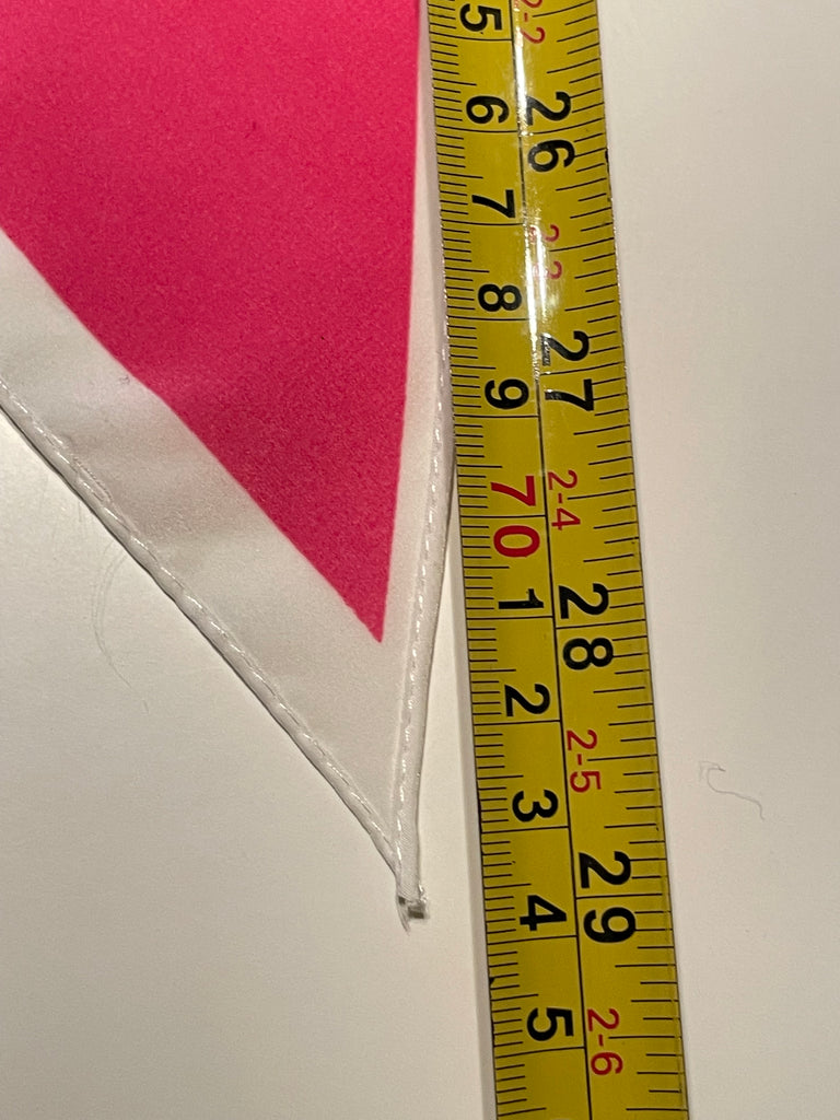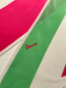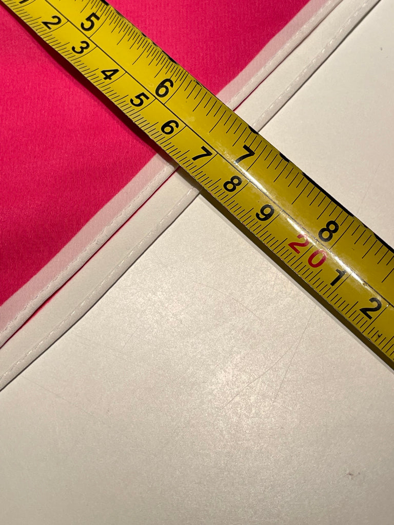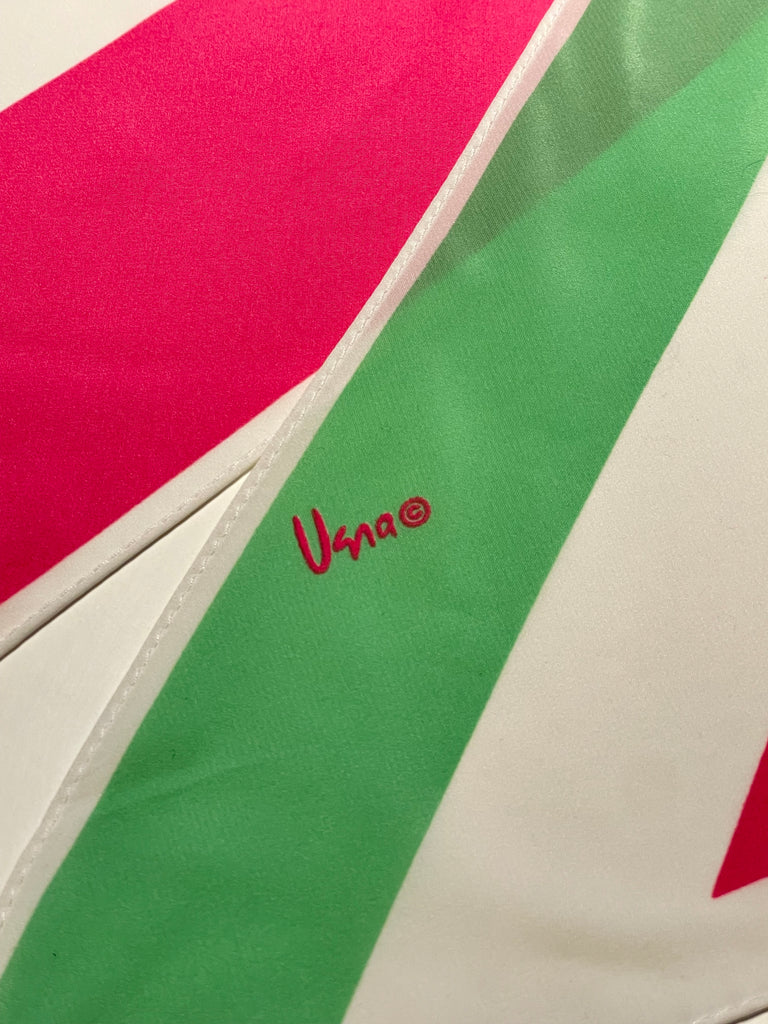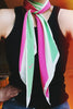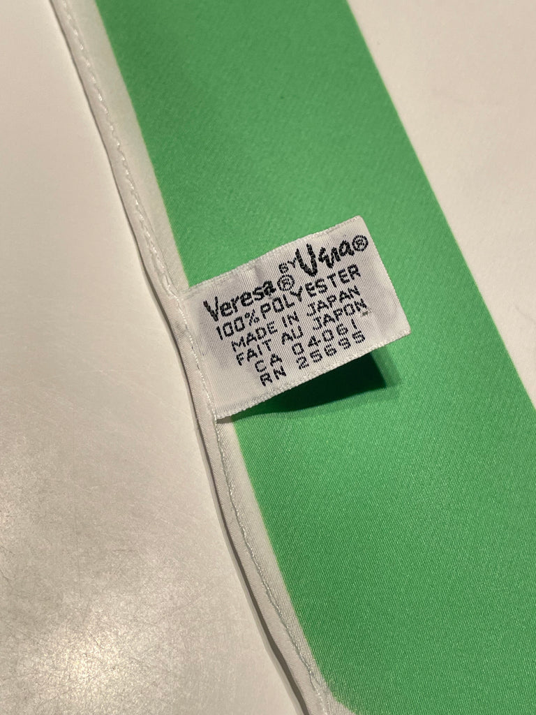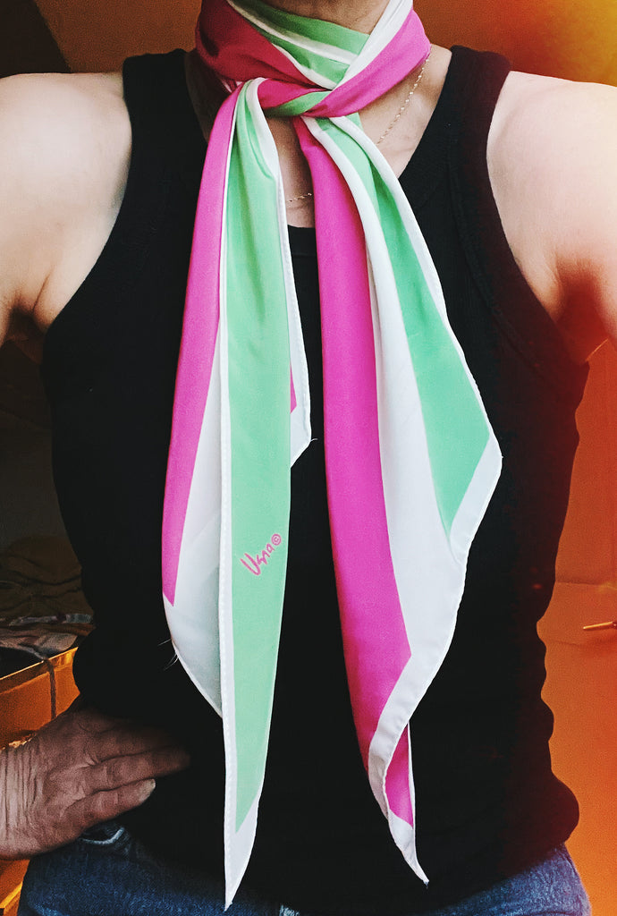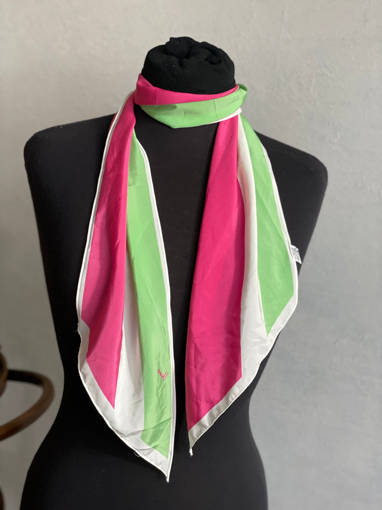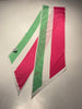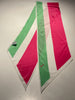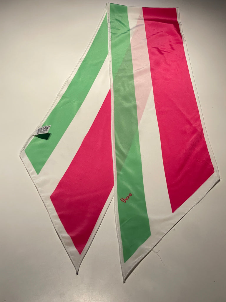 Vera is our favourite! Vintage Vera Neumann scarf in raspberry pink, green and white. Measures 7x58”. With tag