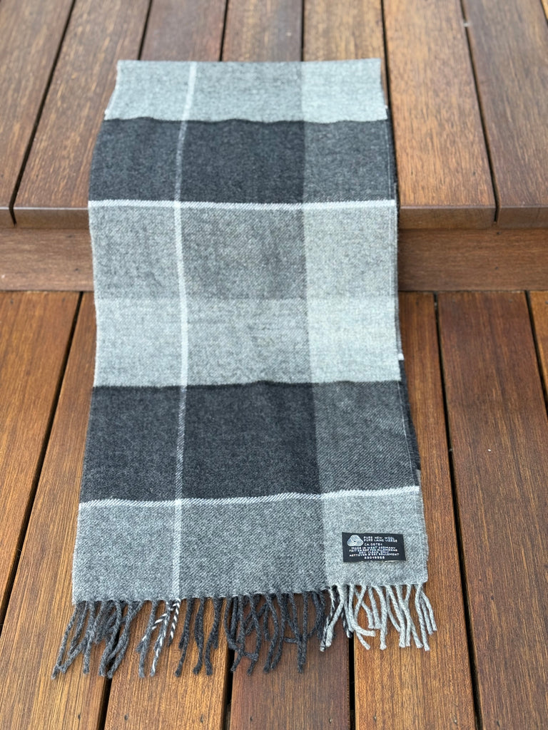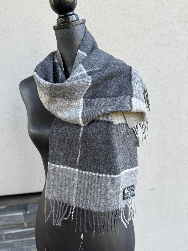 Warm and cozy, vintage wool scarf, Made in West Germany. Grey, Charcoal and white plaid. Fabulously vintage! Beautifully made, classic and elegant. Measures 11x48 inch