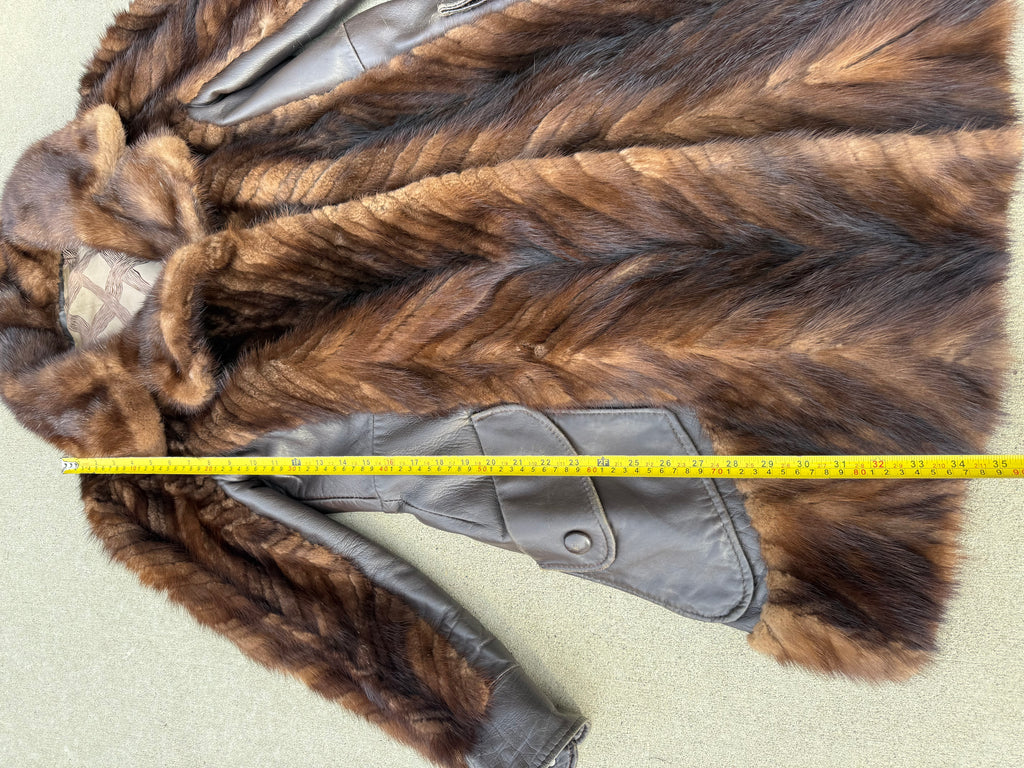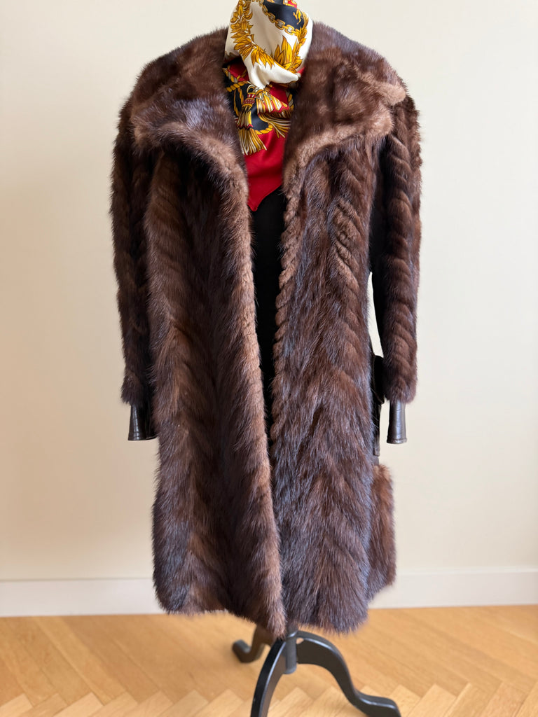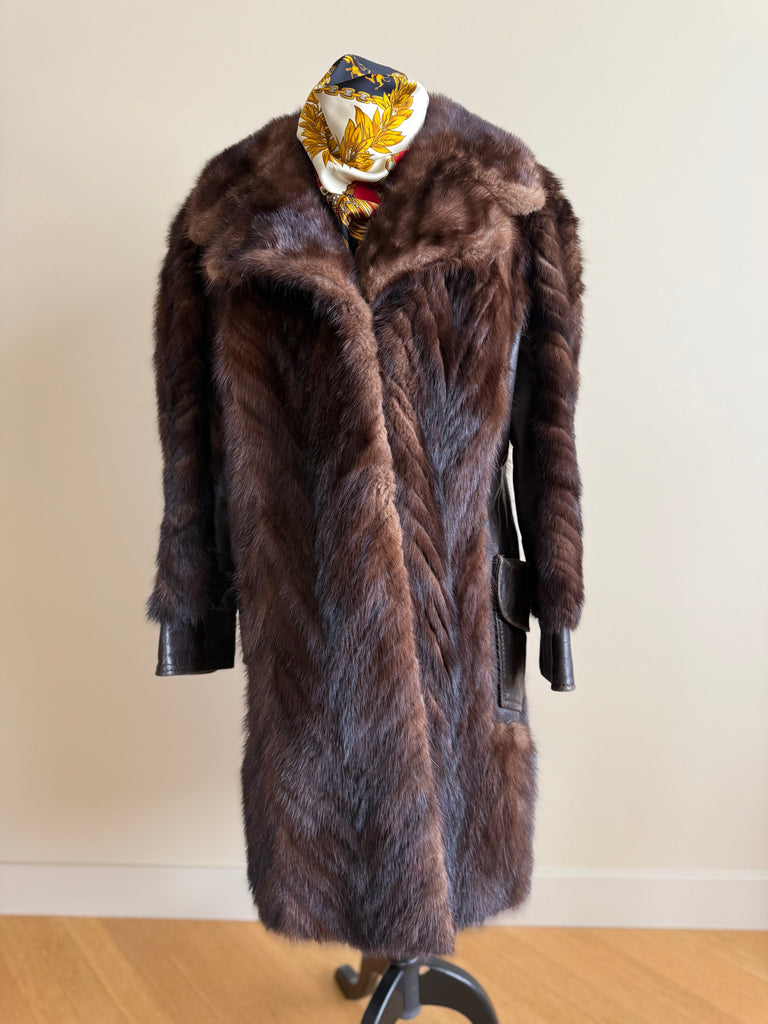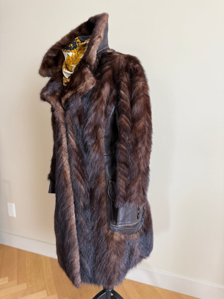 Vintage Mink Chevron Fur Coat with Leather Trim – Women’s Luxury Brown Fur Jacket