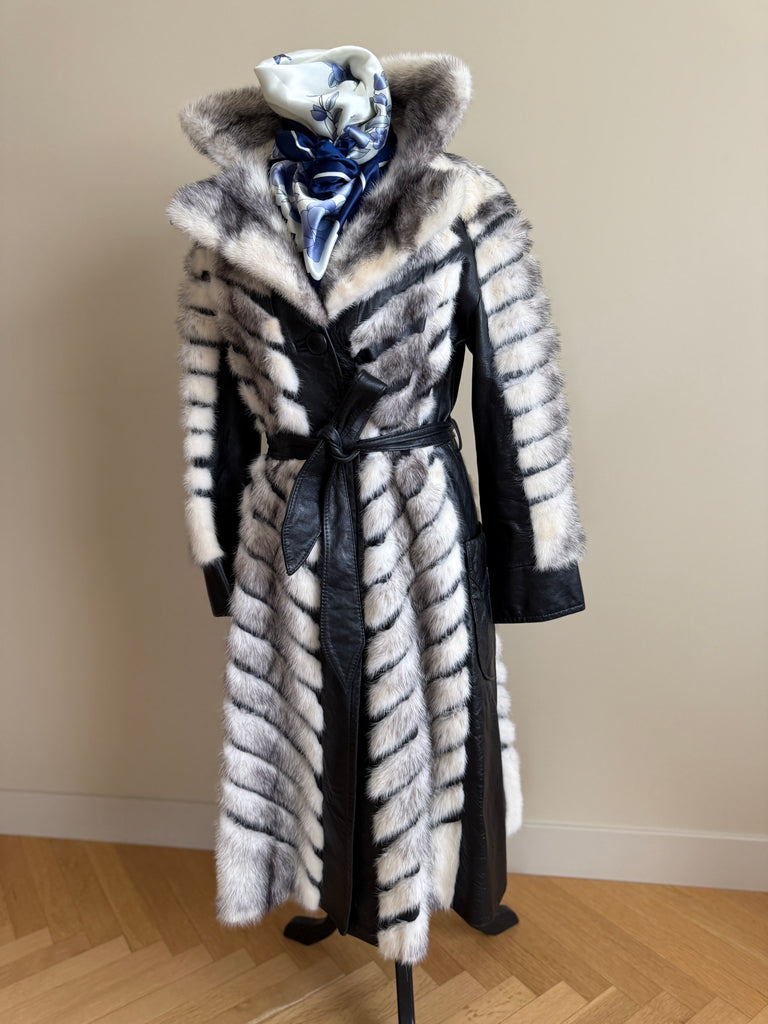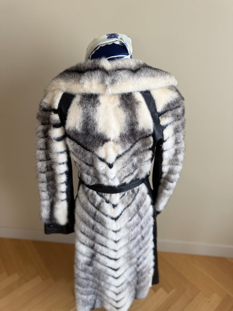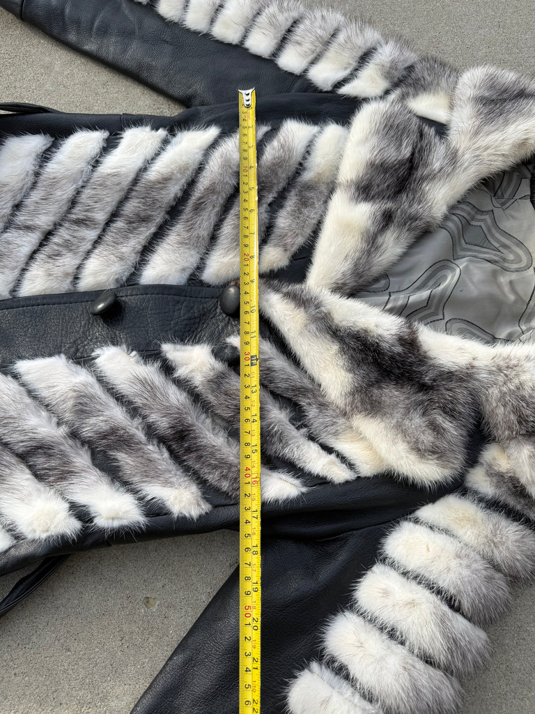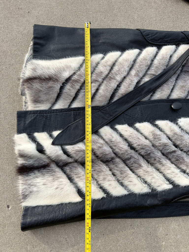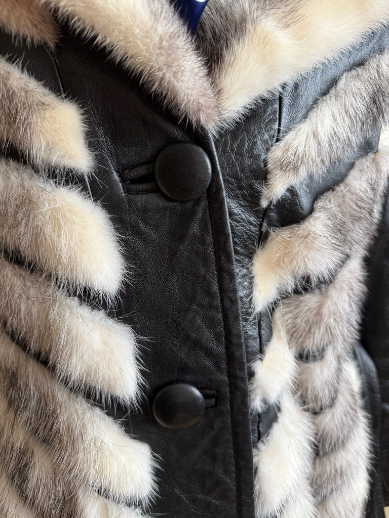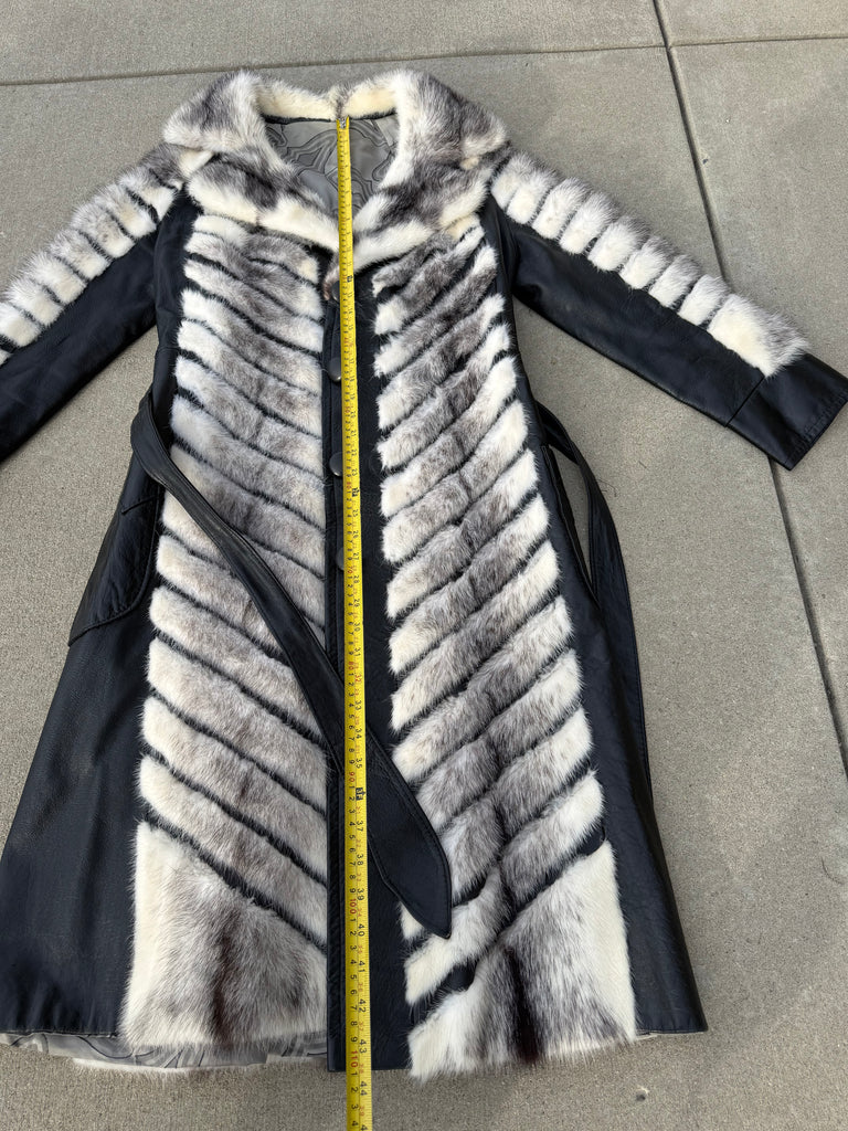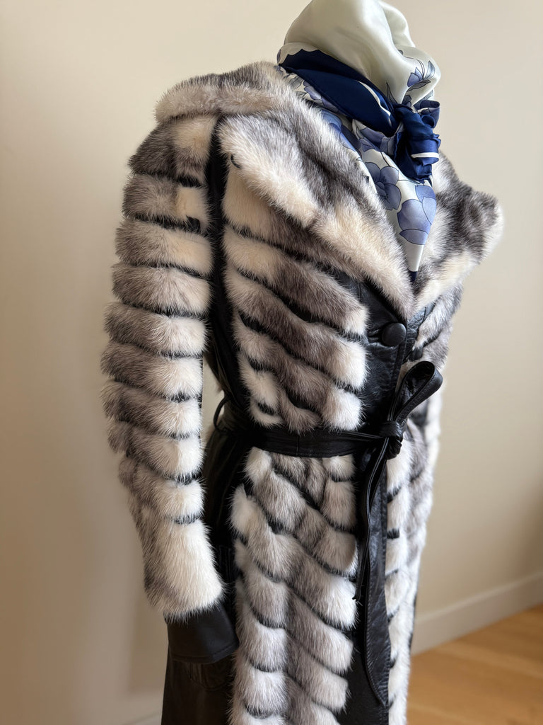 Step into serious vintage glamour with this bold fur and leather statement coat featuring a dramatic chevron pattern in soft grey and ivory fur paired with sleek black leather panels. It is equal parts luxury and attitude. The wide fur collar and cinched leather belt give you that movie star winter energy whether you are headed to brunch or making a grand entrance somewhere fabulous.