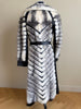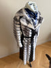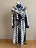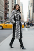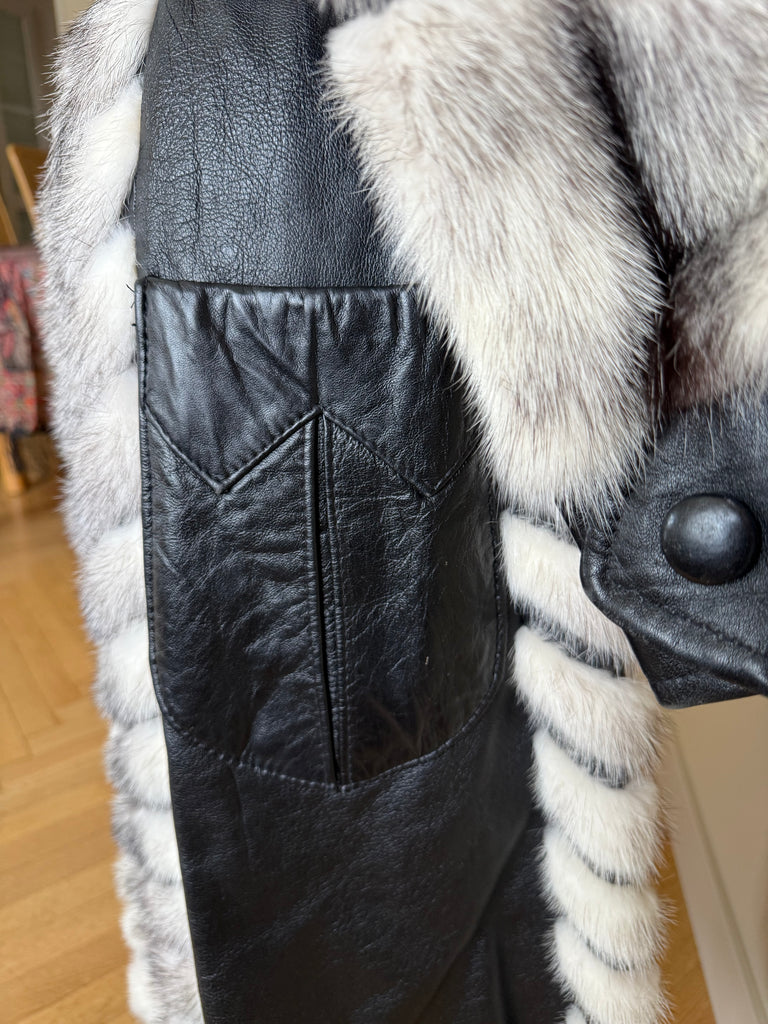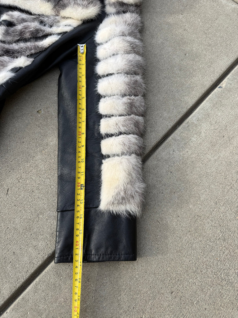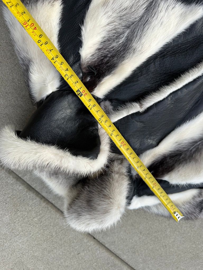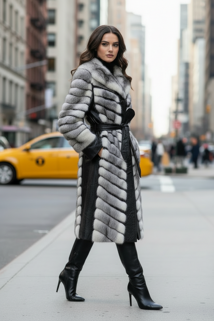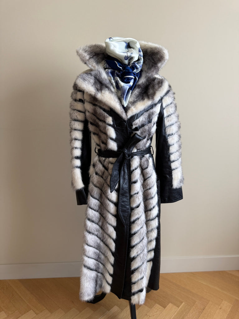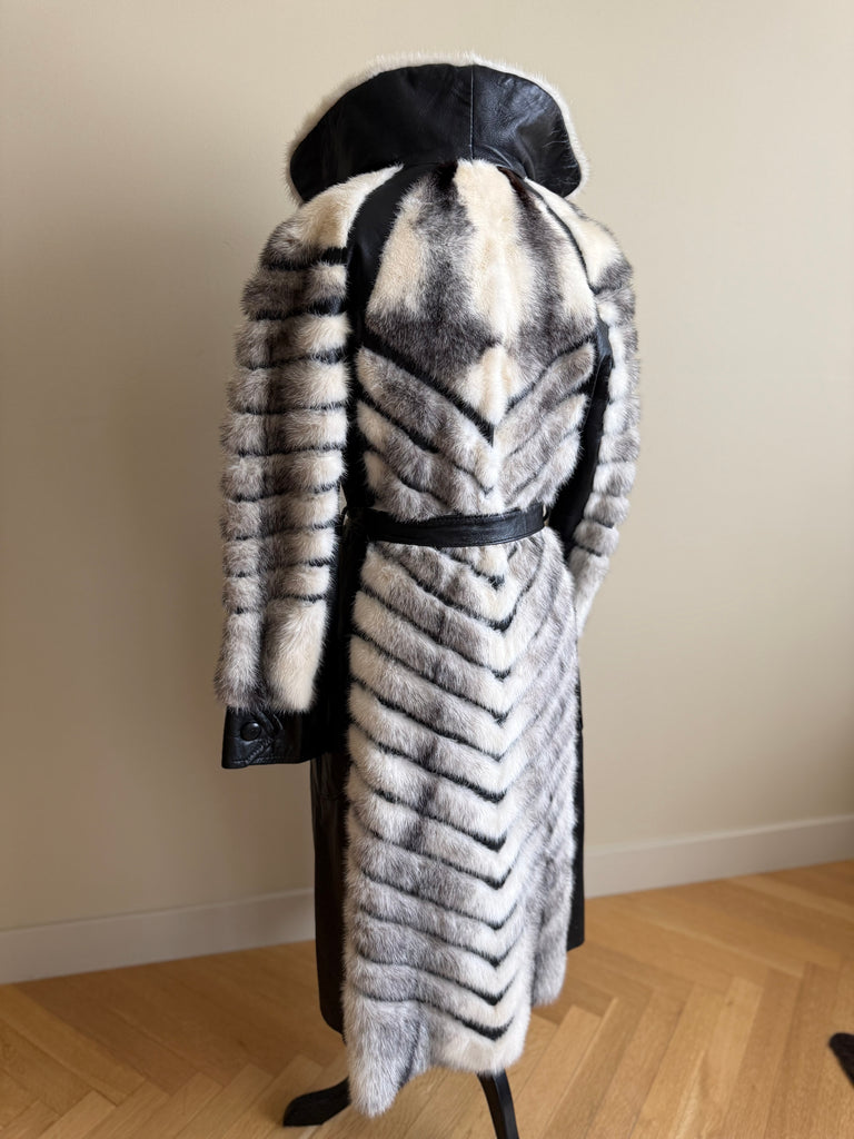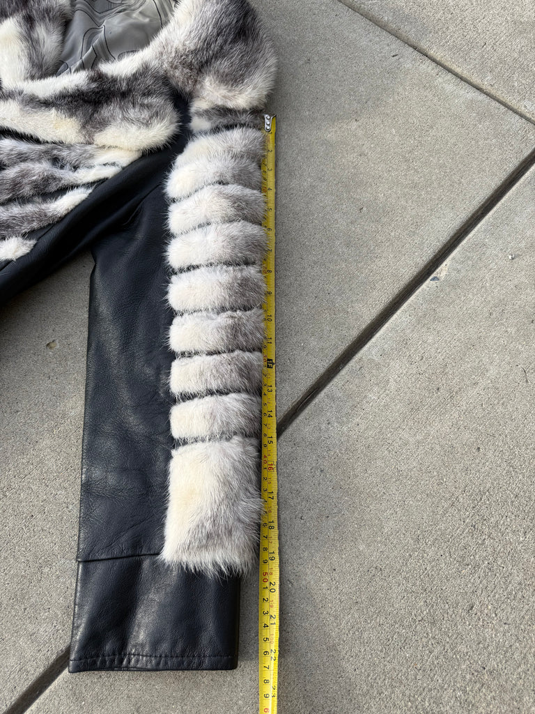 Step into serious vintage glamour with this bold fur and leather statement coat featuring a dramatic chevron pattern in soft grey and ivory fur paired with sleek black leather panels. It is equal parts luxury and attitude. The wide fur collar and cinched leather belt give you that movie star winter energy whether you are headed to brunch or making a grand entrance somewhere fabulous.