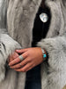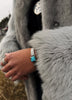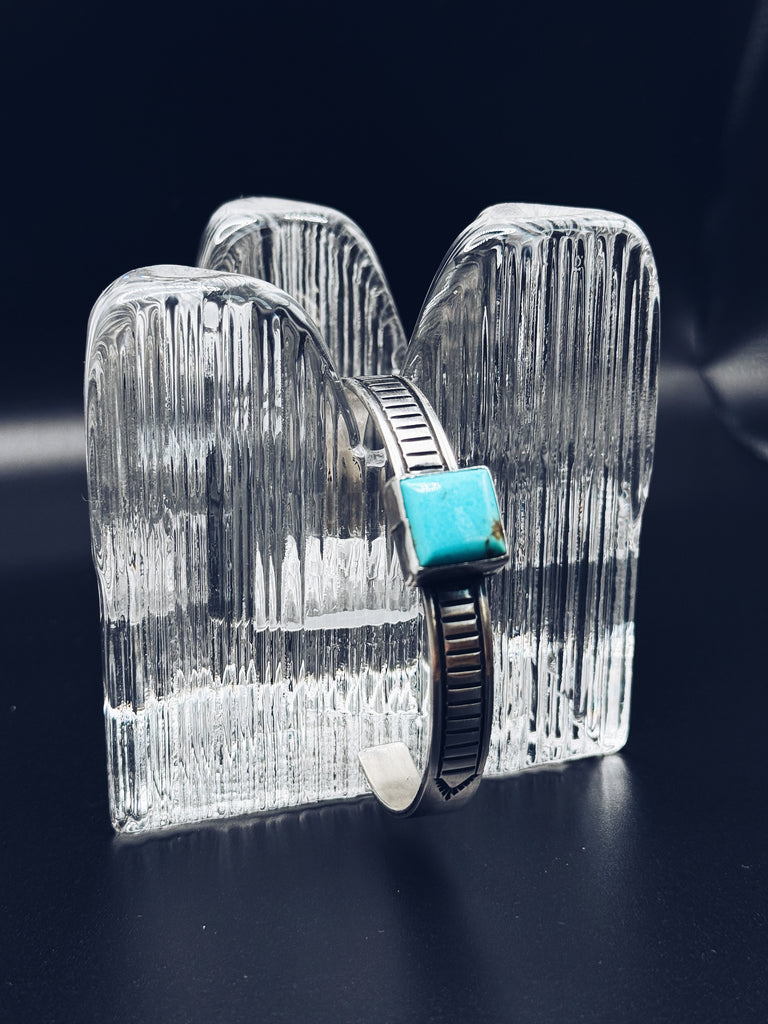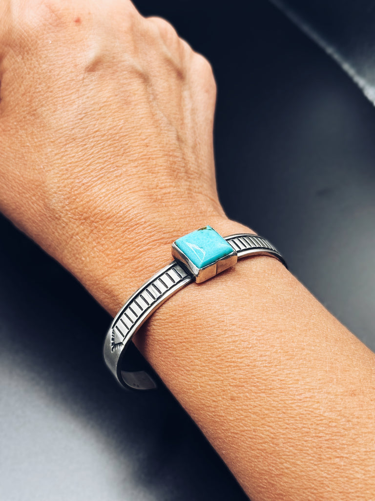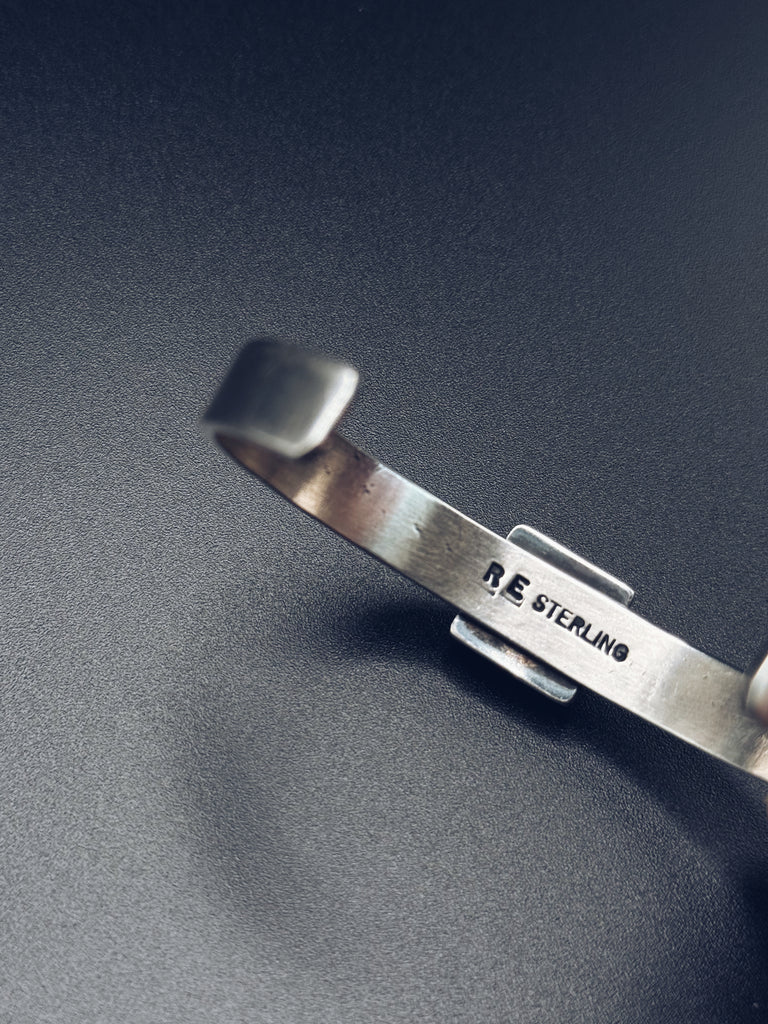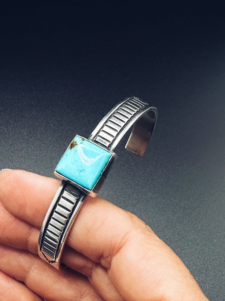 Authentic Navajo turquoise handmade bracelet in sterling silver. Expertly crafted by Rick Enriquez, this bracelet features a cabochon cut turquoise measuring 11.70mm x 11.50mm.