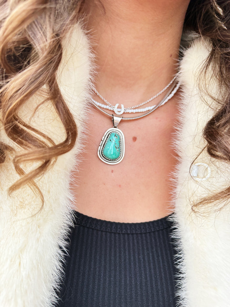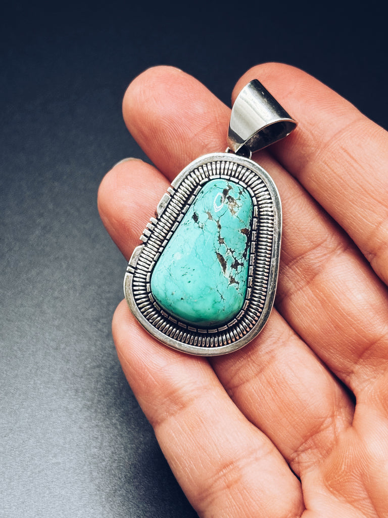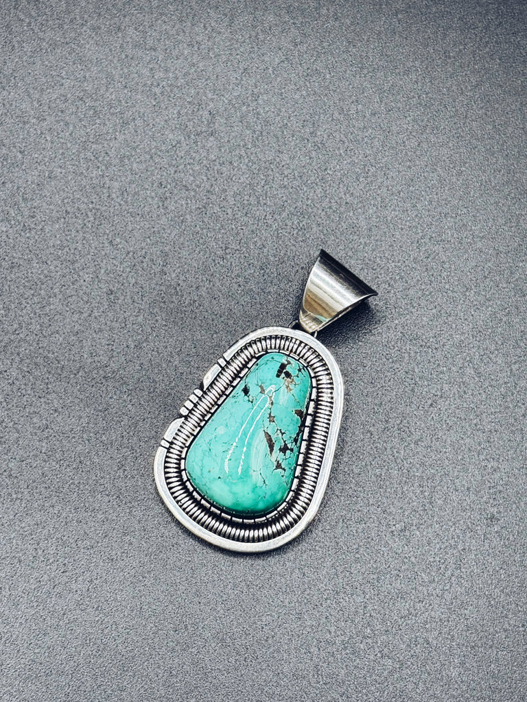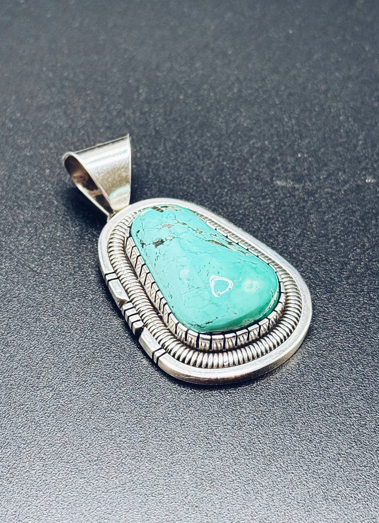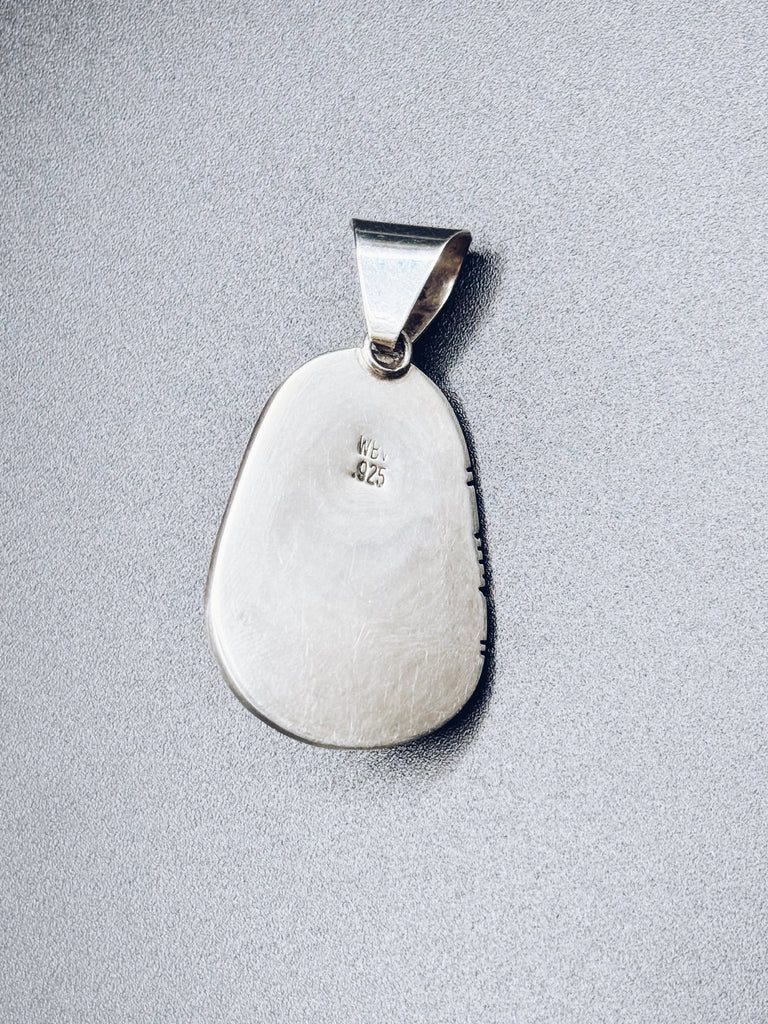 Stunning sterling silver and turquoise pendant by Navajo artist Walter Vandever. (1951-2018) Known for his incredible artistry and attention to detail, Vandevers pieces are highly sought by collectors worldwide. This pendant has beautiful rich colour Kingsman turquoise, set in traditional sterling silver. Highly priced, and one of a kind, this piece will be loved by generations.