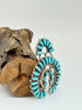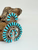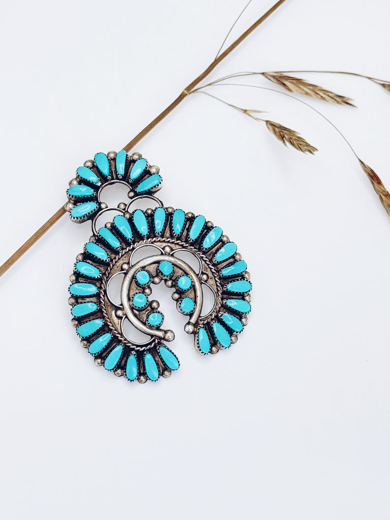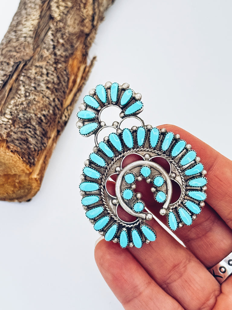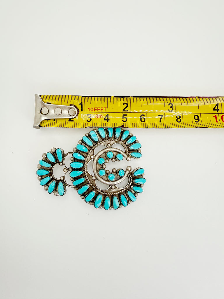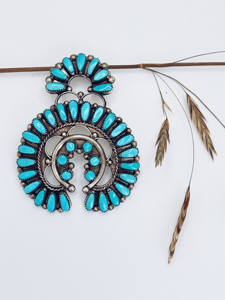 Vintage handmade petit point squash blossom slider pendant by Violet and Jeffrey Begay. Navajo turquoise bezel set in sterling silver. Pendant is stamped V.J.B and sterling. Price includes a current certificate of appraisal. Value $1800