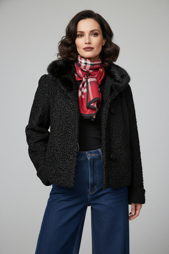 This stunning vintage Persian lamb coat features a plush mink fur collar and a chic cropped silhouette that feels straight out of classic Hollywood. Rich black texture, beautifully structured, and endlessly elegant — perfect for winter evenings, special occasions, or elevating everyday denim.