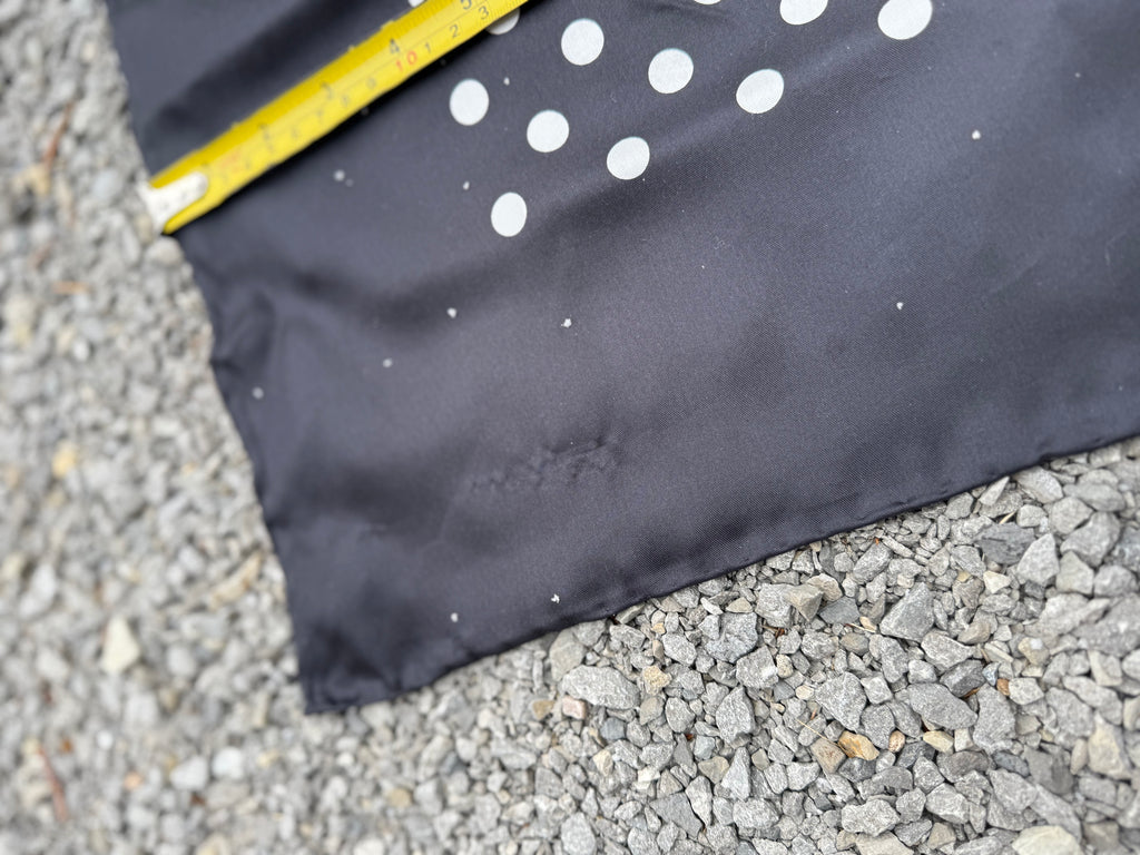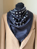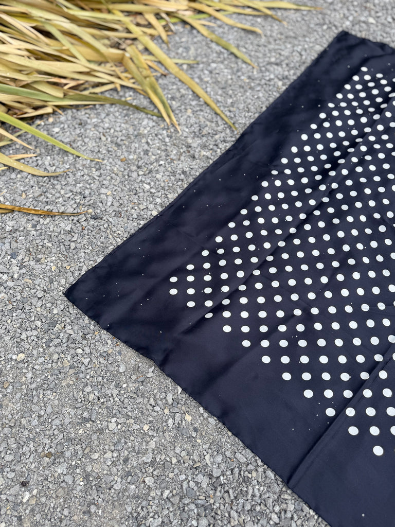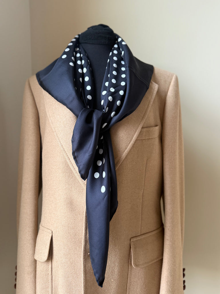 Crafted from 100% pure silk, it drapes beautifully and can be styled in multiple ways — worn as a shawl, neck scarf, or even as a statement accessory. Rolled edges in classic black annd white. Its generous size and refined finish make it a standout piece for any vintage or designer collection.