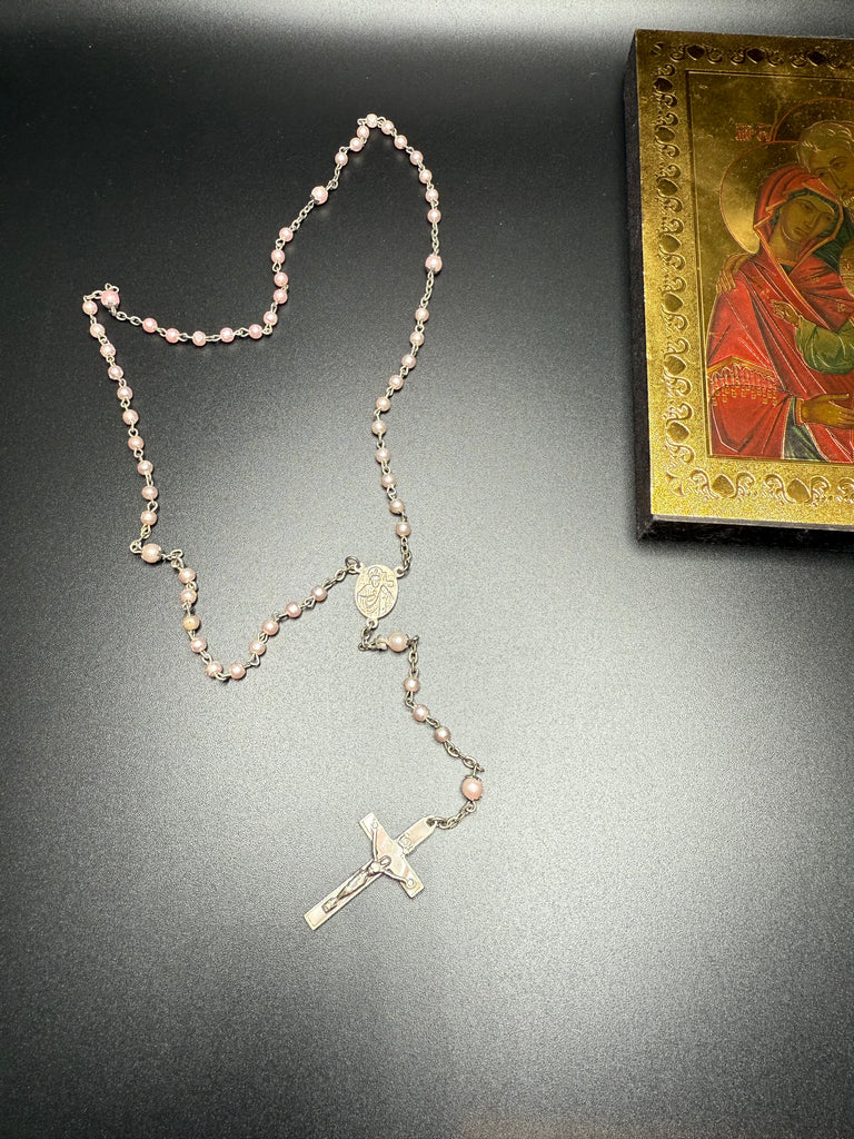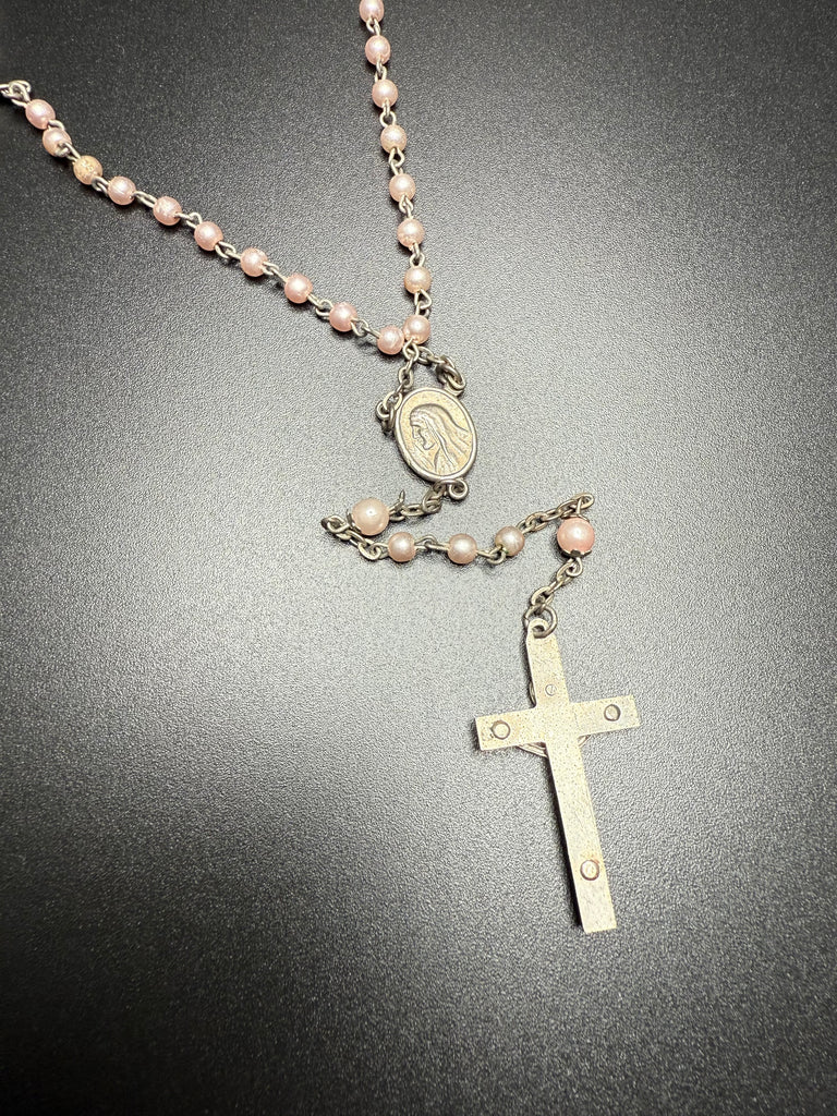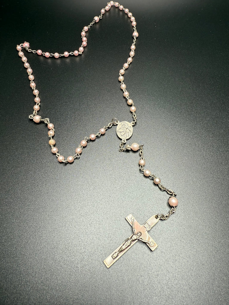 This vintage pink pearl rosary is a beautifully crafted devotional piece featuring soft pink beads and a detailed silver-tone crucifix. Elegant and feminine, this rosary is ideal for prayer, display, gifting, or adding to a collection of vintage religious items.