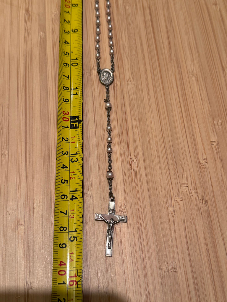 Very good vintage condition with normal, light signs of age. All beads and links are intact. Crucifix and medal show gentle patina consistent with age, adding to its character.