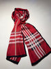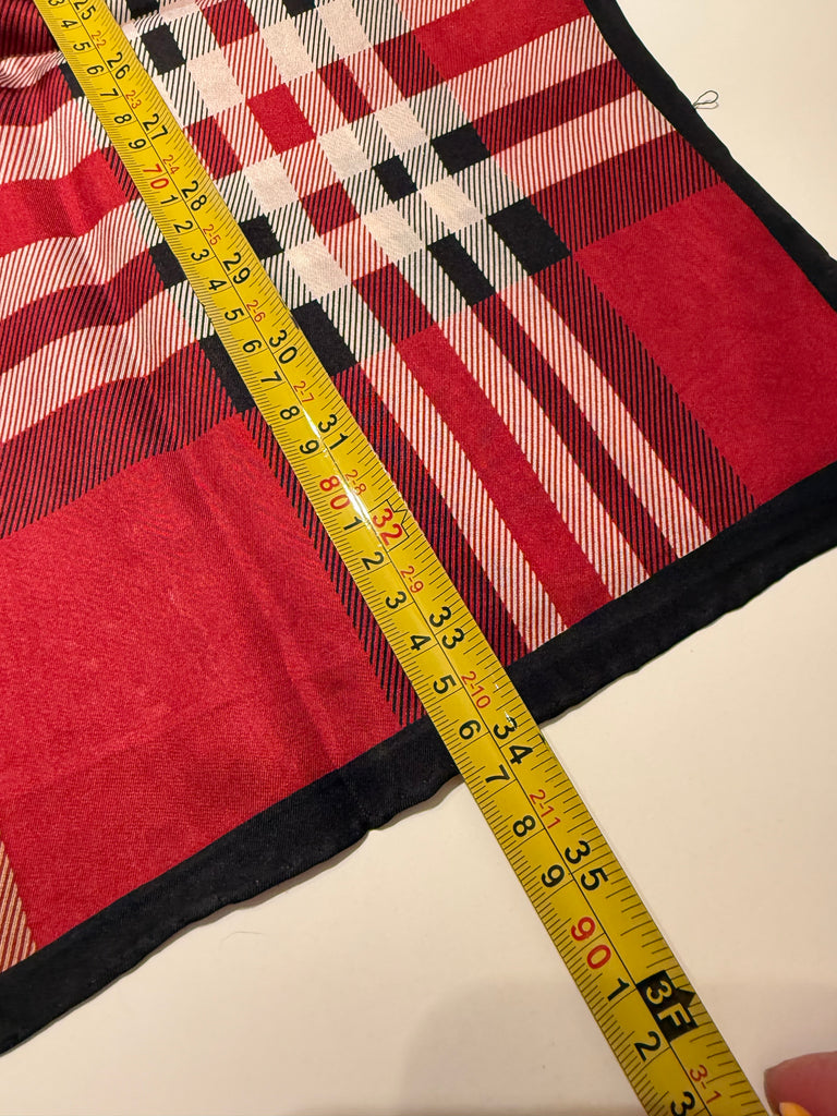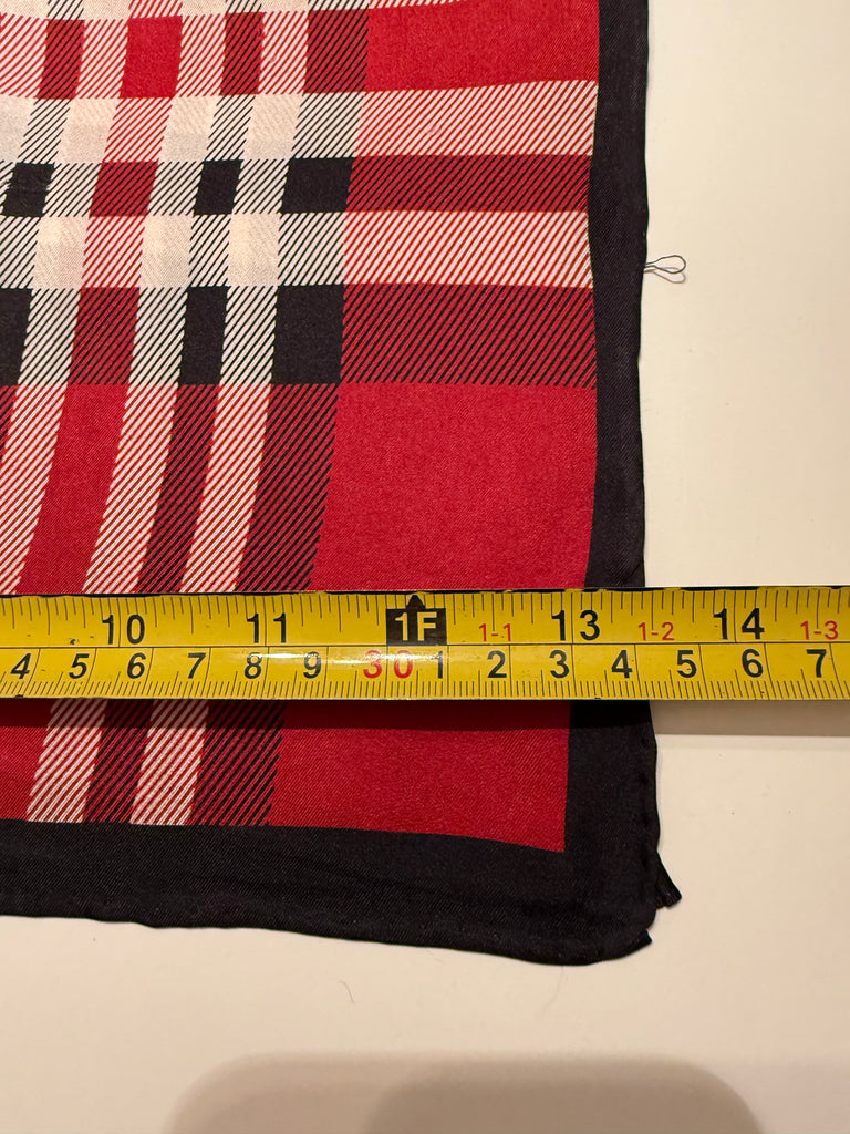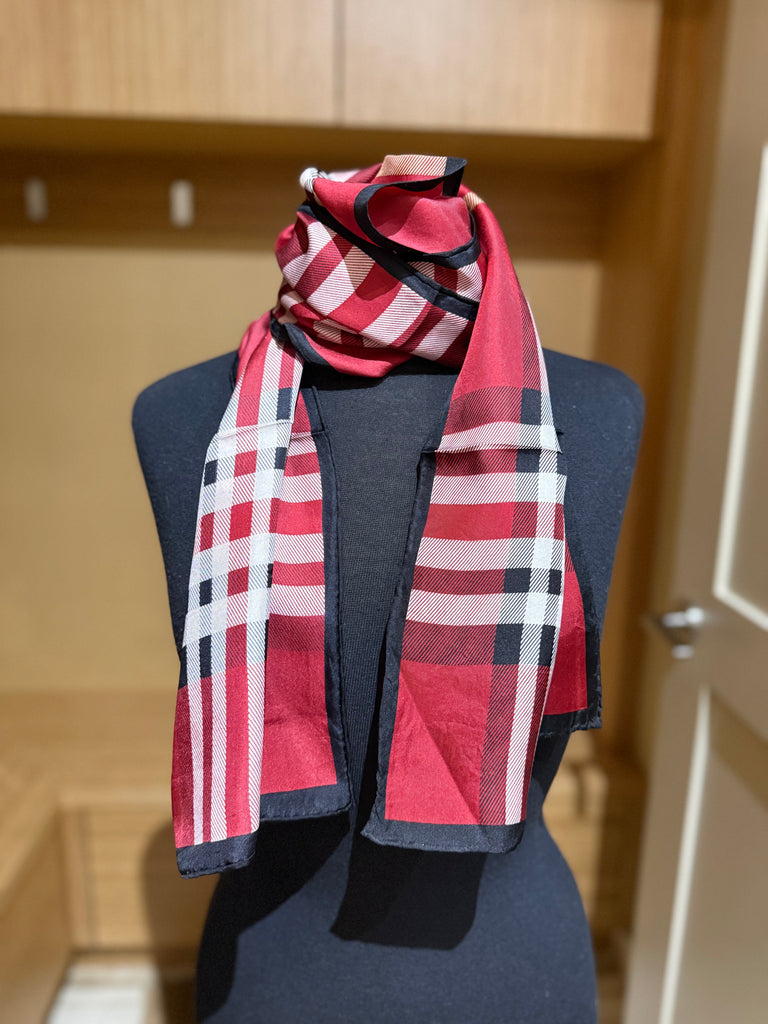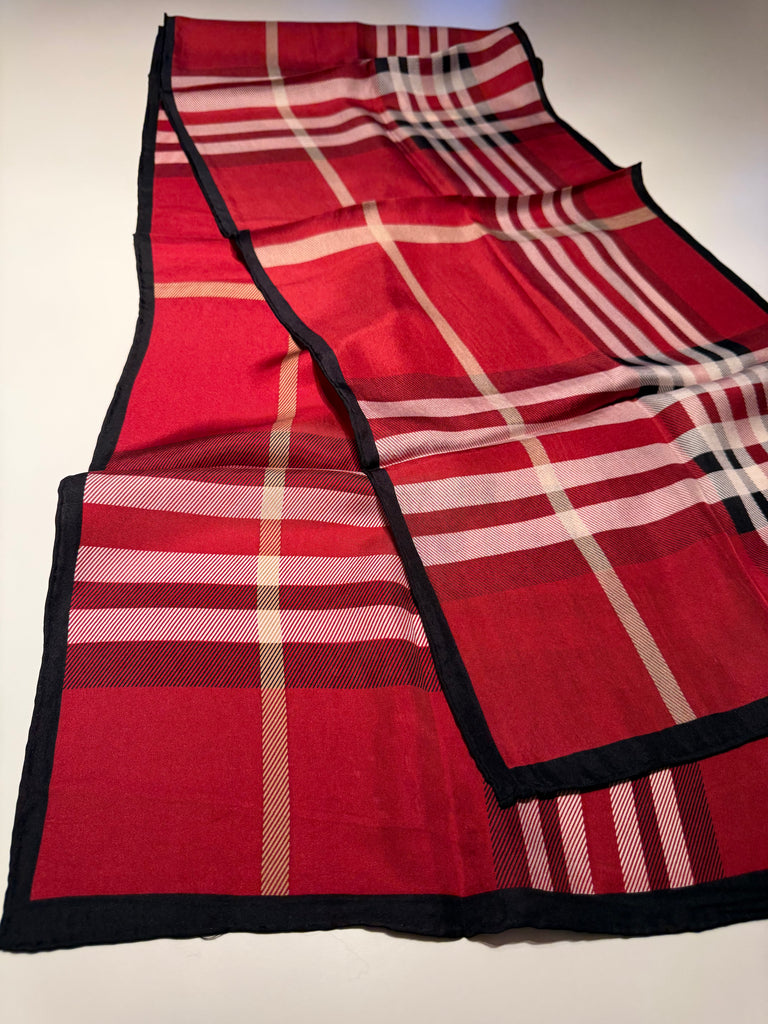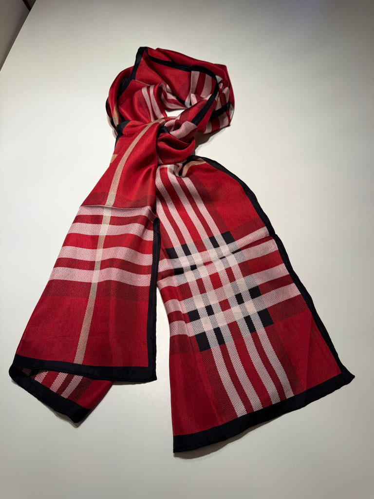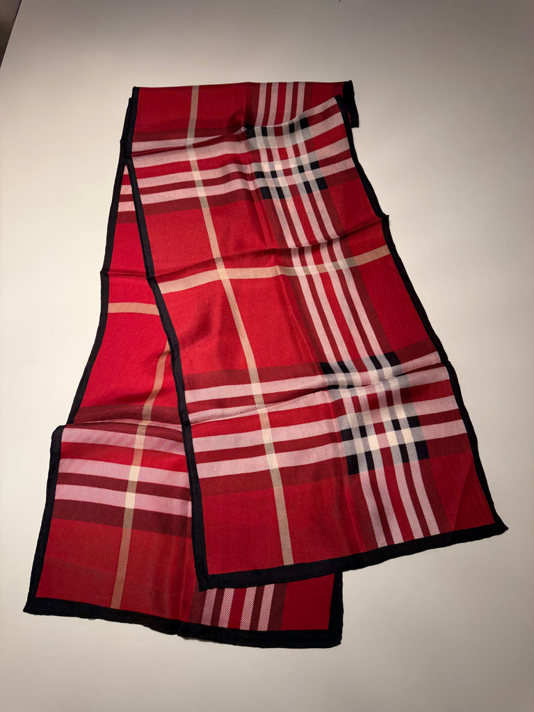 Luxurious silk scarf in traditional red and black plaid with hand rolled edges. Beautifully made, and the perfect way to add a pop of color to any outfit. Measures 68x13.