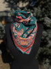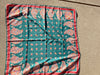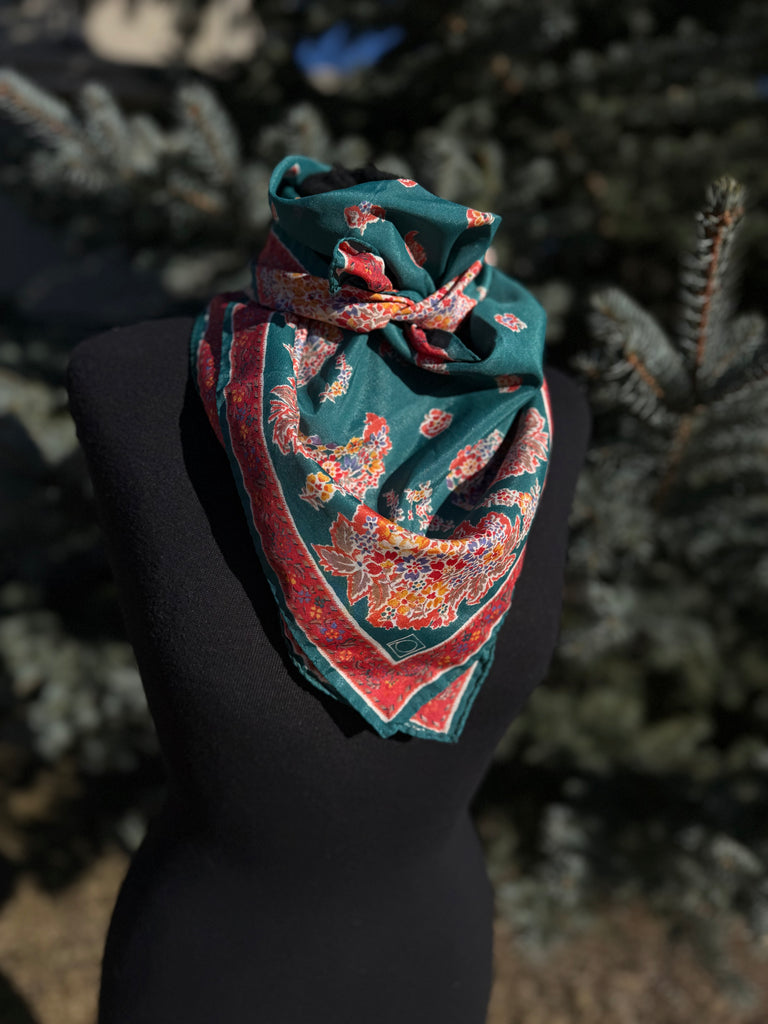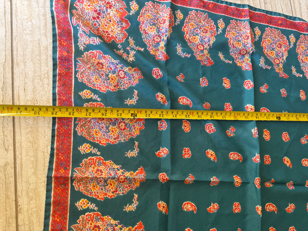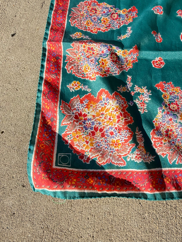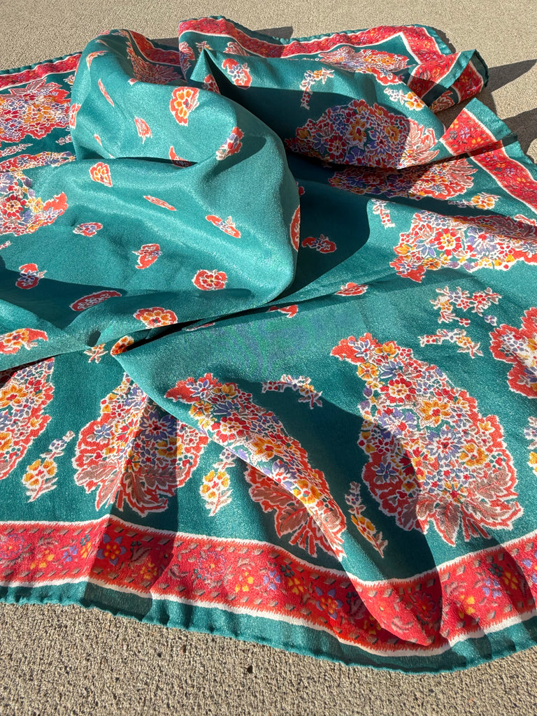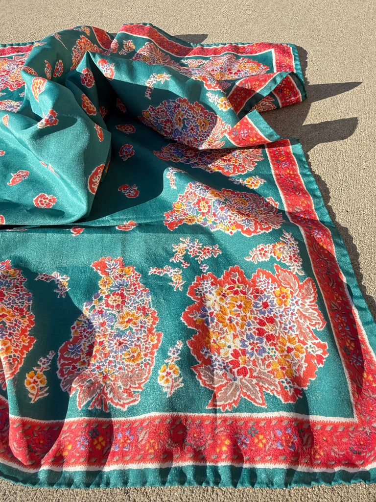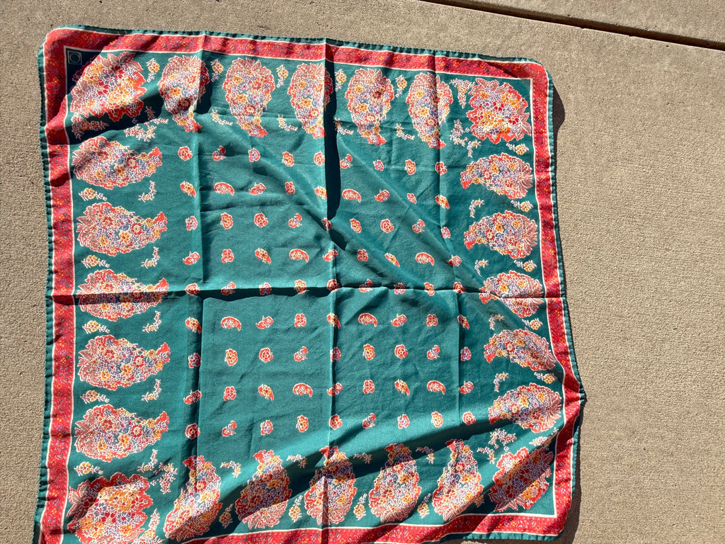 Vintage floral silk scarf featuring a beautiful green background with red and multicolor paisley floral detailing. This classic square scarf is lightweight, versatile, and easy to style as a neck scarf, head scarf, or handbag accessory.