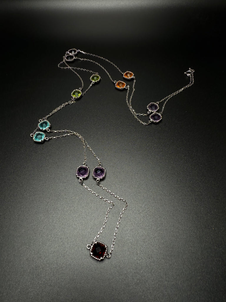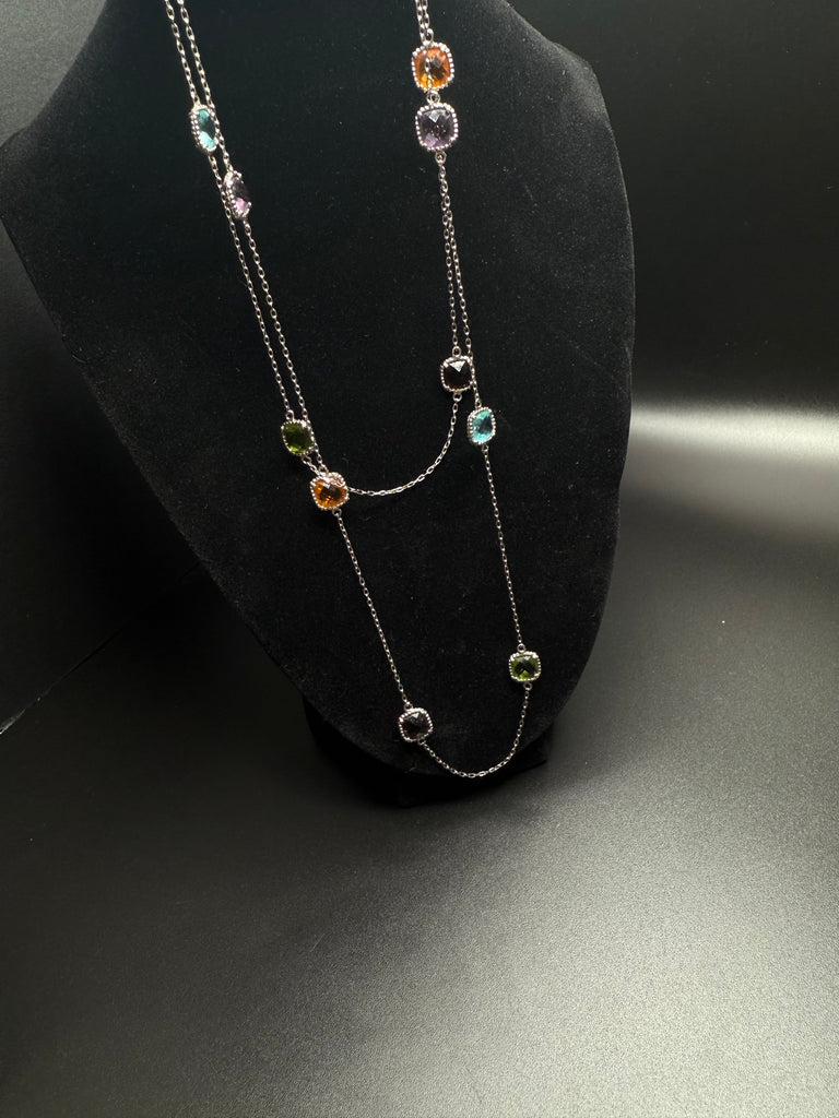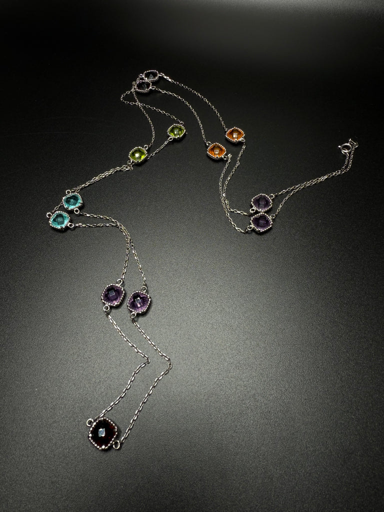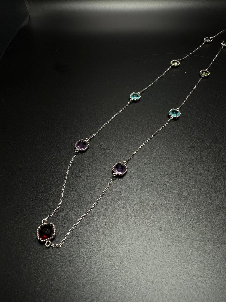 Gorgeous multi stone station necklace in sterling silver. Perfect for layering. Measures 32”. Stamped 925