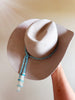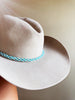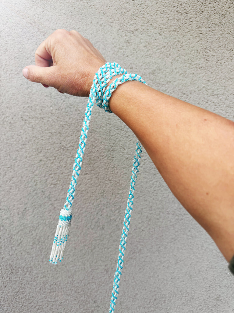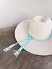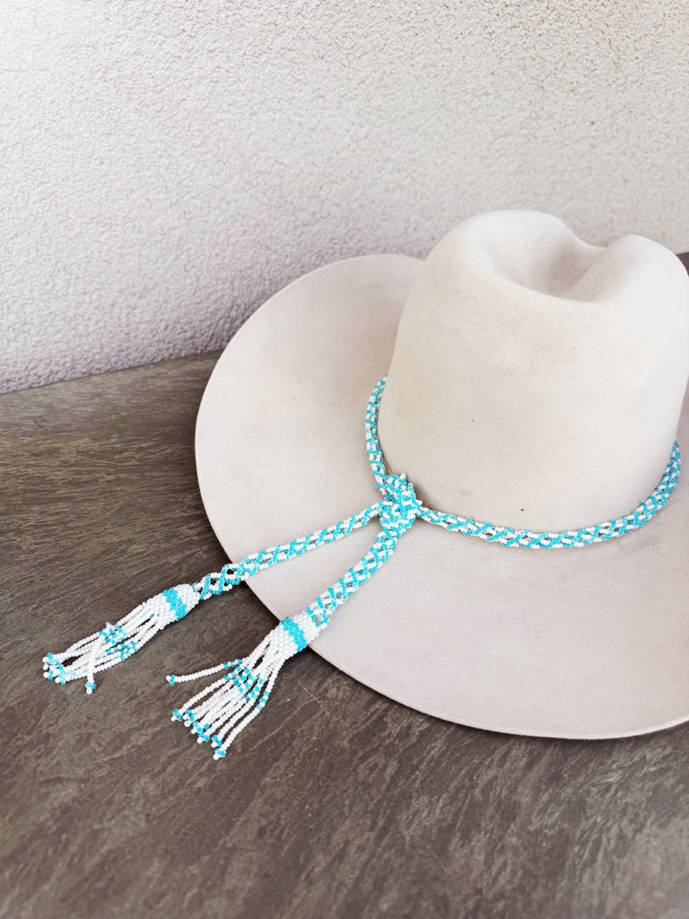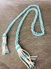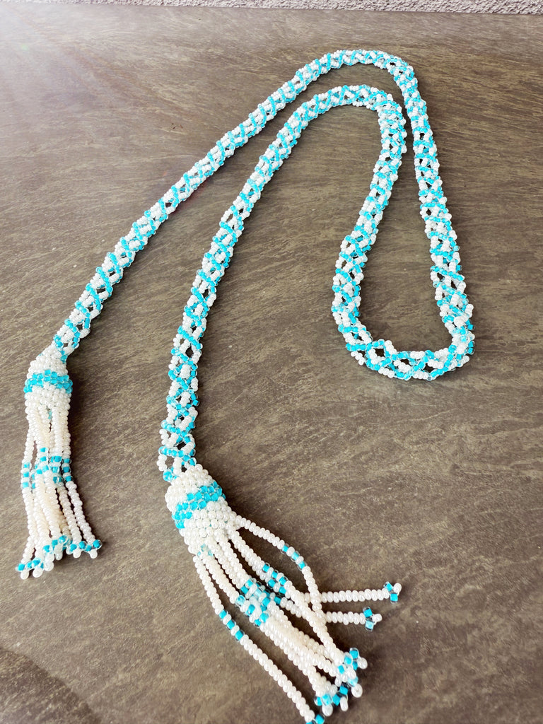 Vintage Hand Beaded Hat Band. Tiffany blue and white glass seed pearl beads. Can also be worn as necklace. Measures 40” with tassels
