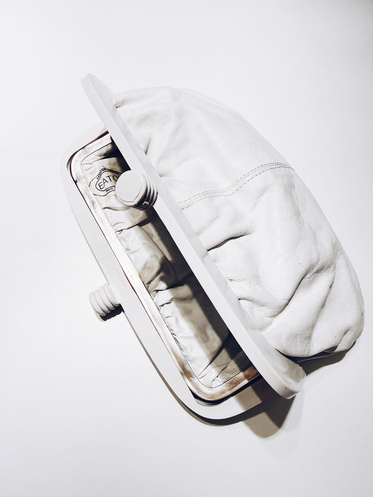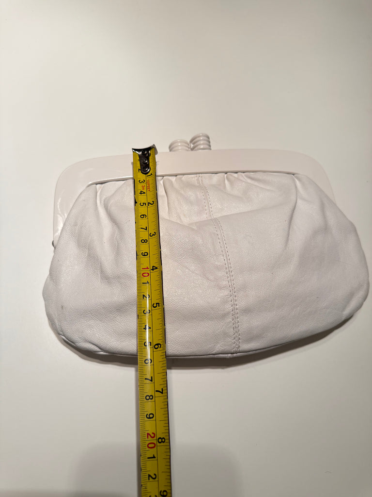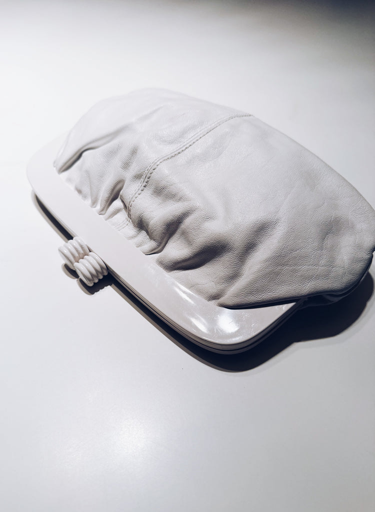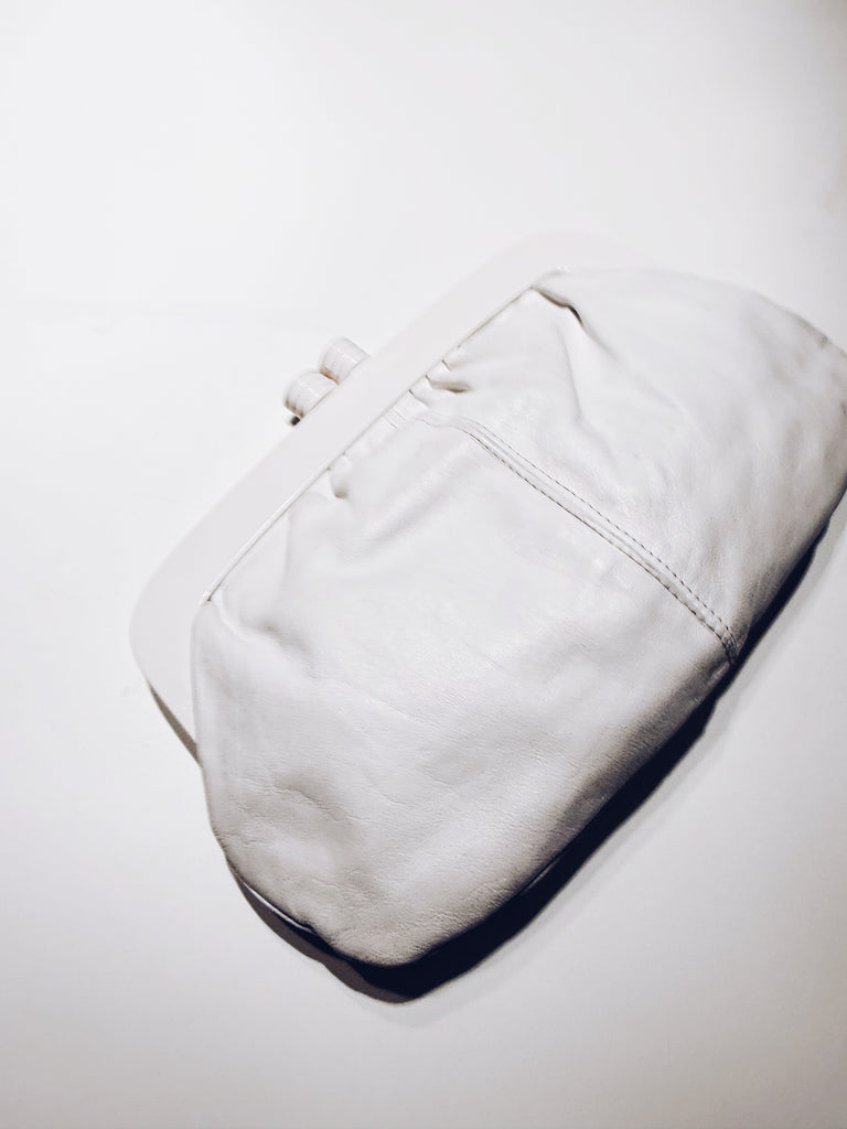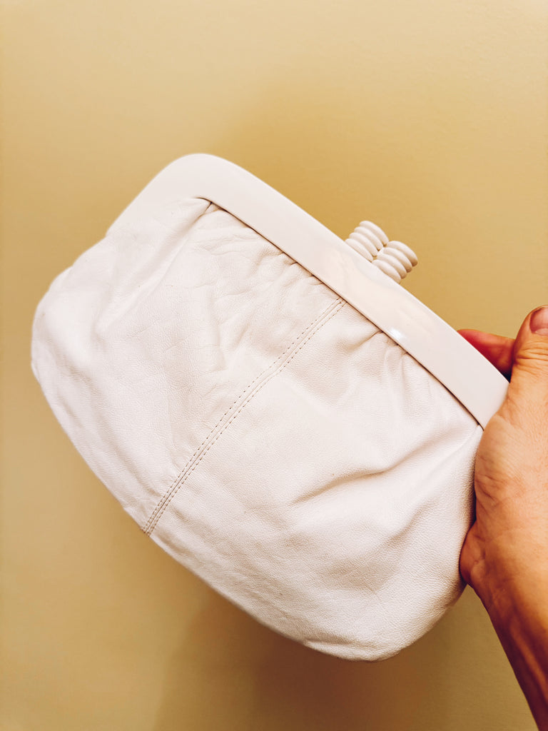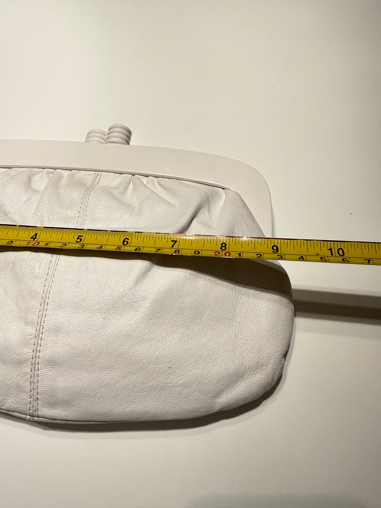 The perfect clutch handbag for warm days and nights. Beautiful white leather clutch purse with acrylic clasp. Made in Italy for Eatons of Canada.