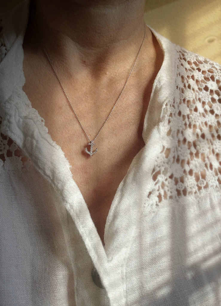 • Why you’ll love it: This pendant brings the light of diamonds together with the whisper of the sea. Wear it solo for subtle glamour, layer it with other fine gold chains for an elevated look, or gift it as a meaningful symbol of grounding, journey and anchored love.