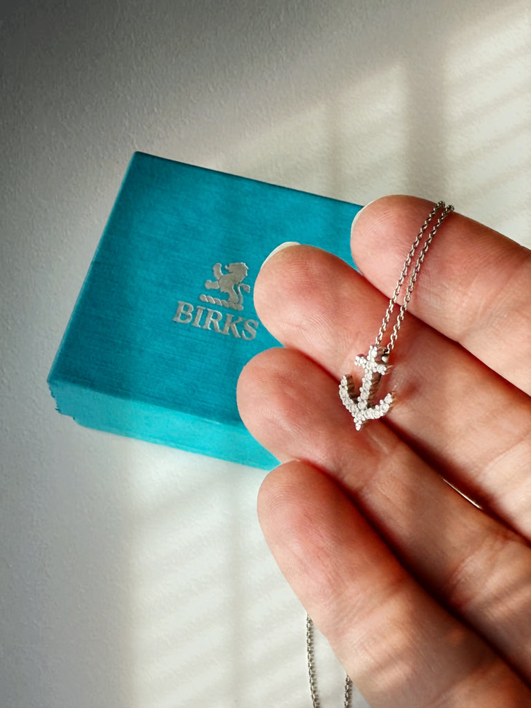 Step into refined sophistication with this exquisite piece from the renowned Italian jewellery house Roberto Coin for Birks.  A signature 18k and diamond pendant from the Tiny Treasures collection, on a 18k white gold 18” chain. This anchor motif piece captures both timeless elegance and playful charm.
